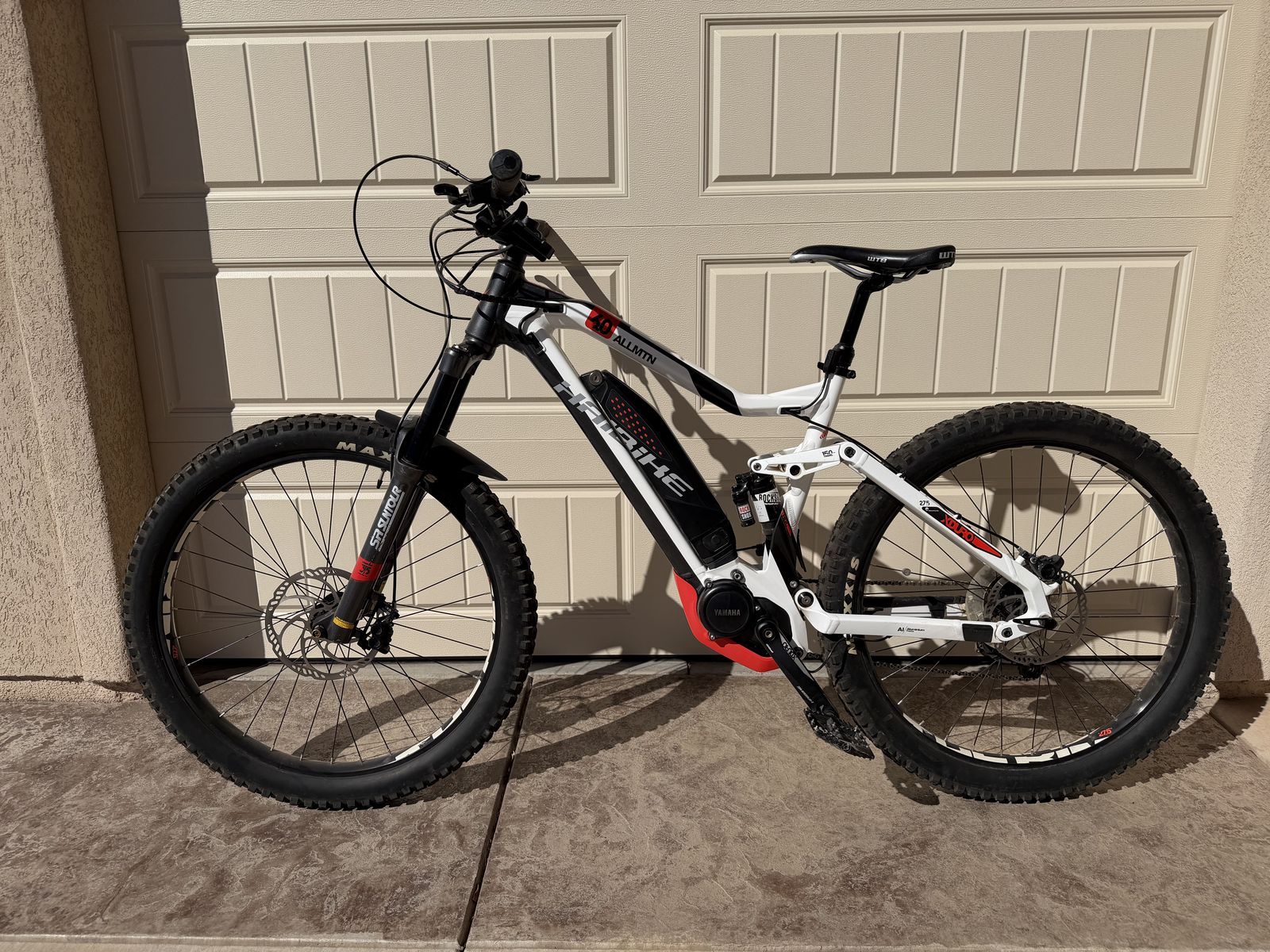 Haibike SDURO AllMtn 4.0 full-suspension electric mountain bike with Yamaha mid-drive motor, dropper seat post, tubeless tires and integrated battery. High-quality German e-MTB originally around $4,500 new. Smooth and powerful climbing with great trail capability. Includes charger.