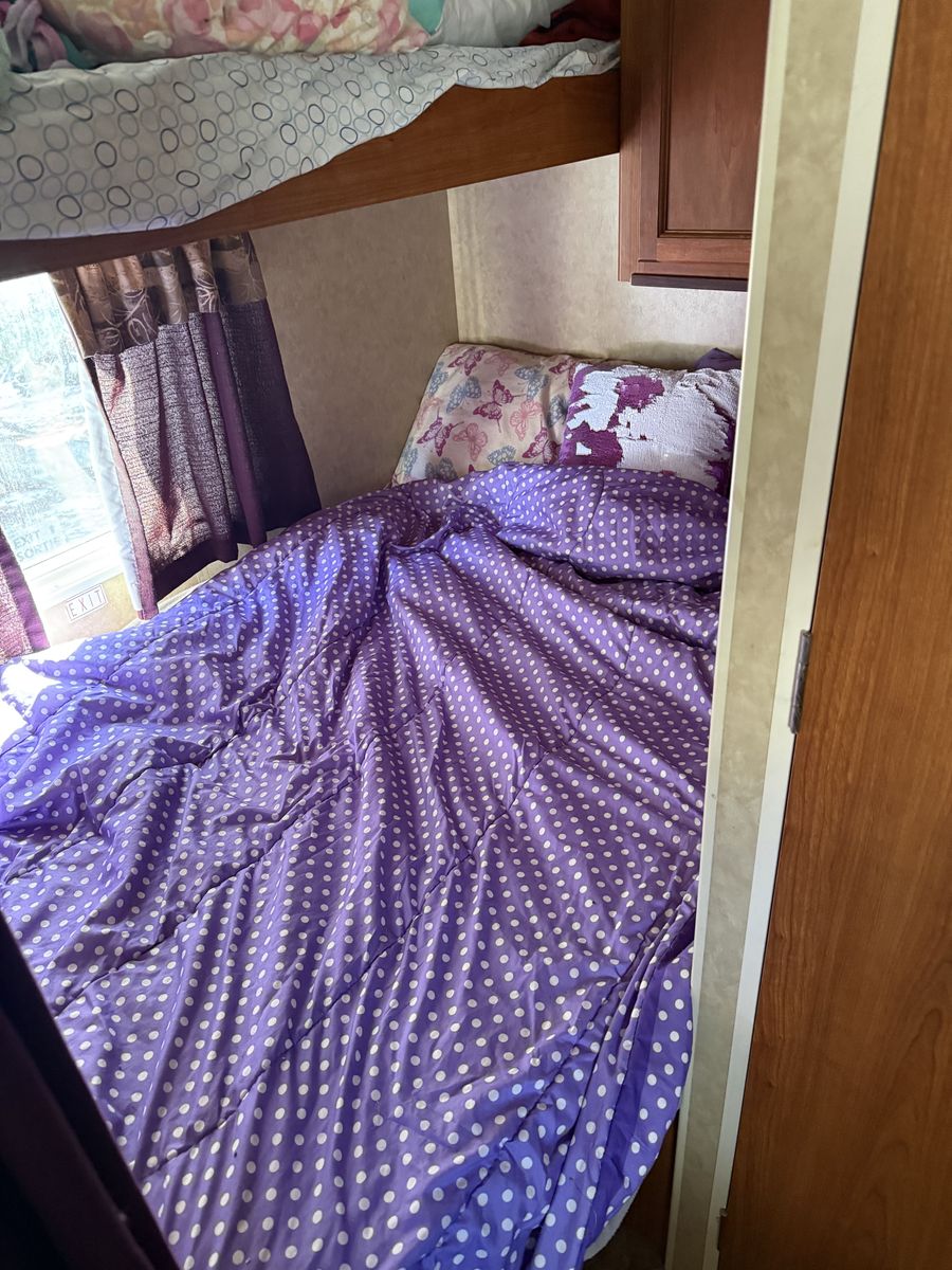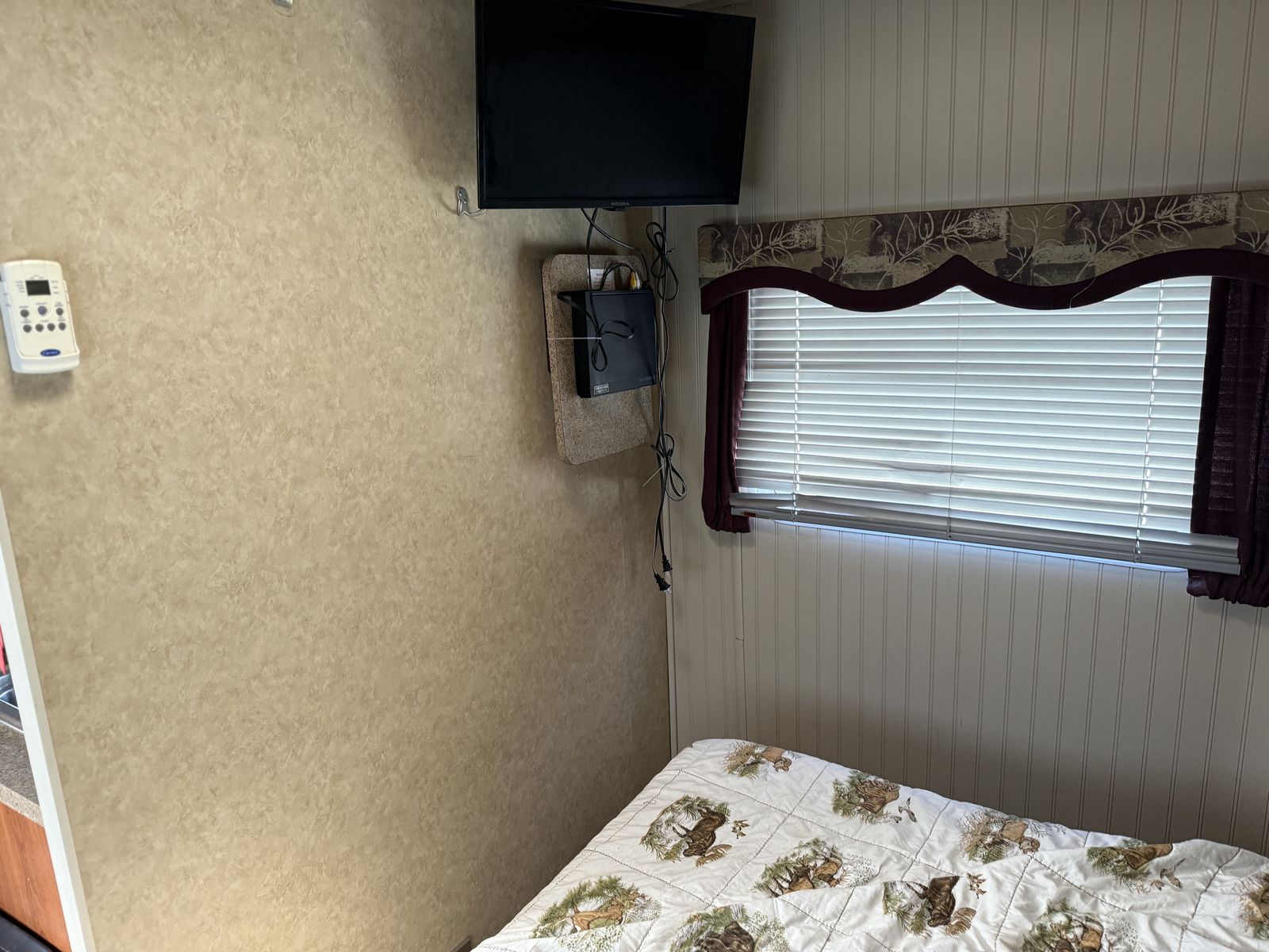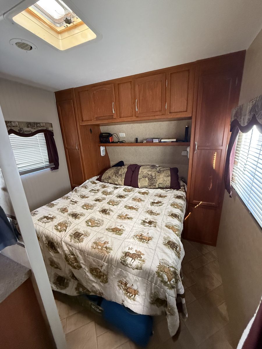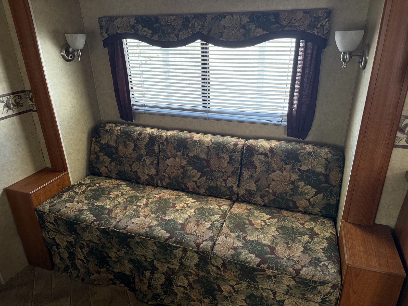 Great trailer, we have loved it! Front queen master bedroom, rear bunkhouse. Lower bunk is a double, upper bunk single. Couch and dinnette can also convert to beds. All appliances work correctly. Booth style dinette, couch in slide across from dinette. 3 burner range and microwave, Elec/LP fridge/freezer combo. Elec/LP hot water heater, 45 gal freshwater tank, tub/shower with skylight, 2 top air vents, 30 Amp service, dual batteries, 2 small tv's, 16' awning, front pass through storage, storage under queen bed, and storage under double bunk accessible from exterior, weight distribution hitch included, new axles and tires 2 years ago, new queen 8” memory foam mattress 2 years ago, 5350 dry weight, 800 lb hitch weight.