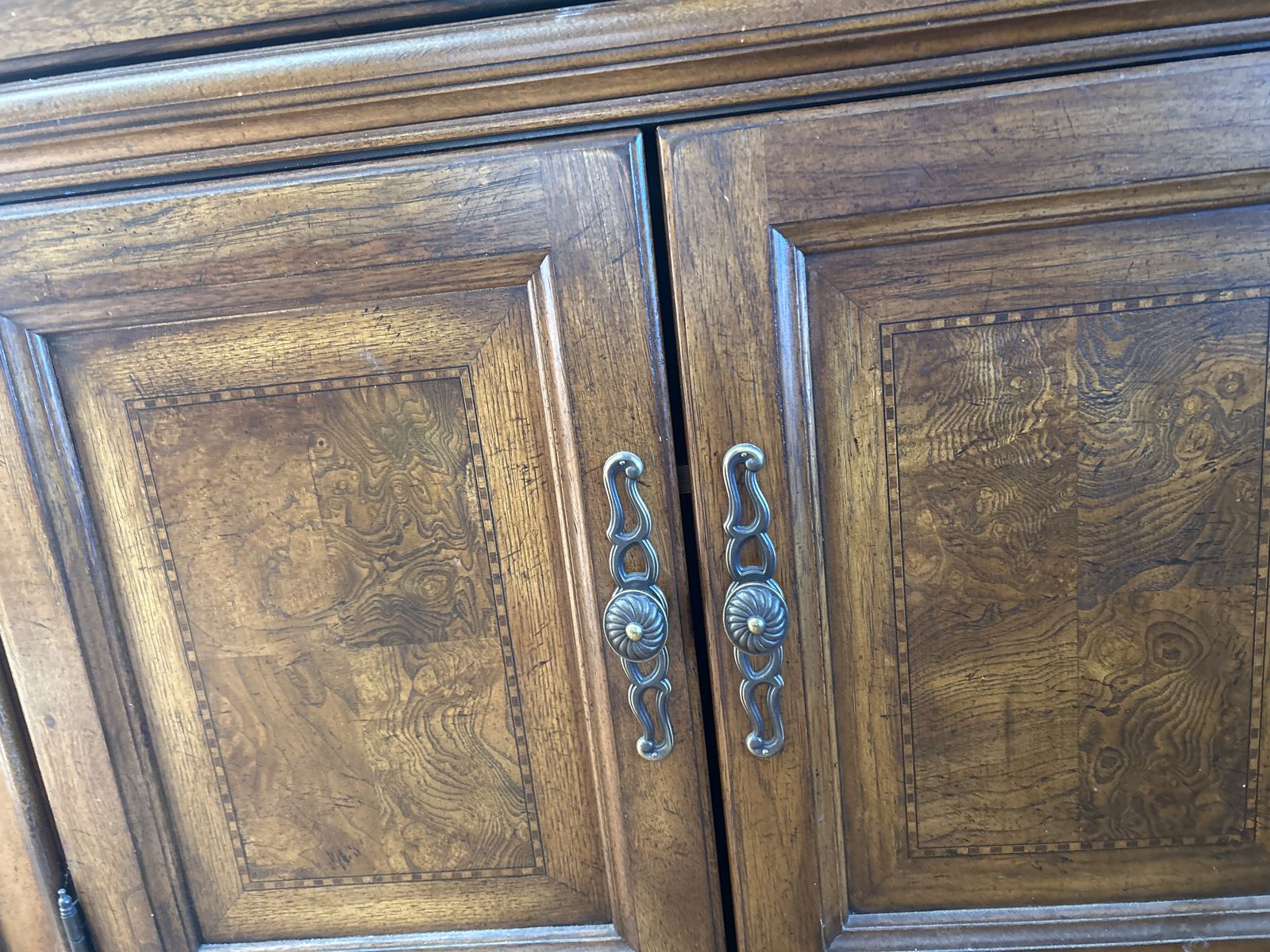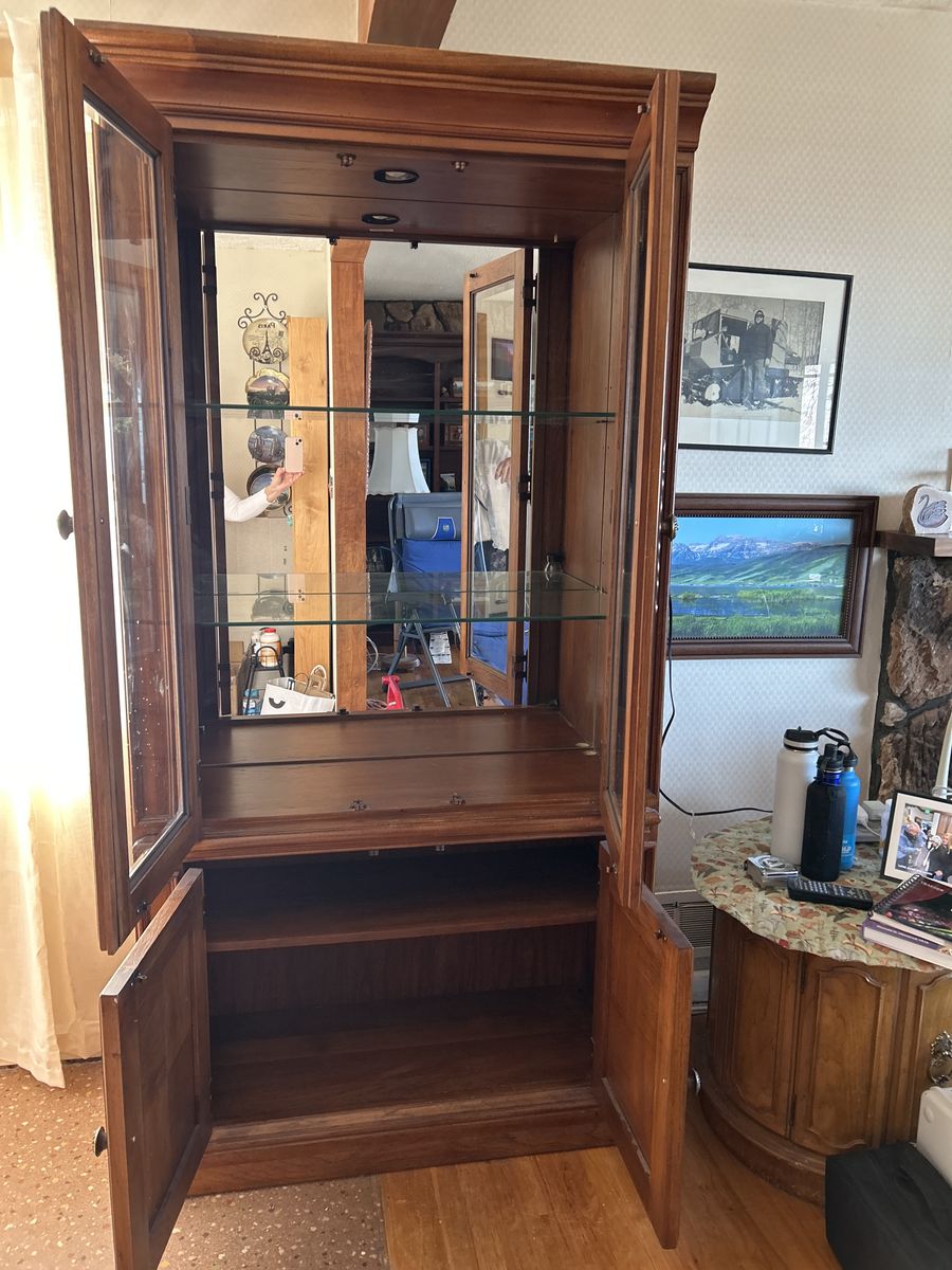ApplePayUpper cabinet2 glass shelves Lower cabinet 2 wood shelves 39.5” wide x 80” tall x 17.5” deep at top. Wood and wood veneers Light in top. Mirror backing Adjustable shelves Located in Millcreek, Salt Lake County