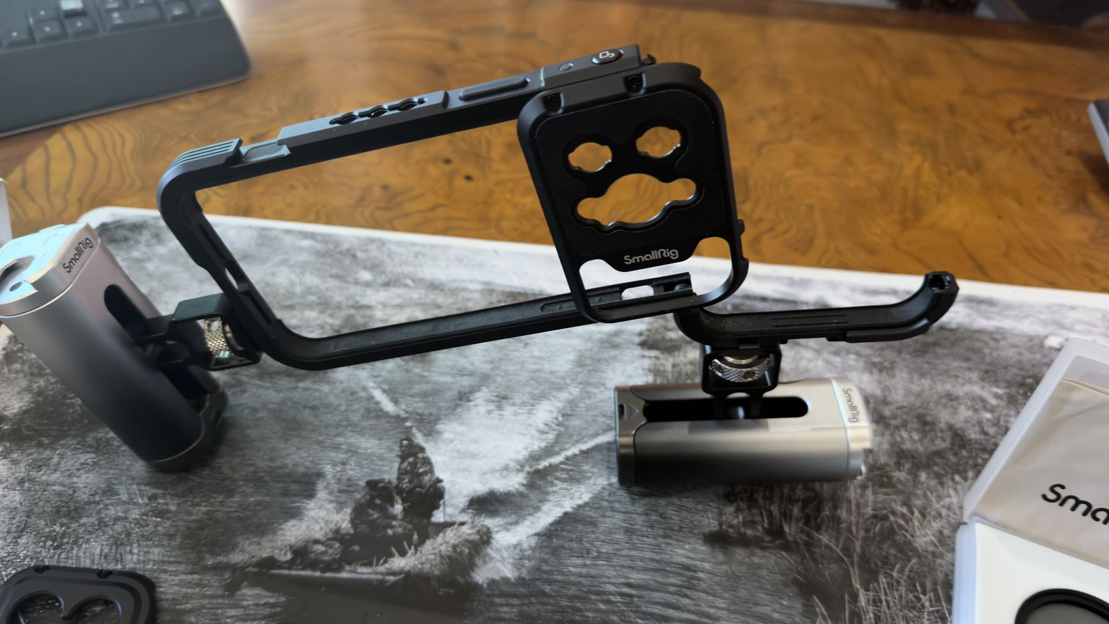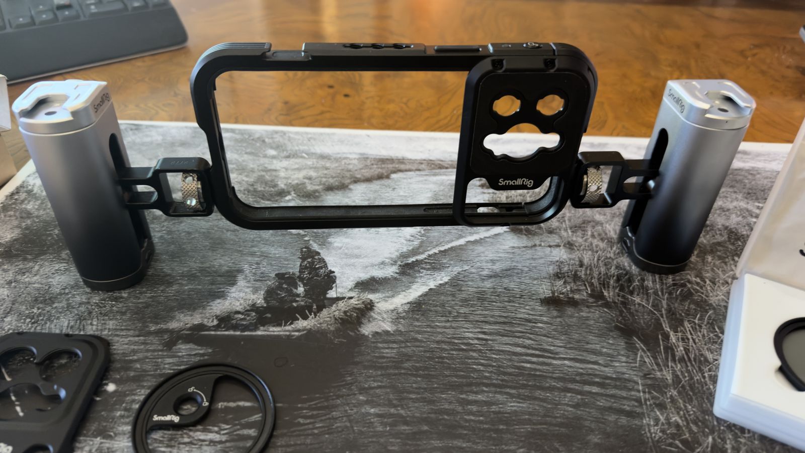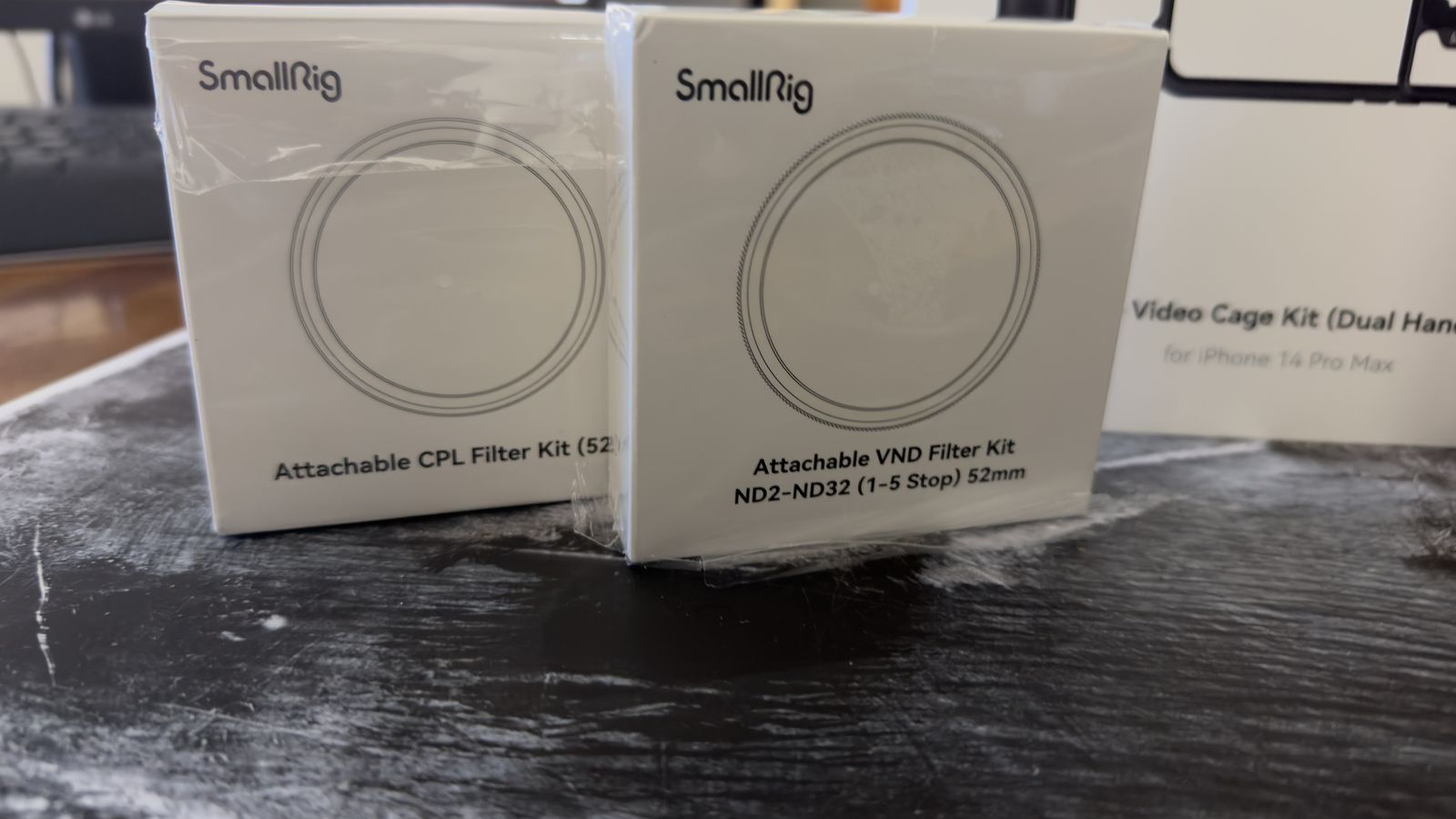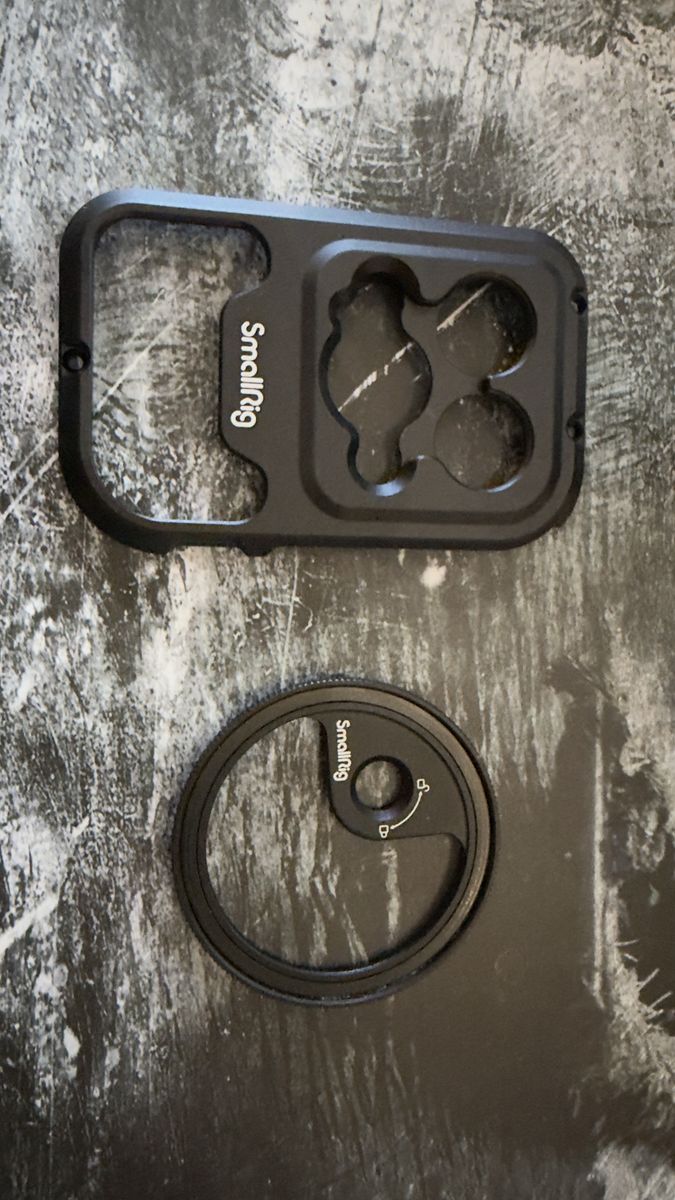 ApplePayComplete film rig cage that fits 14 promax iphones, may fit 15 and 16 as well. This kit includes the cage, handles / with start, stop and shutter controls. Magnetic filter tray with both ND and Polorizing filters.