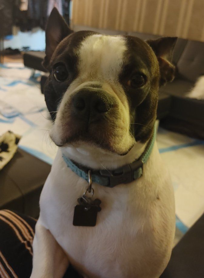 He is AKC/CKC registered brindle and white Boston Terrier that is almost 7 years old. He weighs about 27lbs.