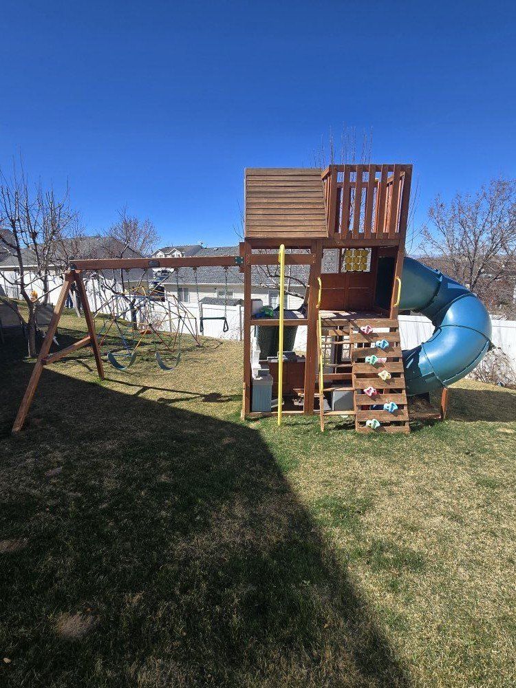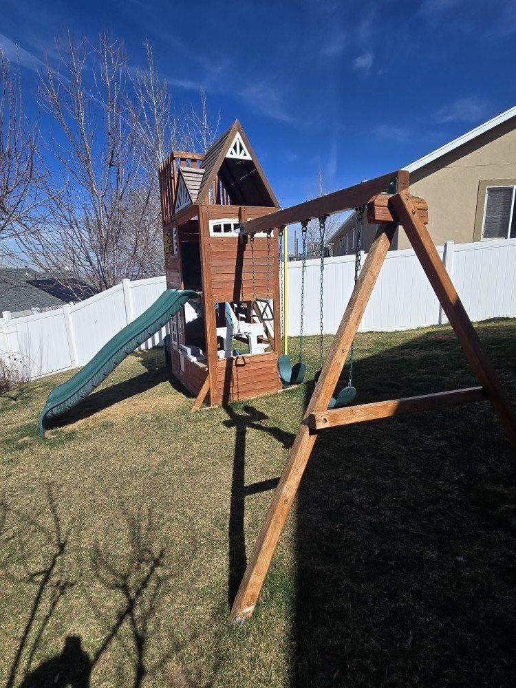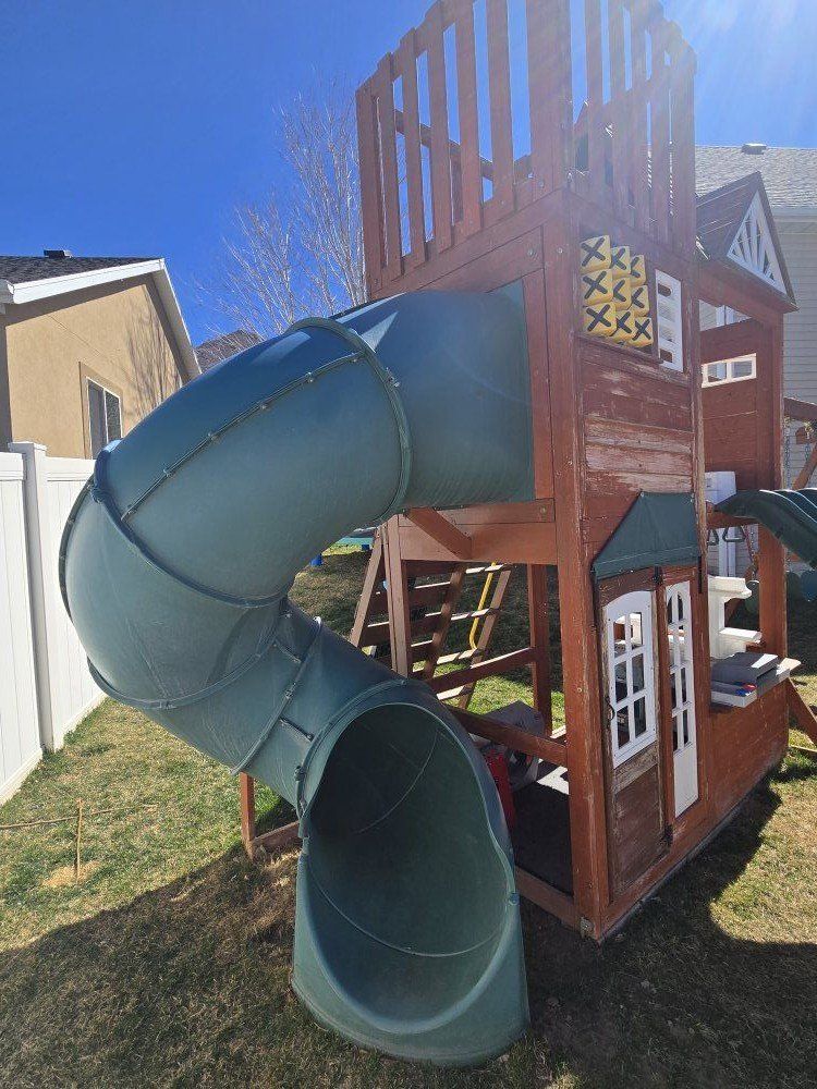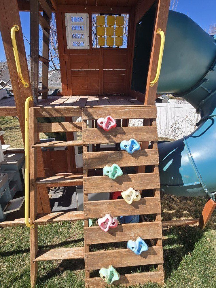 Wooden playground with double slide and curly slide 2 levels and a loft. 2 sitting swings and a ring/bar swing. rock climbing wall and ladder, fireman pole. you'll need to take it apart ( we'll help), and remove. $250.00 OBO.