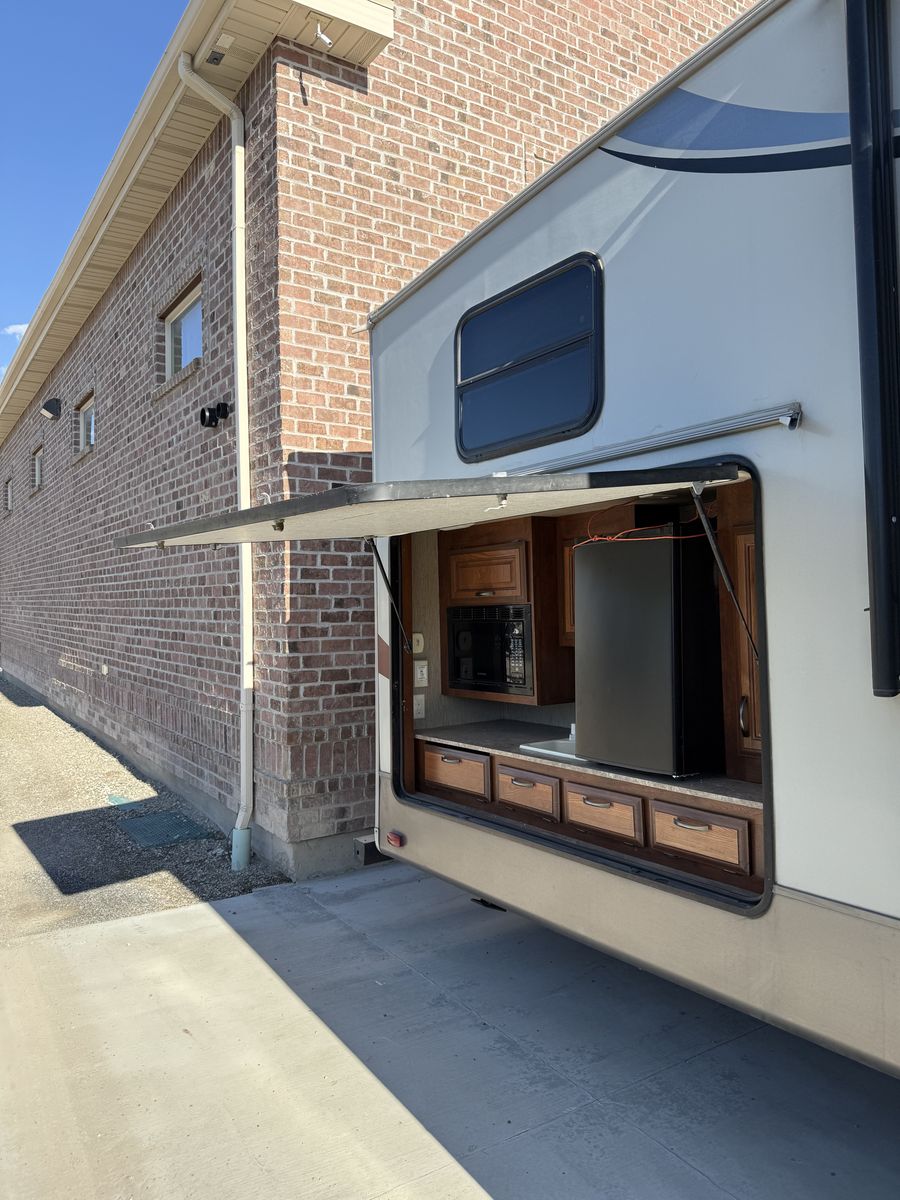 This one does have a second mini kitchen that is on the exterior and a bike rack. We have had zero issues with it. We are just wanting to maybe get something that self levels.