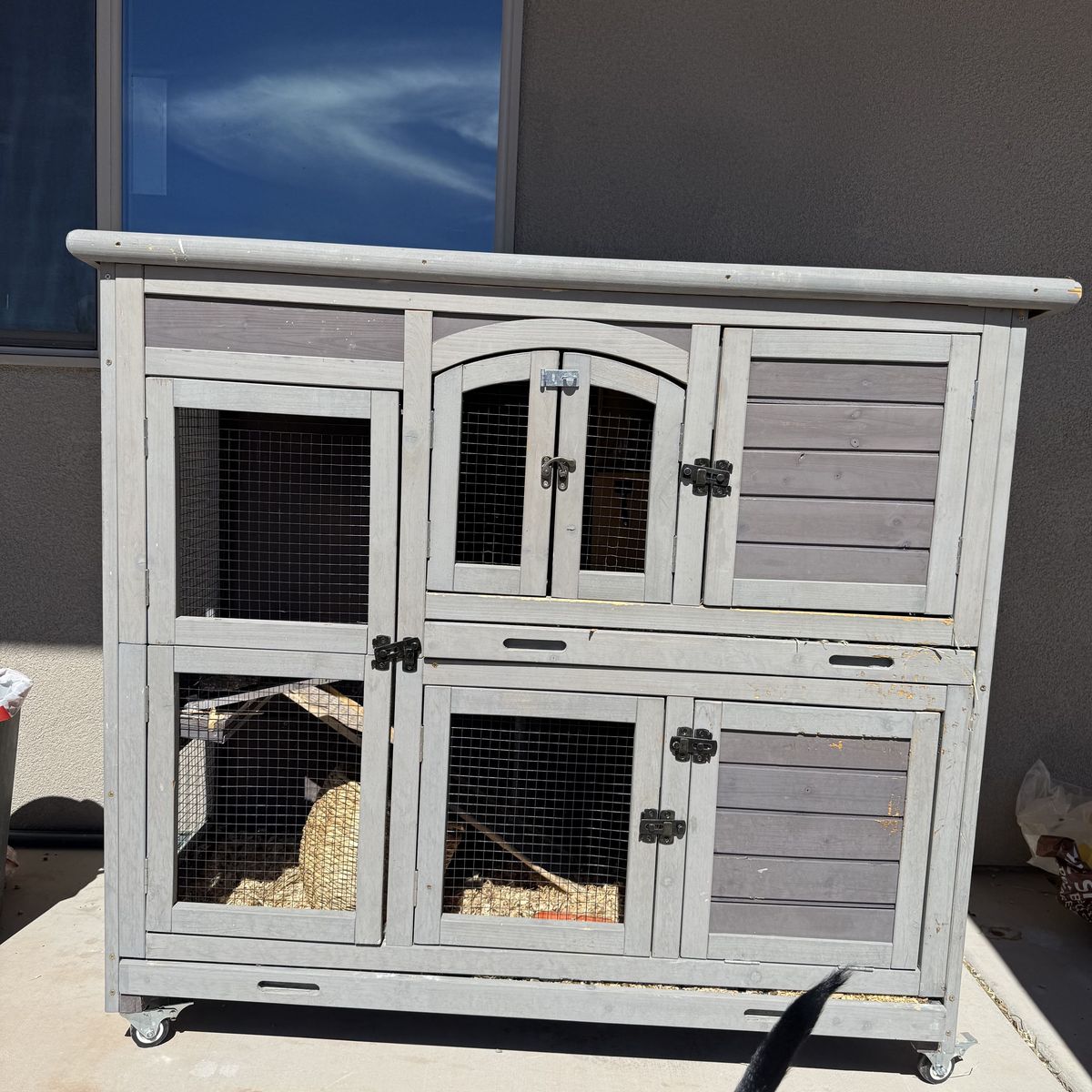 I have an outdoor hutch, I can include for an extra $25, otherwise the rehoming fee includes all her supplies, including really nice fleece flooring blankets, water bottles, carrier, a huge bag of oxbow pellets, leash, hides and anything else I can find. Pick up in Hurricane/St George Area.