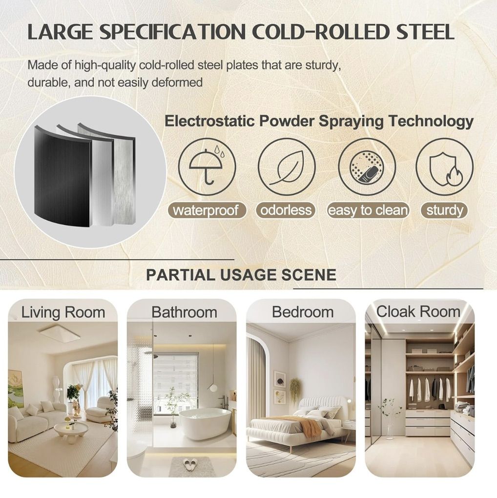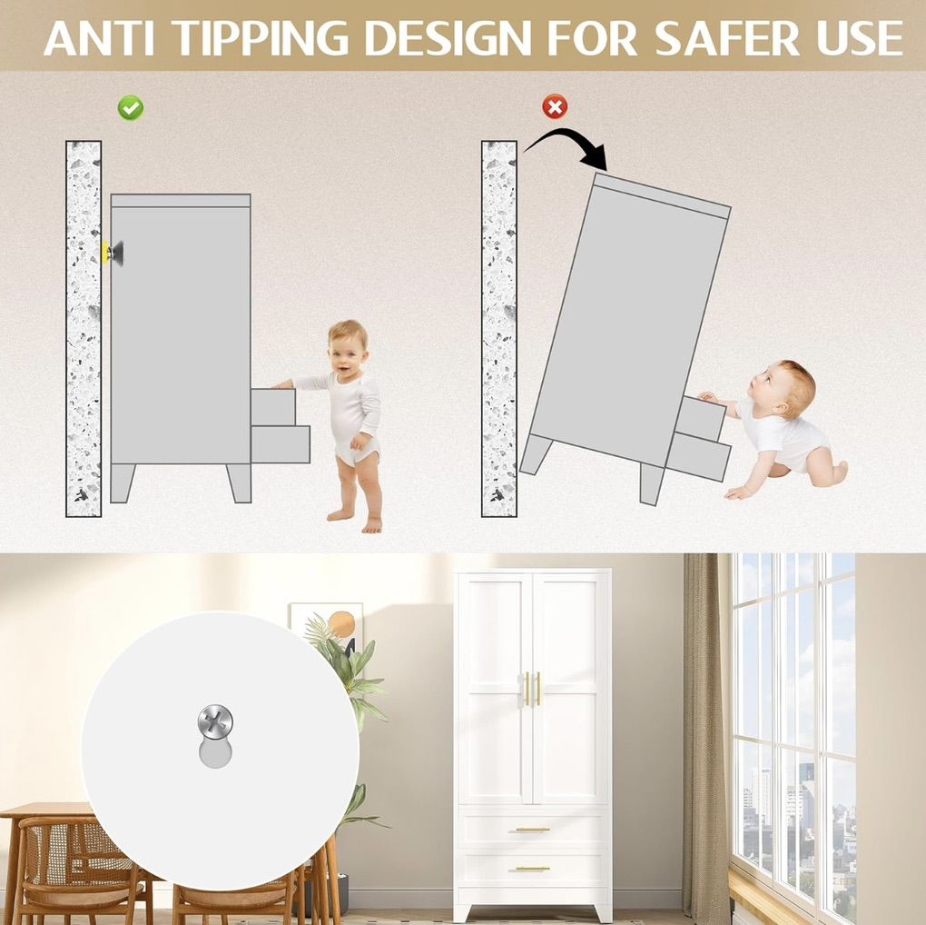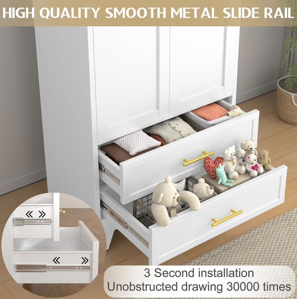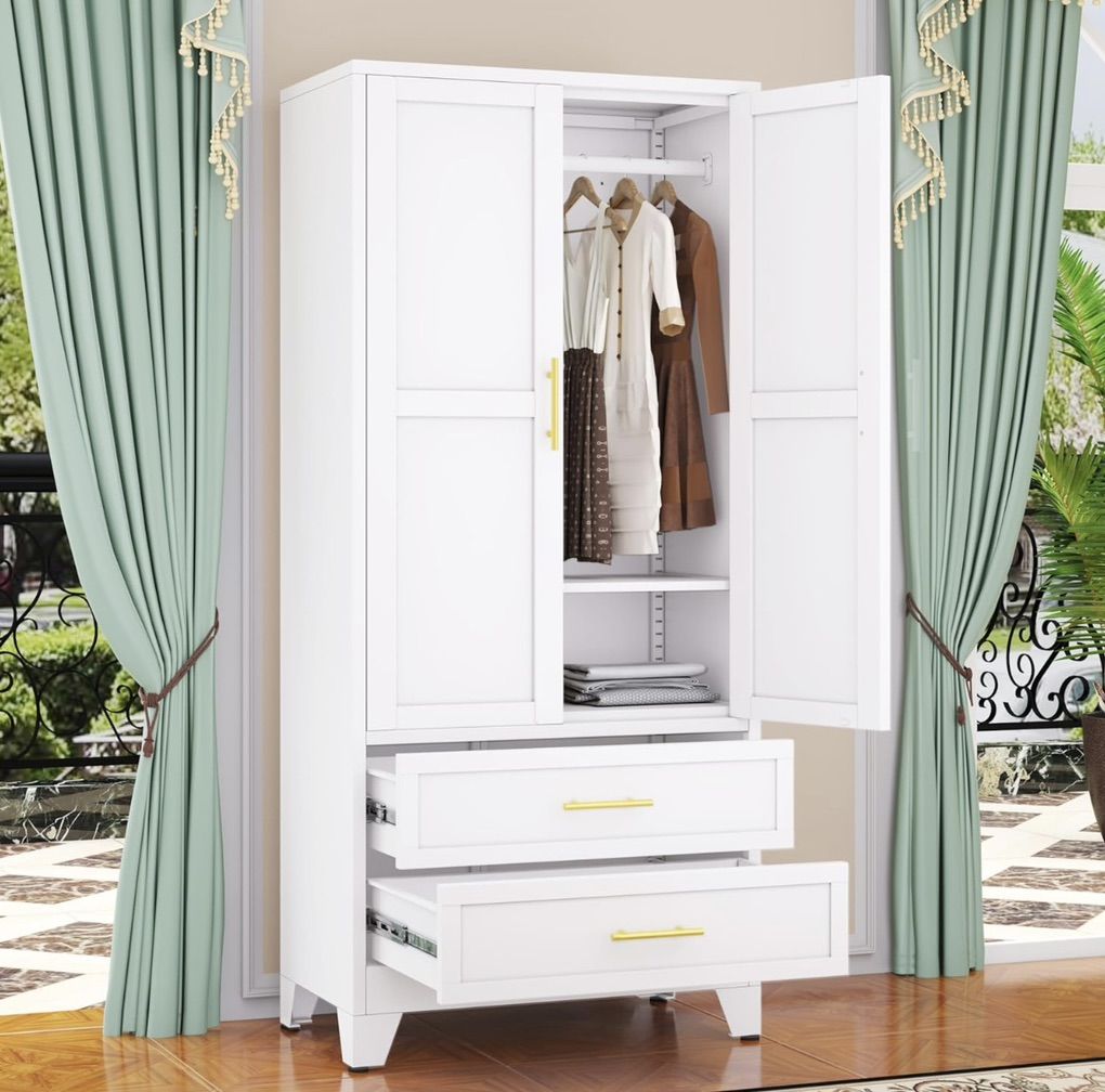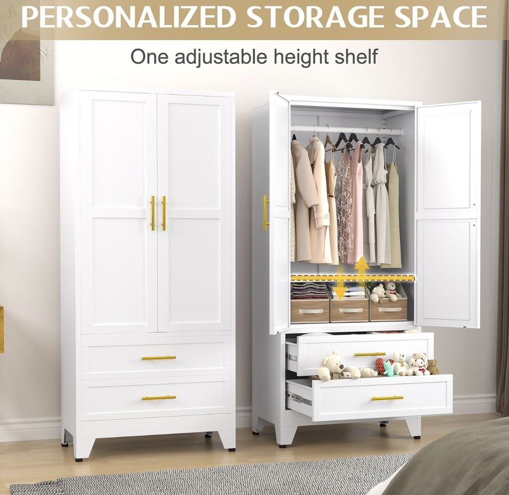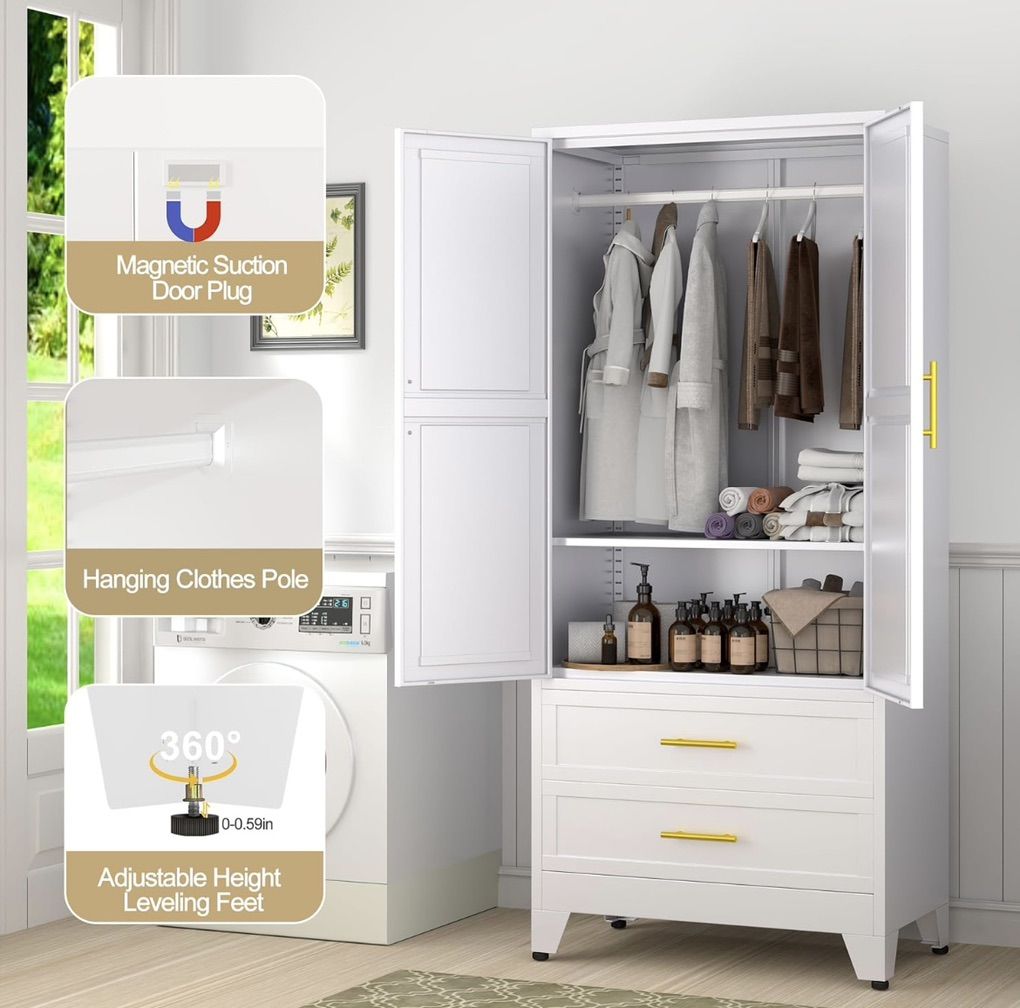 Remains stable on uneven floors with adjustable feet Summarized from product information Rufus AI High-quality MaterialThe tall metal wardrobe cabinet is made of large-sized thickened cold-rolled steel plates, each shelf can withstand a weight of 180 LBS, and the reinforced structure makes the tall steel cabinet more sturdy and durable. The freestanding wardrobe adopts electrostatic powder spraying technology, which is scratch resistant, wear-resistant, and easy to clean Large Capacity Wardrobe71 H×31.5 W×17.71 D. Our large metal storage cabinet adopts larger, higher dimensions, and a reasonable design, aiming to not waste every inch of space and meet your large number of storage needs. The multifunctional metal storage cabinet adopts a partition design, mainly including storage area, hanging rod area, drawer storage area, improving storage flexibility and meeting your unique partition storage needs Diversified StorageThe hanging rod of the wardrobe storage cabinet provides a hanging space, which is very suitable for storing longer items such as dresses, suits, pants, etc. Adjustable shelf facilitate the storage of large items. Two drawers can store small items such as underwear, socks, toys, etc. ensuring privacy Other DesignEach door of the metal locker storage cabinet has 2 strong magnets to ensure a tight closure. 4 adjustable height balancing feet can keep the cabinet stable even on uneven ground. The high wardrobe cabinet adopts an anti tipping design, with two reserved holes on the back for installing the standing wardrobe on the wall, preventing it from tilting forward due to heavy objects or strong dragging, protecting your and your family's safety MultipurposeMetal wardrobes and storage cabinets are perfect for various environments and are an ideal choice for home offices, bedrooms, changing rooms, laundry rooms, bathrooms, garages, shops, warehouses, and more. You can use it as a living room wardrobe, bedroom wardrobe, office wardrobe, dressing room storage cabinet, file storage cabinet, laundry room storage cabinet, etc. Of course, you can also use it for any place you want to place it in the basement, study, etc Installation and ServiceBedroom storage cabinet are detachable structures that require assembly. The 2 door wardrobe with drawers comes with installation instructions to help you complete the installation faster. Please make sure to receive all accessories before installation. If you have any questions, pleas contact us at any time. The GAIOUS team is very willing to provide professional services within 24 hours