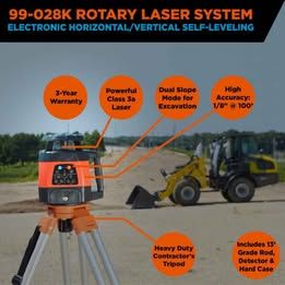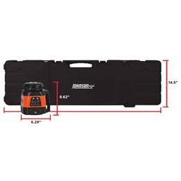 GooglePayProfessional Johnson 99-028K Rotary Laser System. This kit has everything you need for accurate leveling work. Includes the electronic horizontal/vertical self-leveling laser, heavy-duty contractor's tripod, 13-foot grade rod, detector, remote, and a hard case for transport. It's a powerful Class 3a laser with dual slope mode for excavation. High accuracy at 1/8 inch @ 100 feet. Laser unit is about 8.62 inches tall and 6.29 inches wide. The hard case is around 14.5 inches tall.