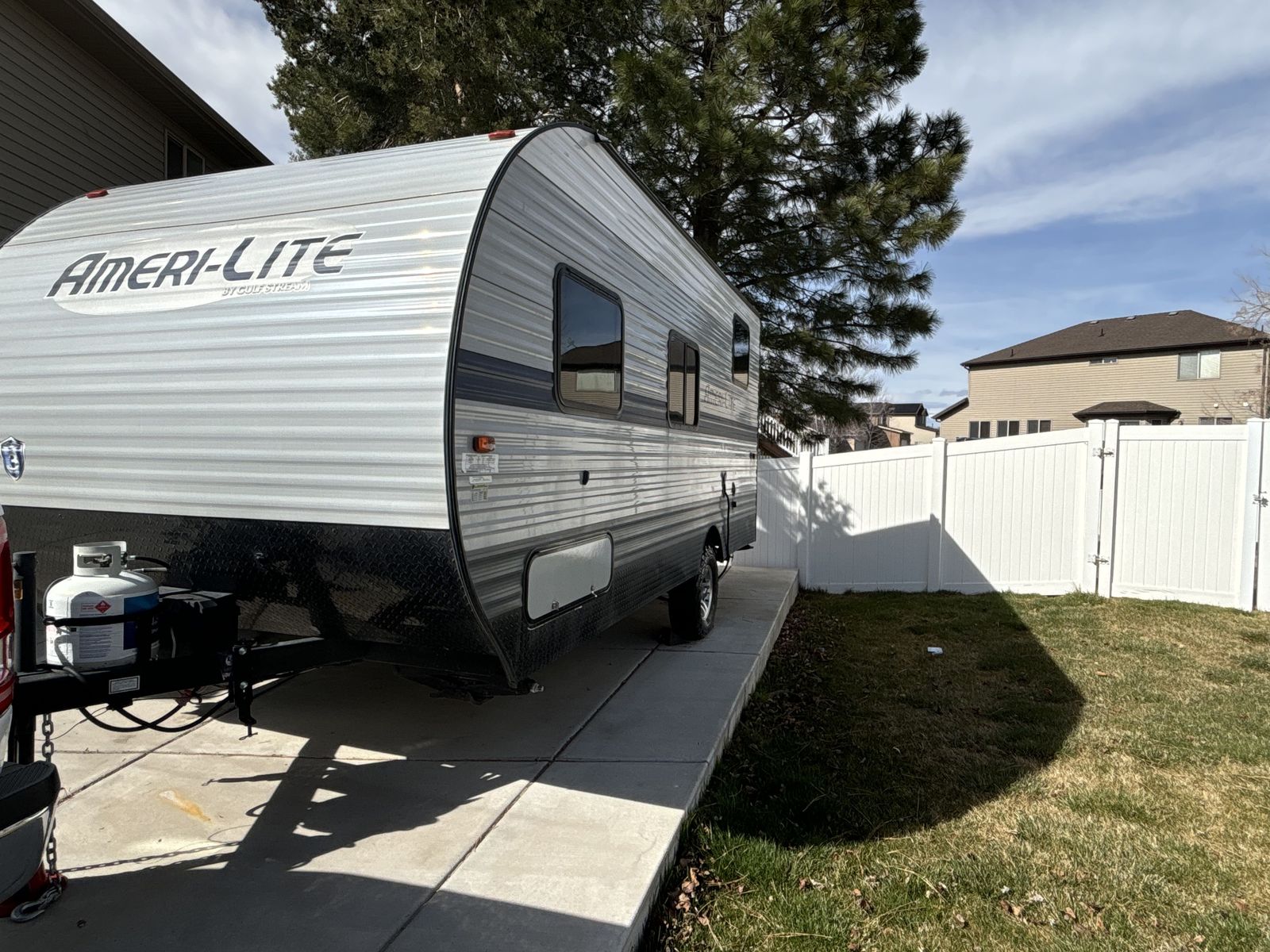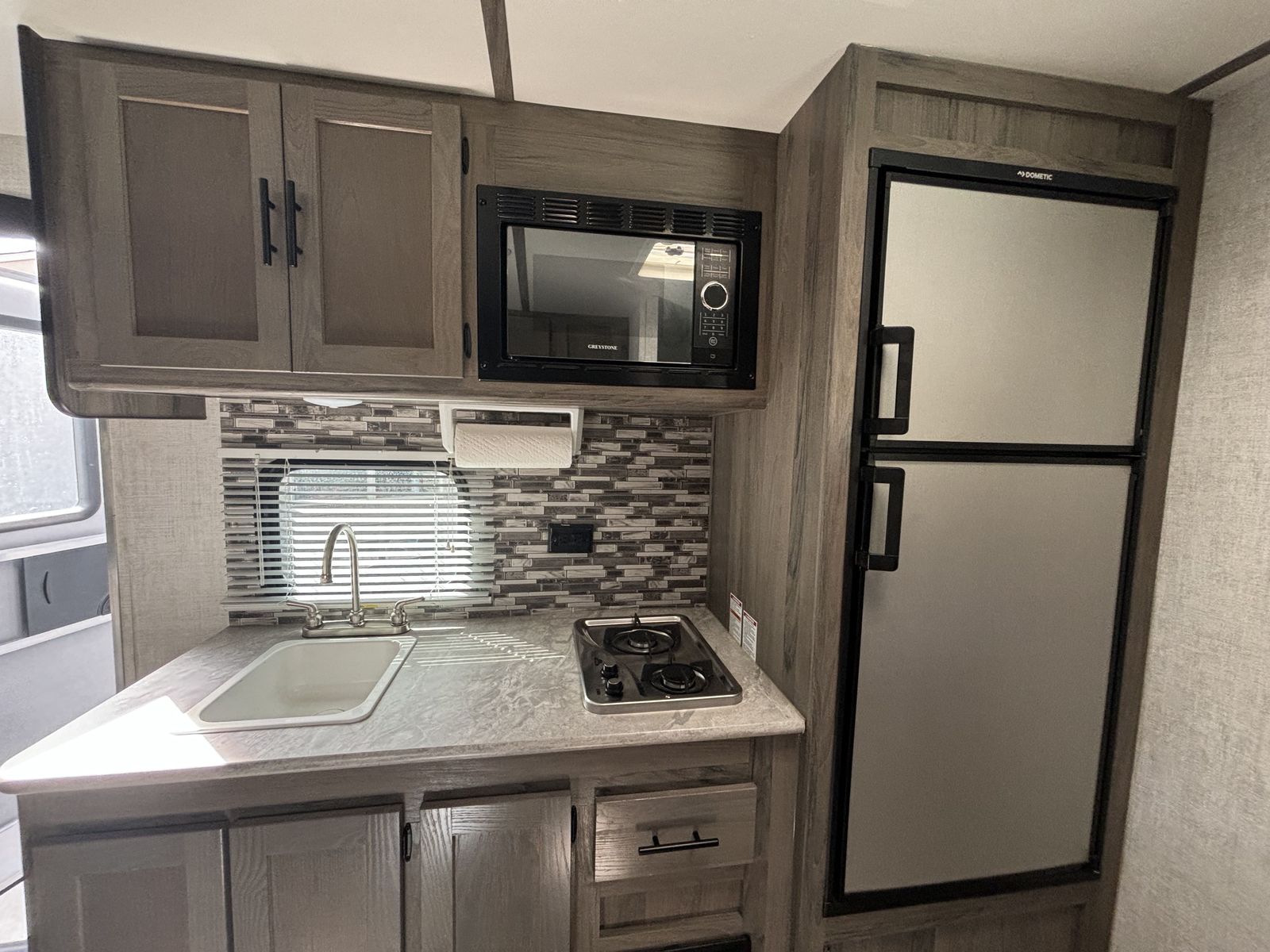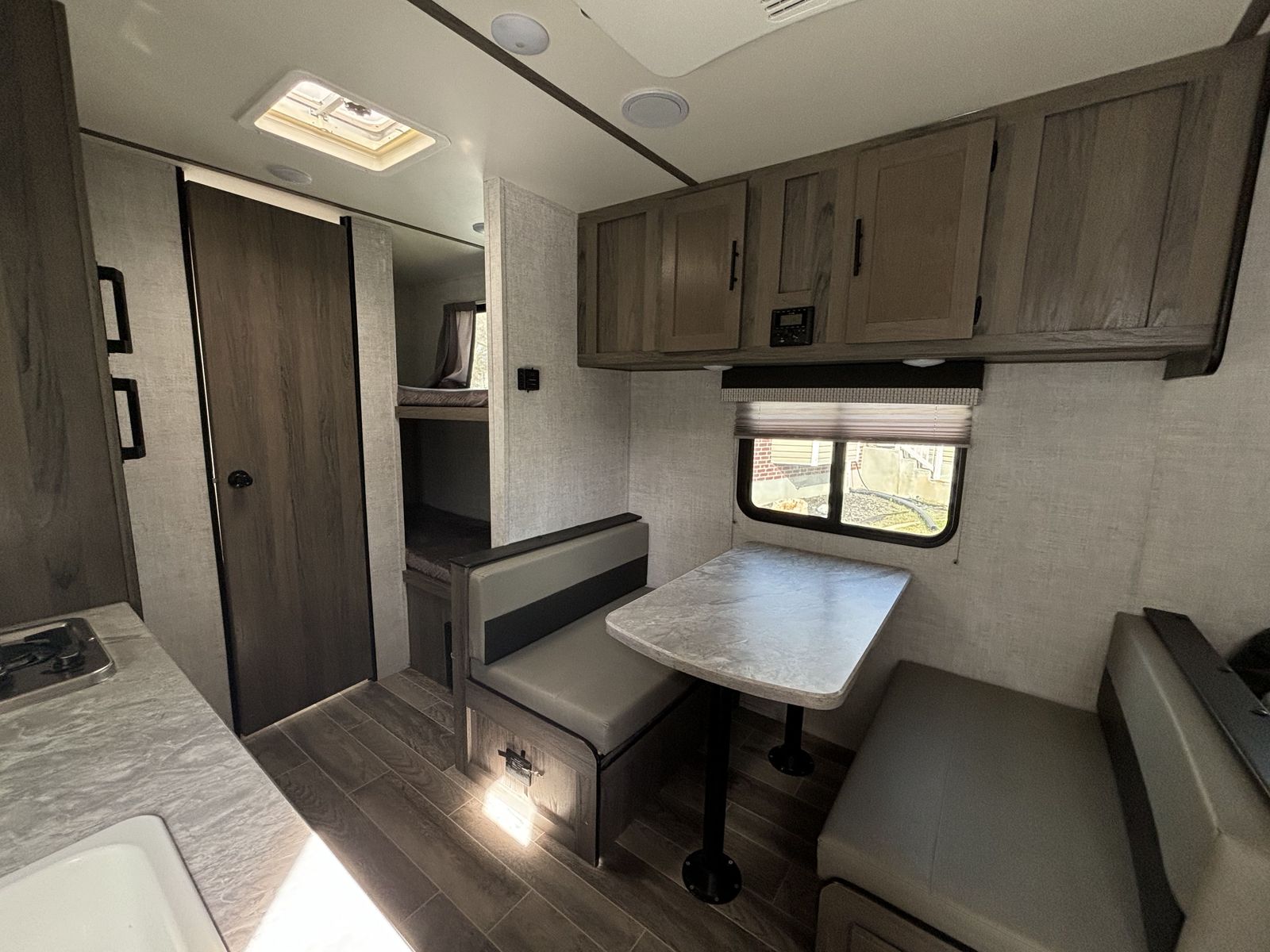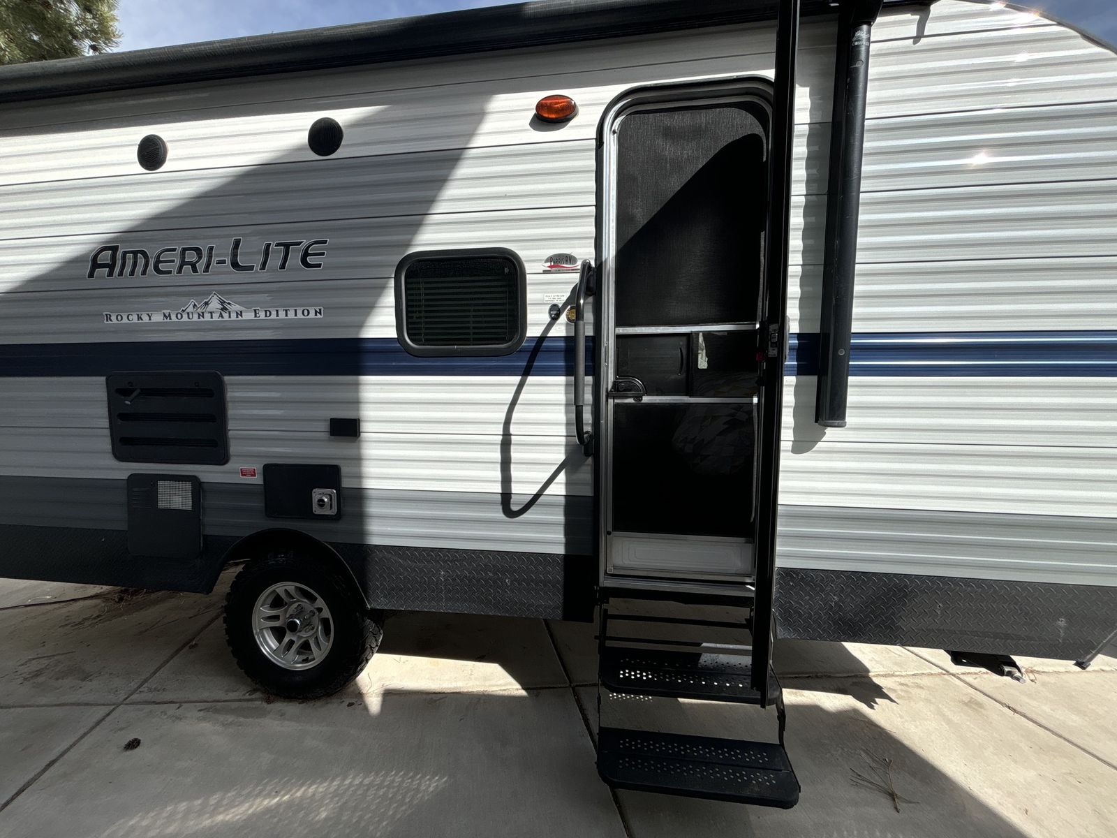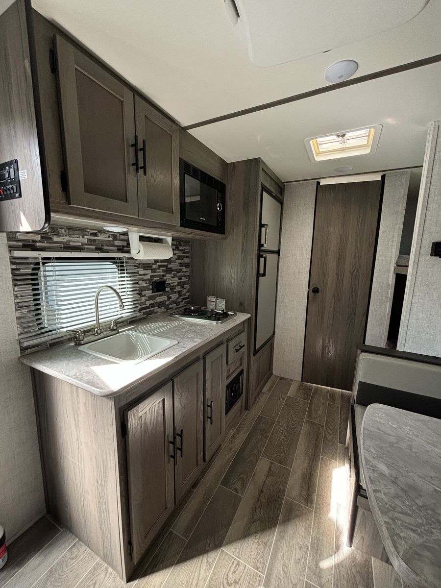 Twenty-foot travel trailer with camper queen-size bed, 2 bunks, and convertible dinette to sleep 5. The Rocky Mountain Edition provides a more offroad-ready setup with higher clearance and more aggressive tires. All systems in the trailer are fully functional and all features are in great shape, including: