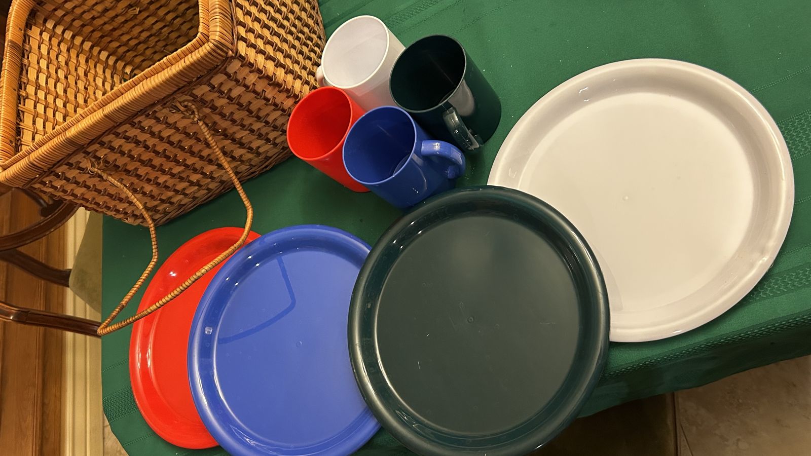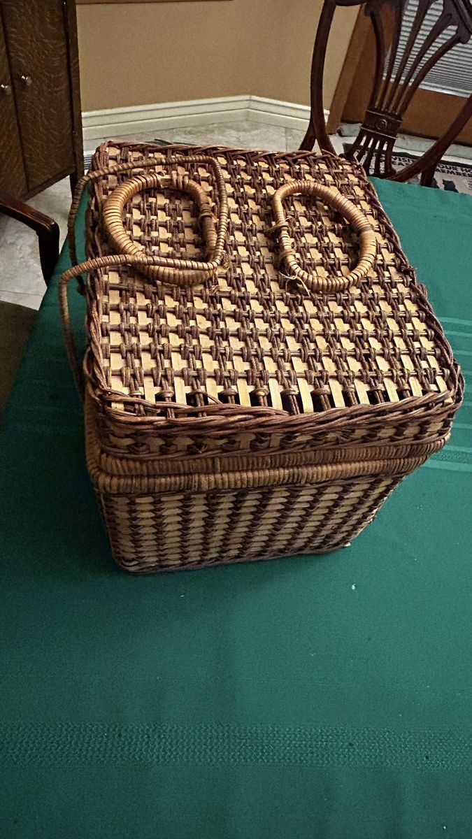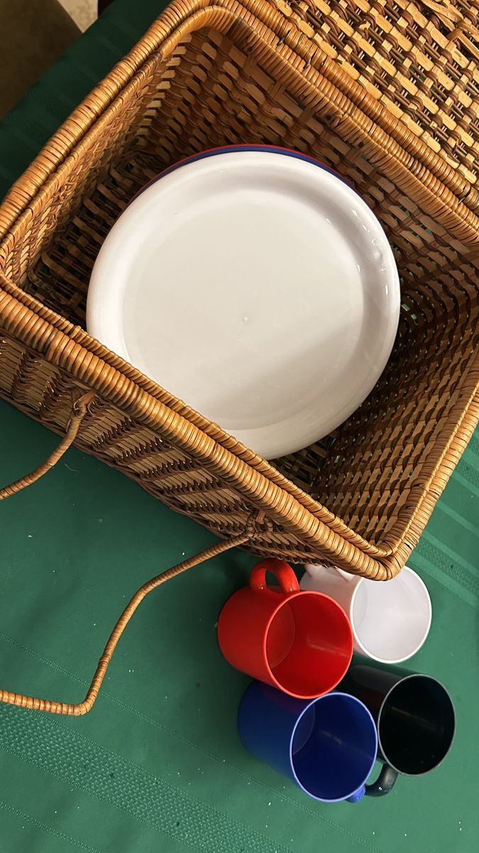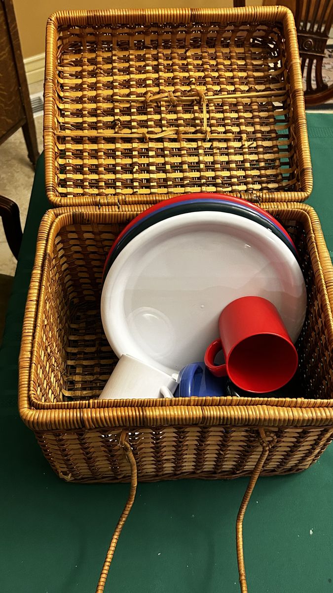 This is an awesome wicker picnic basket ready to go! Includes 4 plastic cups and 4 plastic plates. Cash at pick up in Highland.