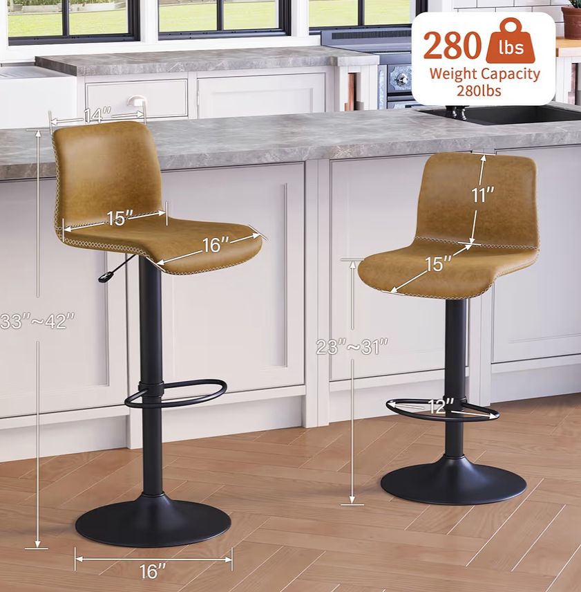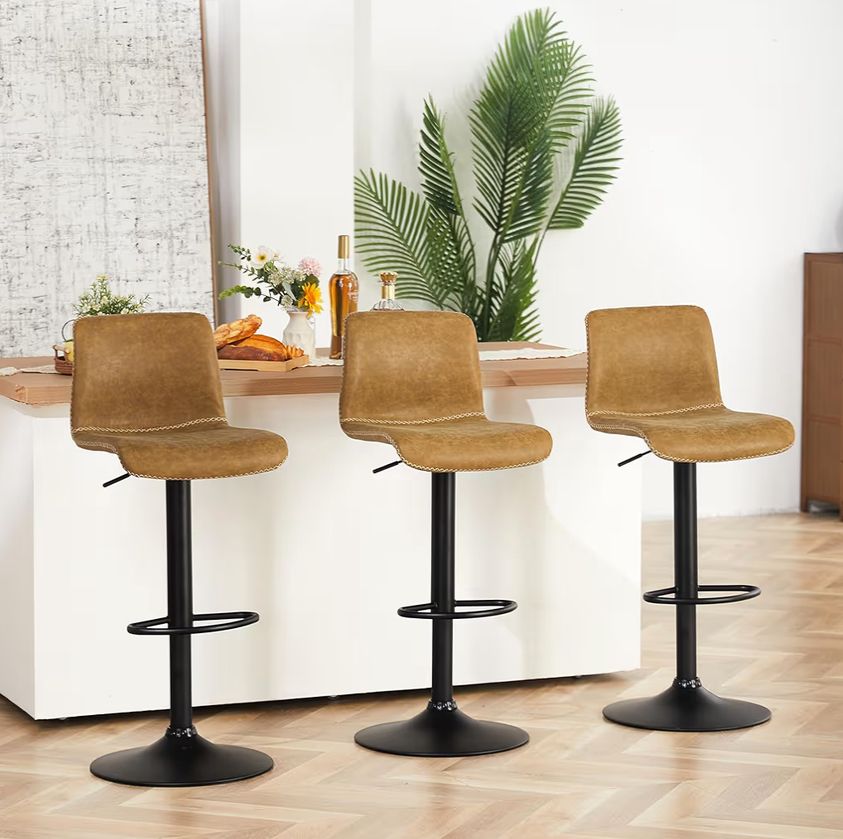 Elevate Your Space with Style & ComfortIntroducing our whiskey brown barstools set of 3 with backrests, perfect for your kitchen table, home bar, living room or any gathering space. These tall stool chairs combine a modern, stylish design with unmatched durability, ensuring years of enjoyment in your home. Customizable Seating ExperienceWith adjustable height from 24 to 32, our swivel bar stools accommodate guests of all heights. The generous 15.7 wide seat of kitchen barstools with backs supports up to 280 lbs, while the 360° swivel feature provides full mobility. Lean back and relax with the built-in footrest for ultimate comfort. Built to Last & Easy to CleanConstructed with heavy-duty metal base and padded with faux leather cushions, our high chair for kitchen counter are designed for longevity. Bar stools for kitchen island prevent skidding and floor damage, while the easy-to-clean materials keep your counter height chair looking and feeling brand new. Simple Assembly & Versatile UseAssemble your new counter height bar stools in less than 10 minutes with our easy-to-follow instructions and included accessories. The elegant design and versatile functionality make these counter stools with backs perfect for various settings, including pubs, kitchen islands, dining rooms, counter top, and coffee shops. Ergonomic DesignThe ergonomic backrest and soft cushion provide excellent support, relieving back fatigue and ensuring lasting comfort. The safe gas lift rod and curved footrest offer stability, making these black bar stools an ideal seating choice for any space.