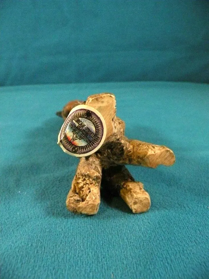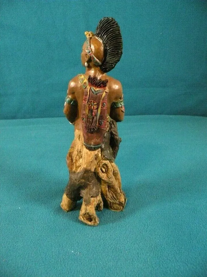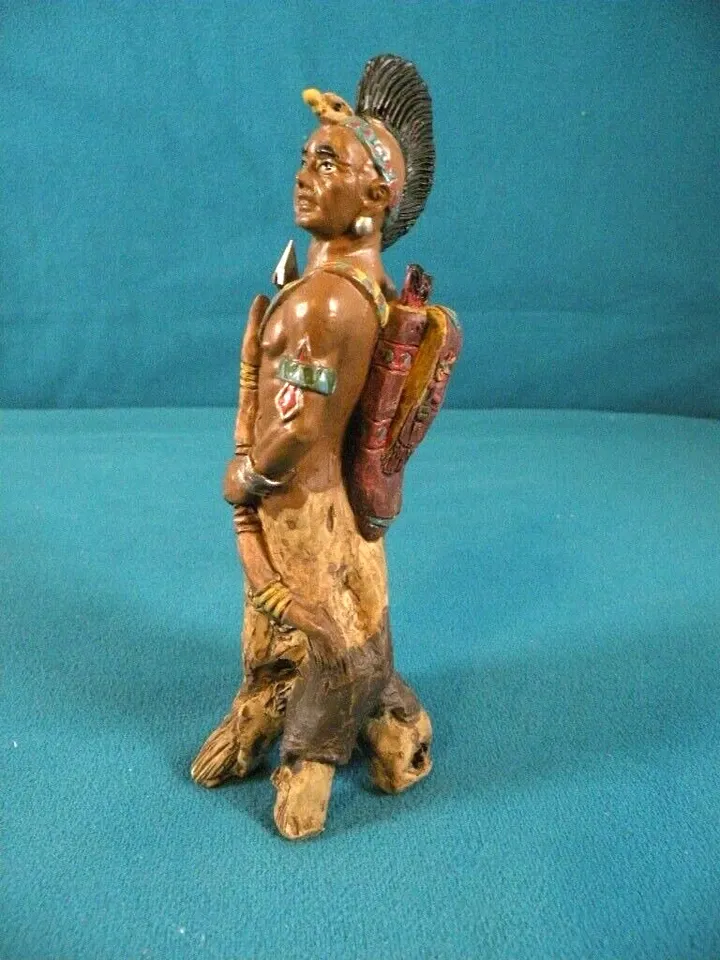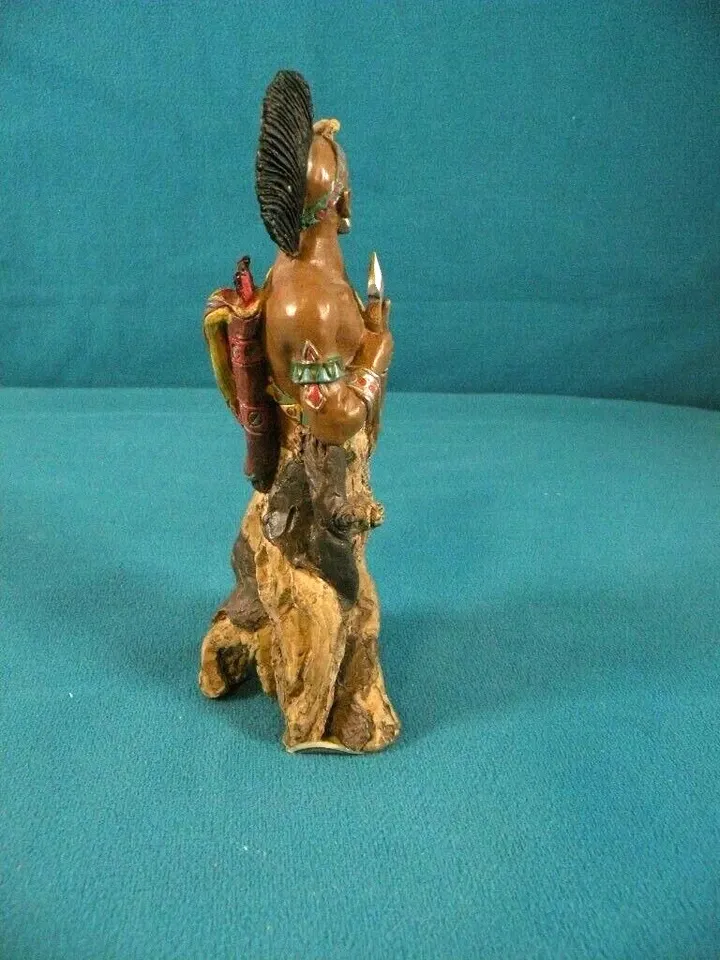 American Frontier Limited Edition Hand Painted Statue. 61/2 inches high. Hunter. bottom part is like a tree. Very unusual piece with intricate detailing. Holds bow and arrow in his hands. No chips. Part of Dads collection. a display piece. The tip of his headpiece chipped but it's been fixed. Looks like it did before. This is actually hand carved from wood to reveal the warrior spirit within the tree. If you are looking for a unique Native American statue then this is it.