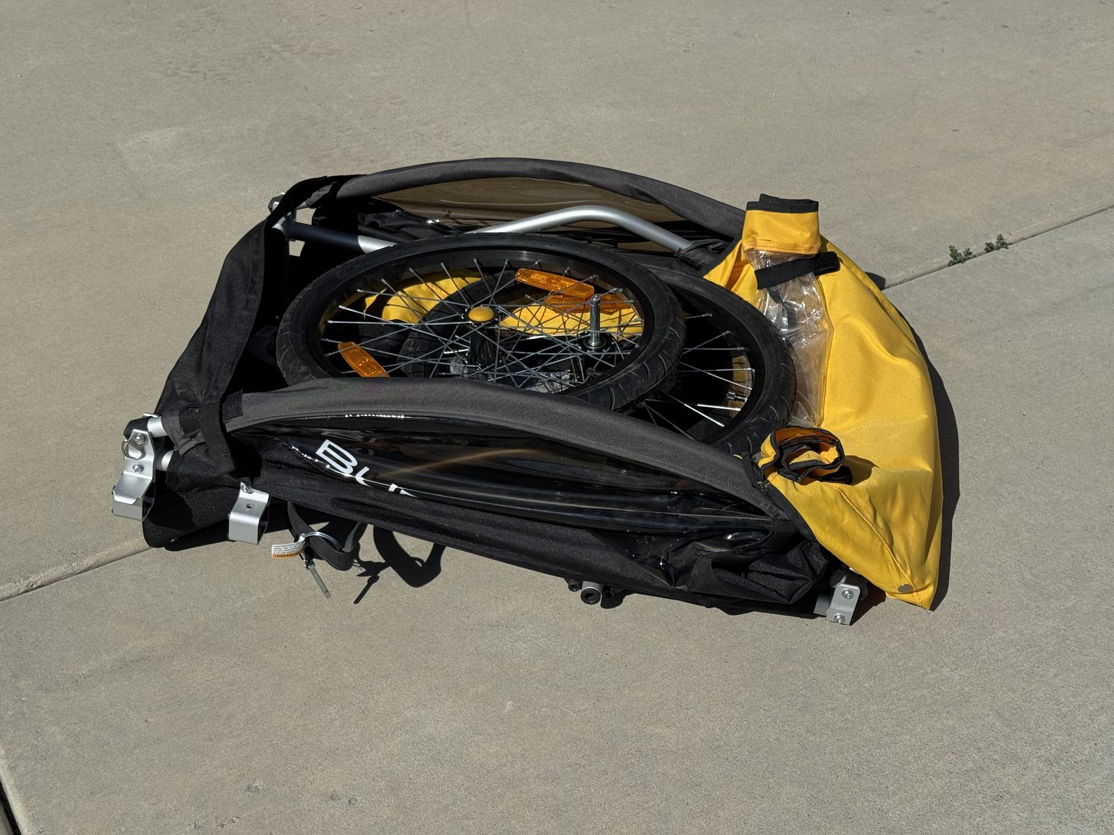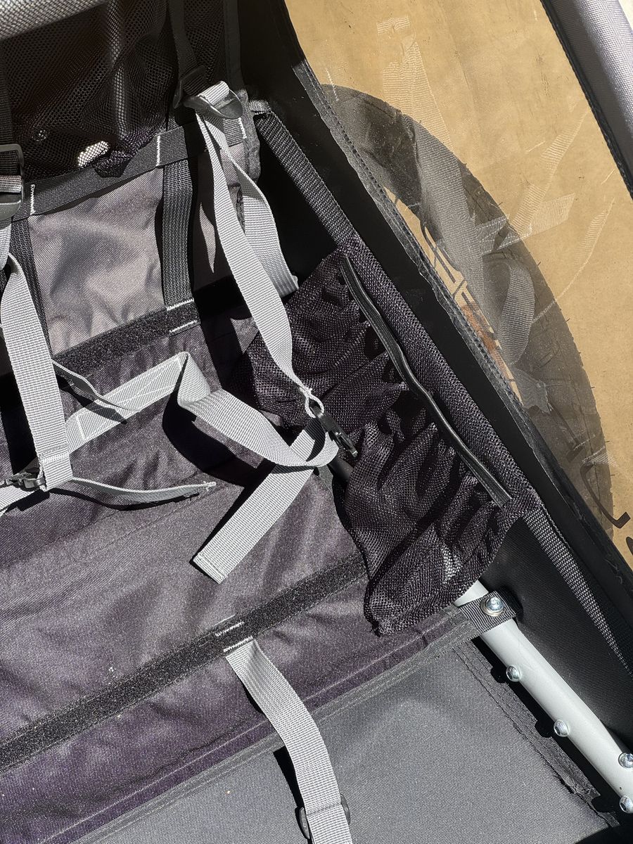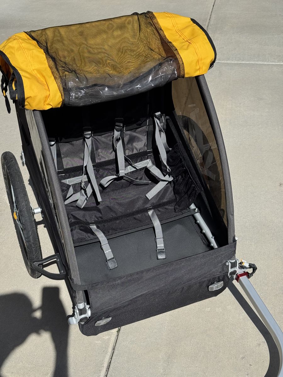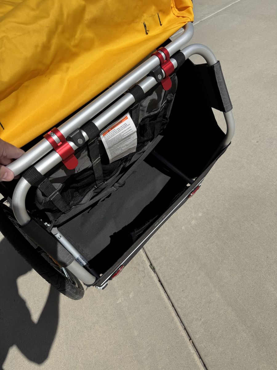 Foldable for easy storage with quick disconnect wheels. Room for two kids and some storage behind them. Front cover has a mesh screen to protect them and a rain cover if it’s wet outside. Inside each seat has two pouches next to it for snacks and drinks.