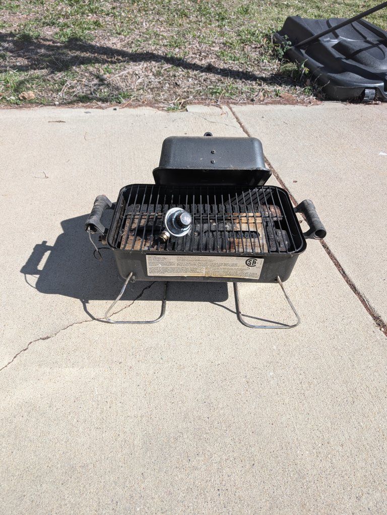 Free plastic shelf 76" tall 36" w. minimal signs of use. Free mini Propane grill. Used but functions. No longer need.