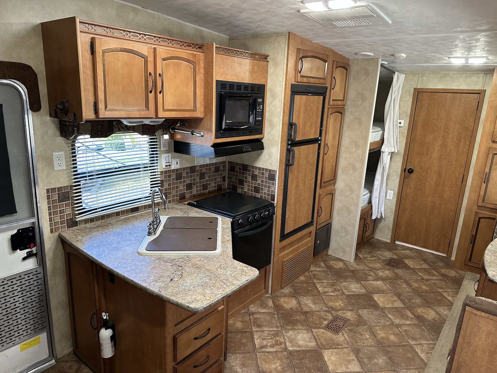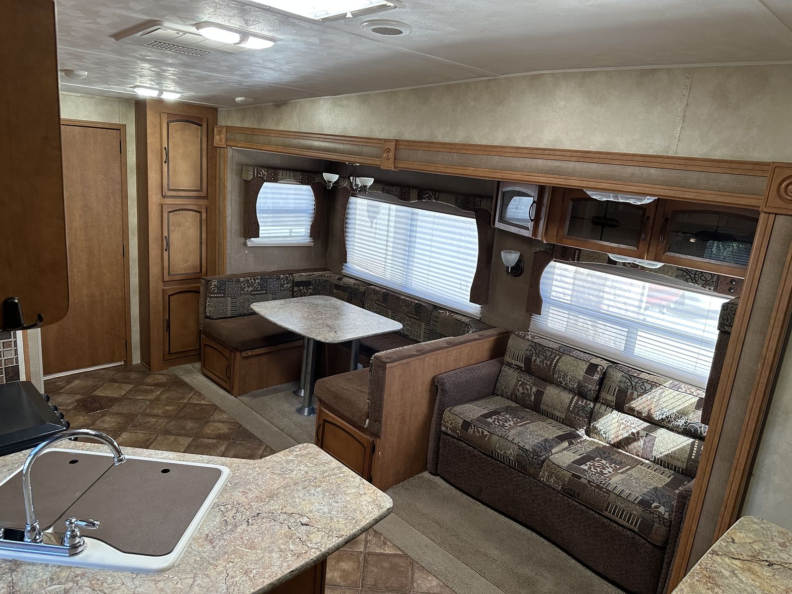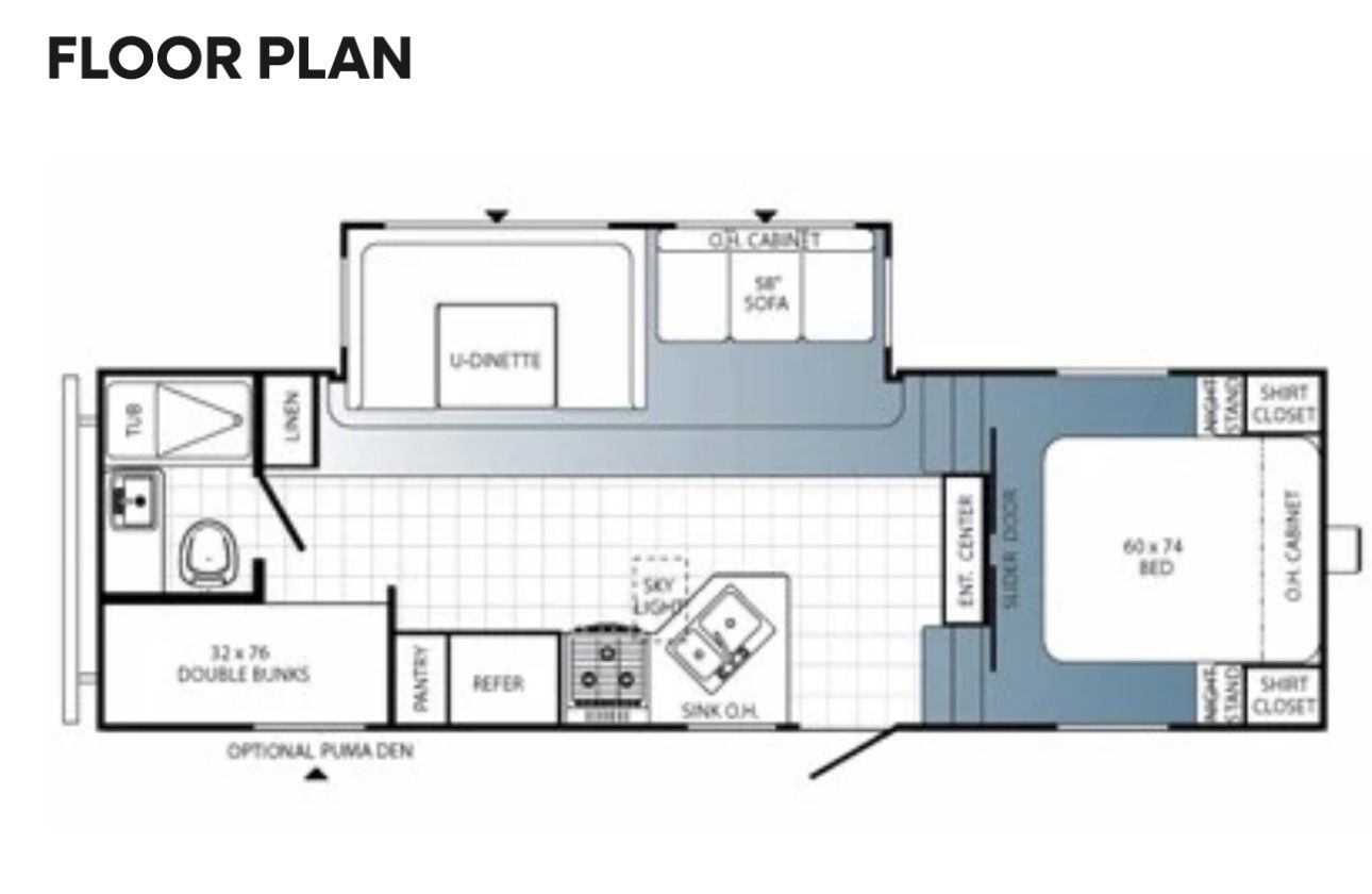 Nice Floorplan -Stabilizing Jacks -Power Awning with LED lights -LED lighting inside -Slide Out -Front Queen Bed -U Shaped Dinette -Rear Bunks -Bathroom with toilet/shower -Fridge/Freezer -Stove/Oven/Microwave -Couch that folds into a bed -Ducted A/C with Wall Controls -Full Bathroom with Fan -Furnace -Puma den for storage under back bunk -Overall Length 28’ -Dry Weight 7,200 -Hitch Weight 1,391