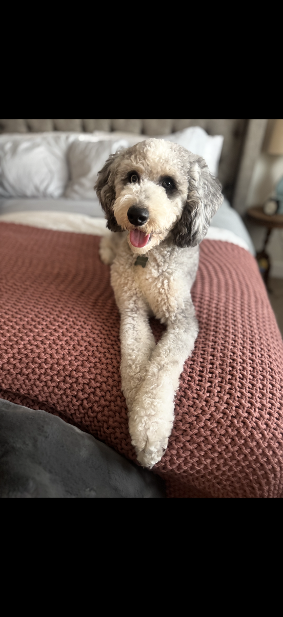 Dad is a Mini F1b Bernadoodle, weighing 25 lbs, and is genetically tested and fully health cleared. He also has one blue eye and brown eye. Puppies eye color is still to be determined but some of the Merle's are showing traits of having 1 or both eyes being blue.