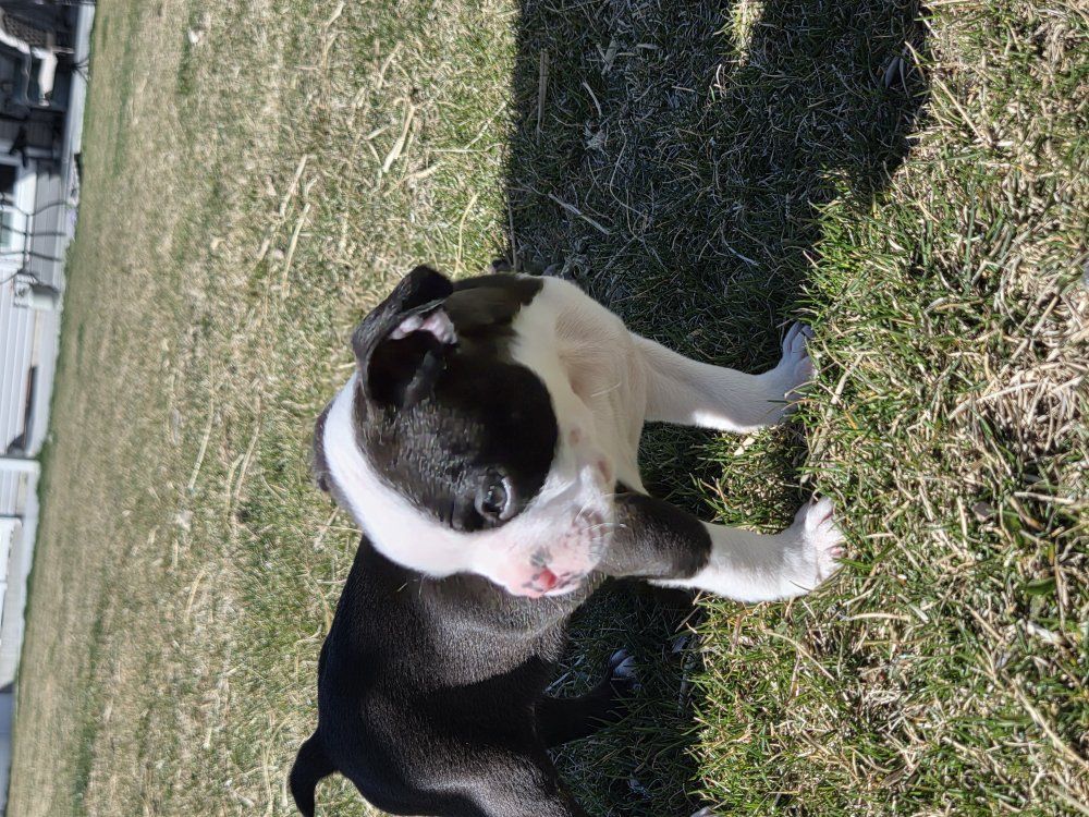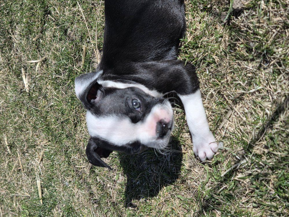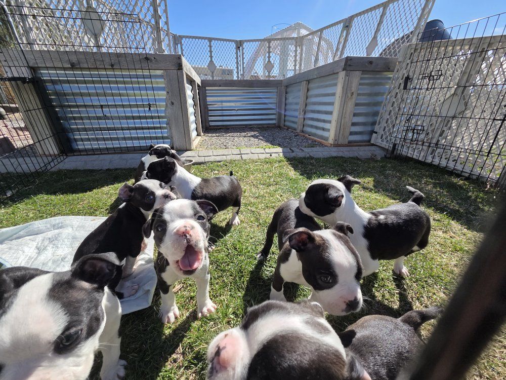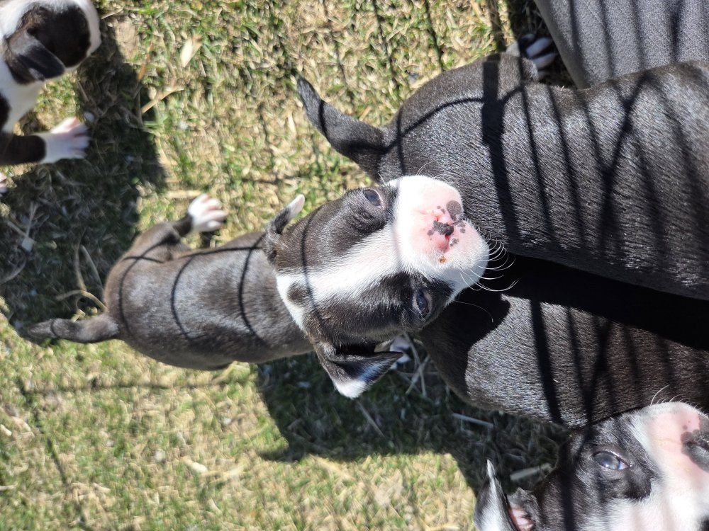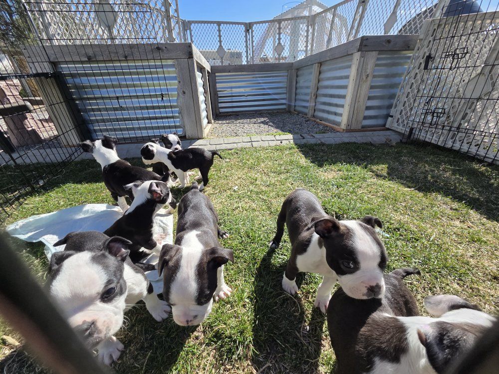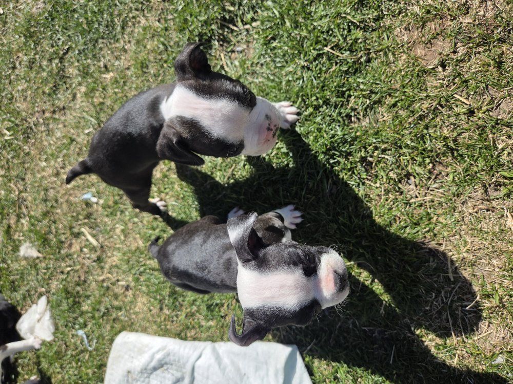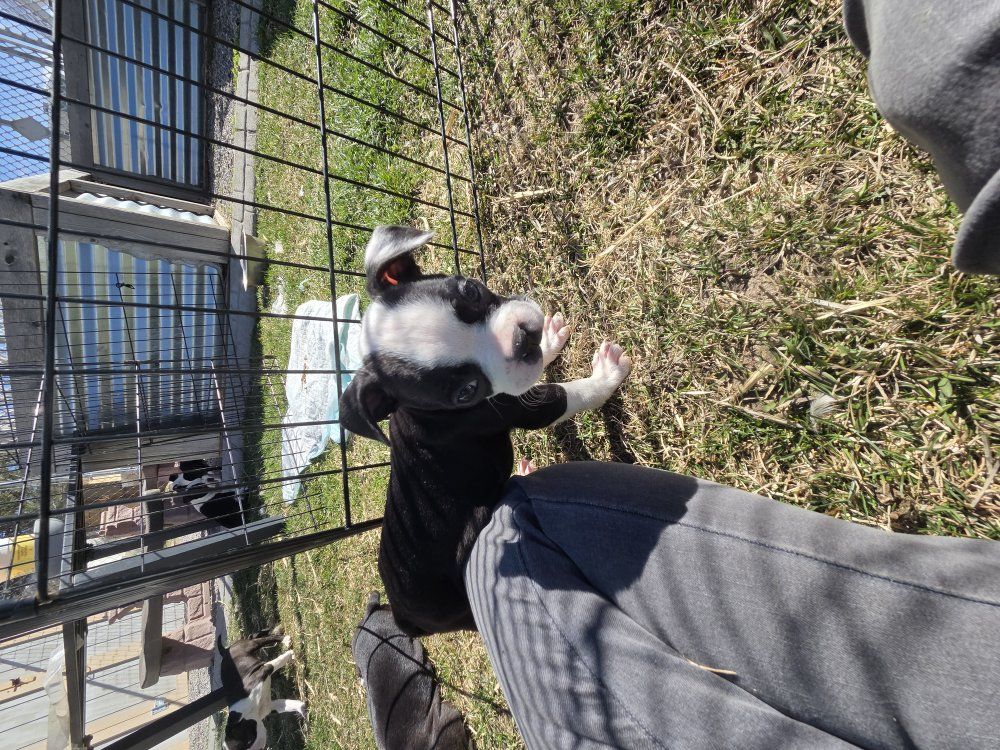 I have Boston terrier puppies. 4 female 4 male. they will come with first set of shots. they are on solid puppy food. Come pick yours before they are all gone. they are super playful and full of energy. mom and dad are well tempered. Good with other dog. They are not registered.