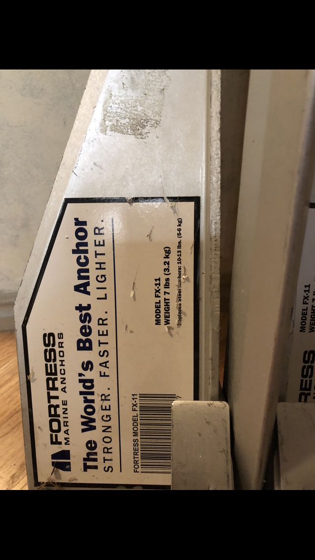 Fortress FX-11 Aluminum Marine Anchor, 7lbs. The World’s Best Anchor, Stronger, Faster, Lighter. Highest rating in over 20 independent tests worldwide. Superior holding power at a fraction of the weight, easily assembles and disables for convenient storage. Adjustable for firm or soft bottoms, High-tech rustproof aluminum alloy. New!! $160.00!!