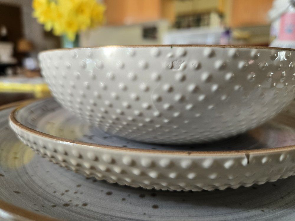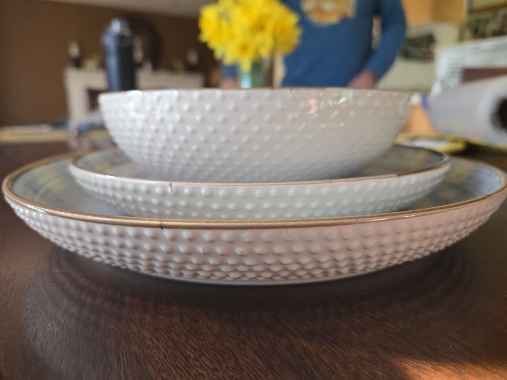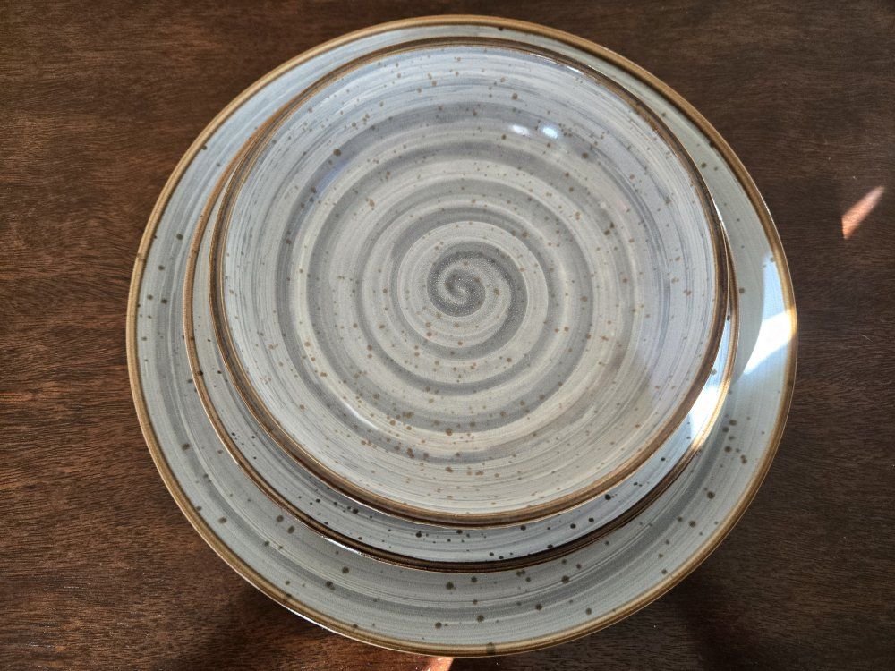 The Mellow Dinnerware Set will bring zen and a dash of style to your meals. The swirling pattern is balanced by a gently powder blue color on top of which lay brown speckles and a brown rim for added flair. The cream glossy exterior features de-bossed dots, adding harmony and charm to this pretty set.Exquisitely textured on the outside to enhance your senses yet sleek and smooth inside for easy cleaning after the most delectable dishes!