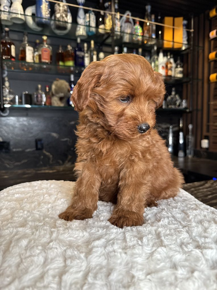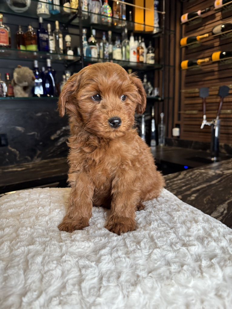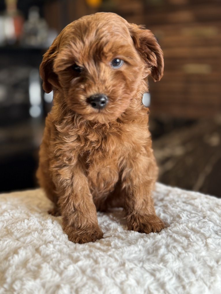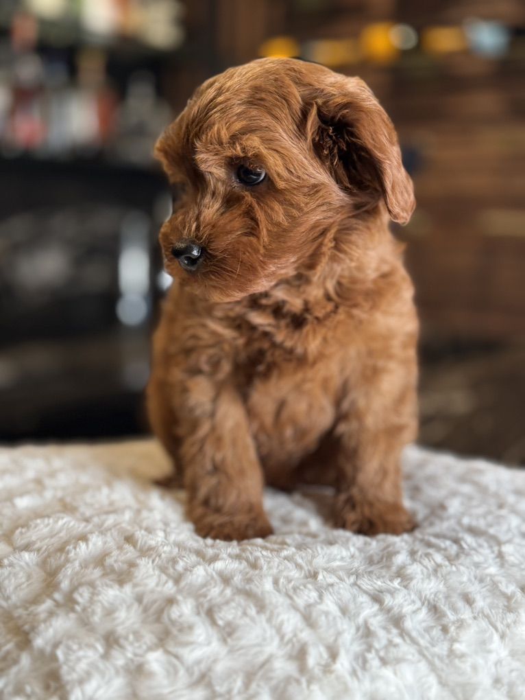 They will not shed at all! Both parents have beautiful temperaments and health tested! One female has the coolest black stripe on her face! It is a black pigment like a birthmark that makes her stand out! She is so unique and beautiful! She will turn heads. In all my years of breeding I’ve never seen a marking like this on a deep red Goldendoodle! They were raised around kids, big dogs and cats and are very socialized and confident. They are doggy door trained to use the bathroom outside. They were dewormed at 2,4,6, and 8 weeks and first and second set of shots given. We have 2 girls and 1 boy left.