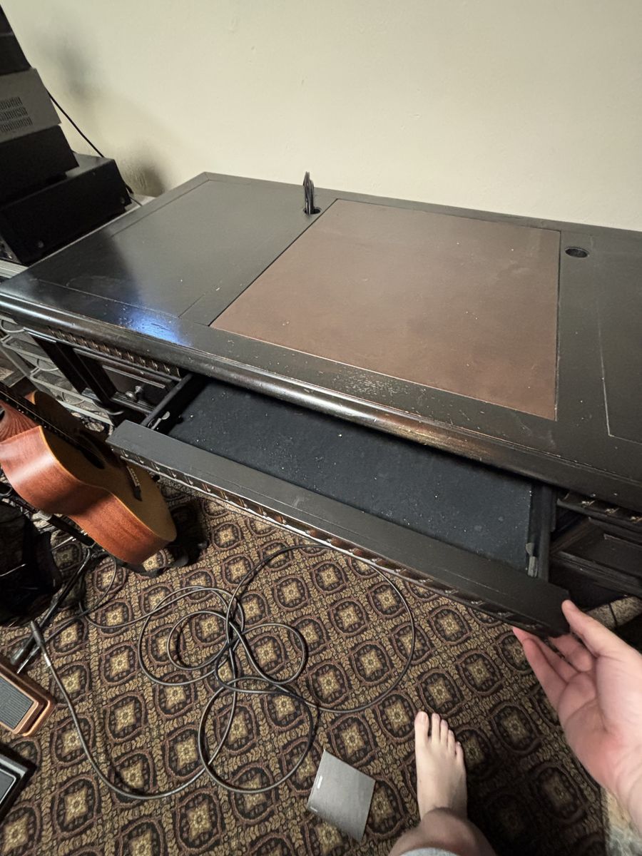 Multiple drawers Ports for cables Middle drawer for keyboards Padded center top Solid wood