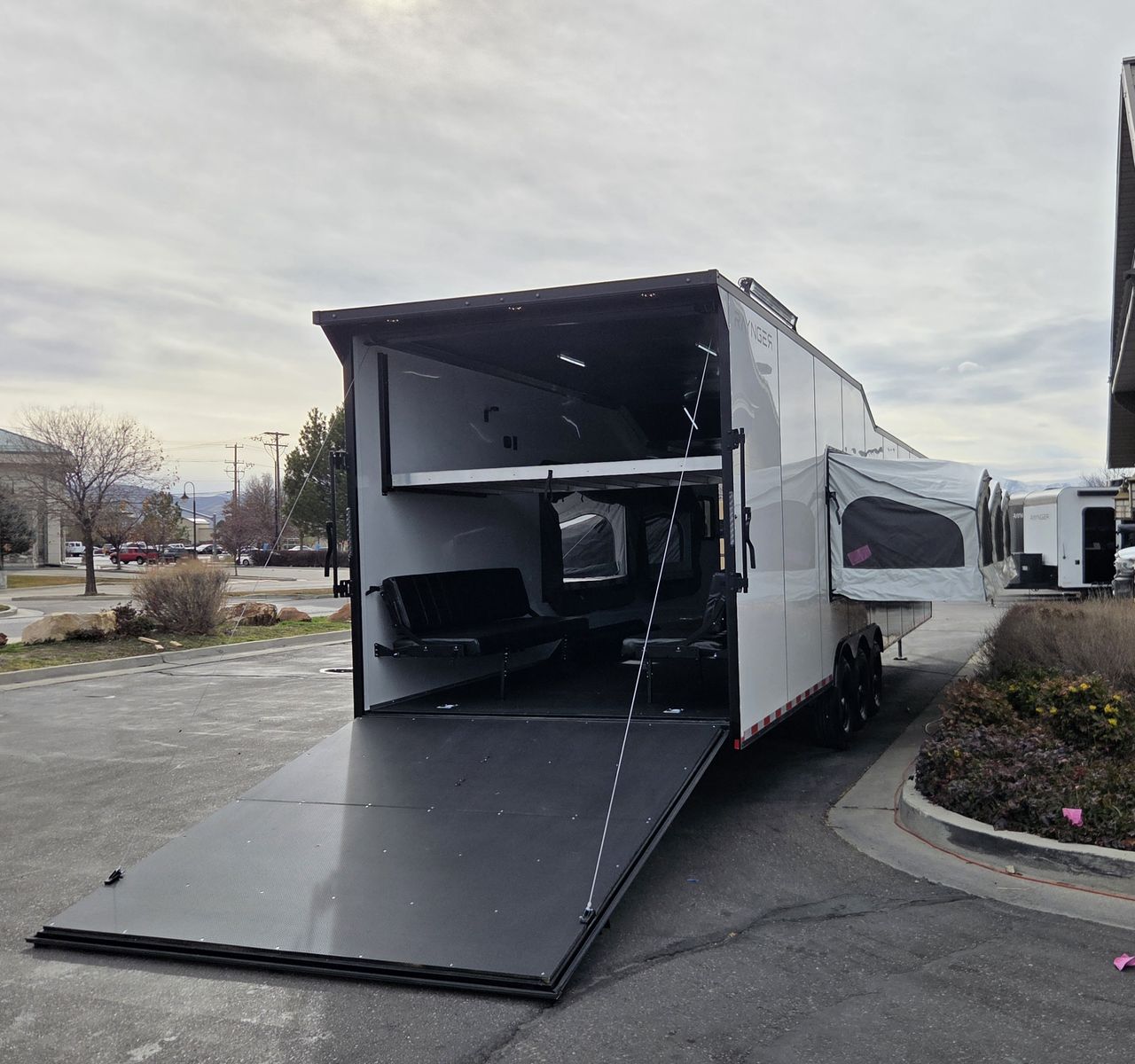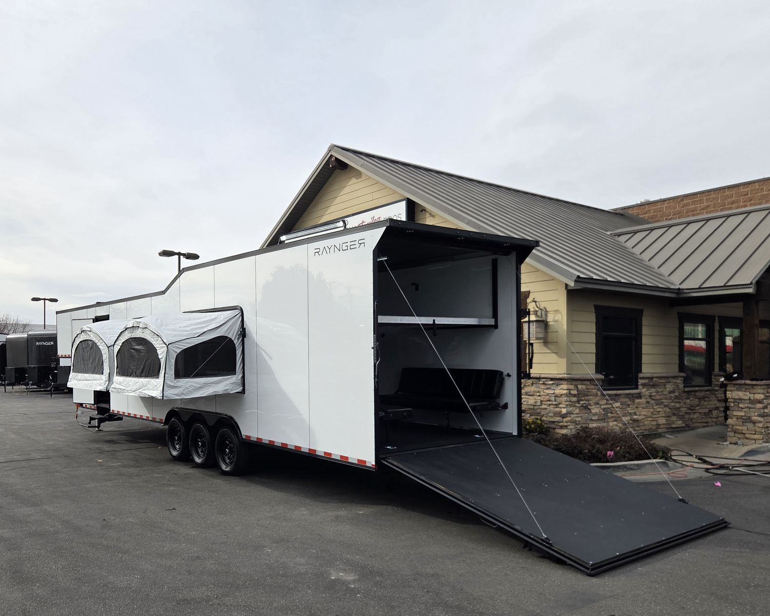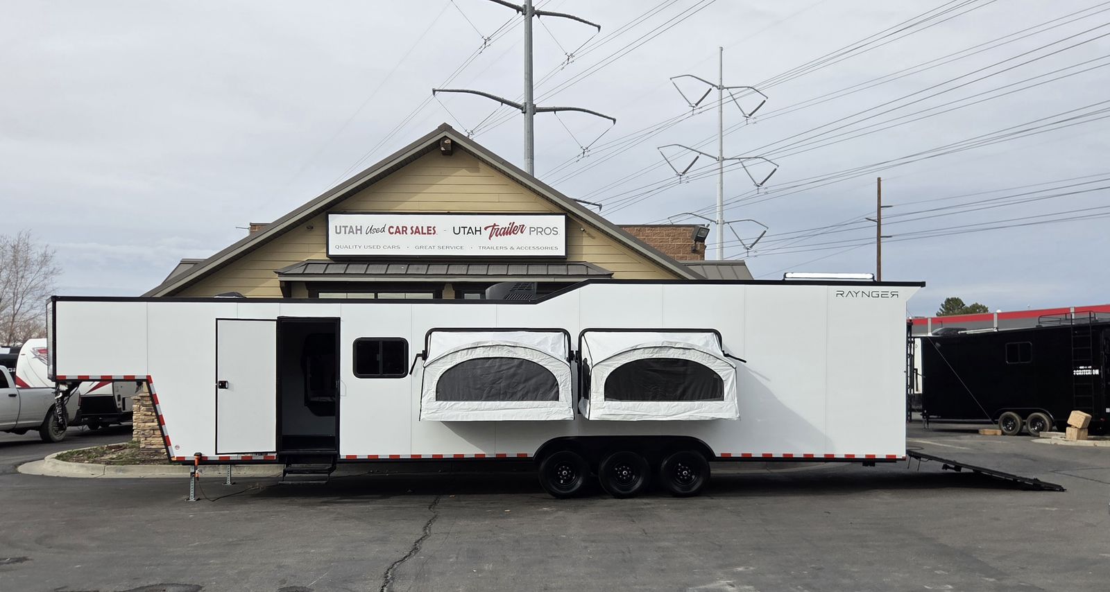 FREE NATIONWIDE SHIPPING!!! $572 A MONTH WITH ZERO DOWN WITH OUR SPECIAL LOCAL CREDIT UNION PARTNER!!! NO PRE-PAYMENT PENALTIES!!! 21,000# GVWR w/Triple 7,000# Torsion Axles!!! 32 Foot Garage, fits any 2 of the largest Side by Sides on the market!!! 82 Inch width between the interior wheel wells, 84 inch rear entry height!!! 5x Pop Out Tents, Sleeps 16 People!!! NEW GOOSENECK TOY HAULER MODEL!!! GO WHERE OTHERS ONLY DREAM!!! RAYNGER PREMIUM GOOSENECK TOY HAULER CAMPER!!! Do you want a Bathroom/Kitchen? Ask our Sales Staff about our NEW optional "FBHK" set up (FULL BATHROOM/SHOWER/KITHCHEN AREA) FULLY INSULATED!!! .080 PolyCor Aluminum Exterior!! 13,500 BTU A/C with Wall Mounted Thermostat!!! STOW AND GO QUEEN BED!!! 84 Inch Rear Entry Height!!! 2x Power Fan Ventilated!!! Water Resistant Poly Bead Flooring (Same Used in Snowmobile Trailers) EXTRA TOUGH!!! Patio Conversion Jacks!!! 4 Foot LED Party Lights for nighttime fun!!! Marine Battery with Box. Solar Prepped!!! 2x Rollover/Jackknife Sofas under the Stow and Go Bed! Looking for other options!?!? Just ask, we install!!!! You HAVE to come see this BEAST in person, it will amaze you!!!