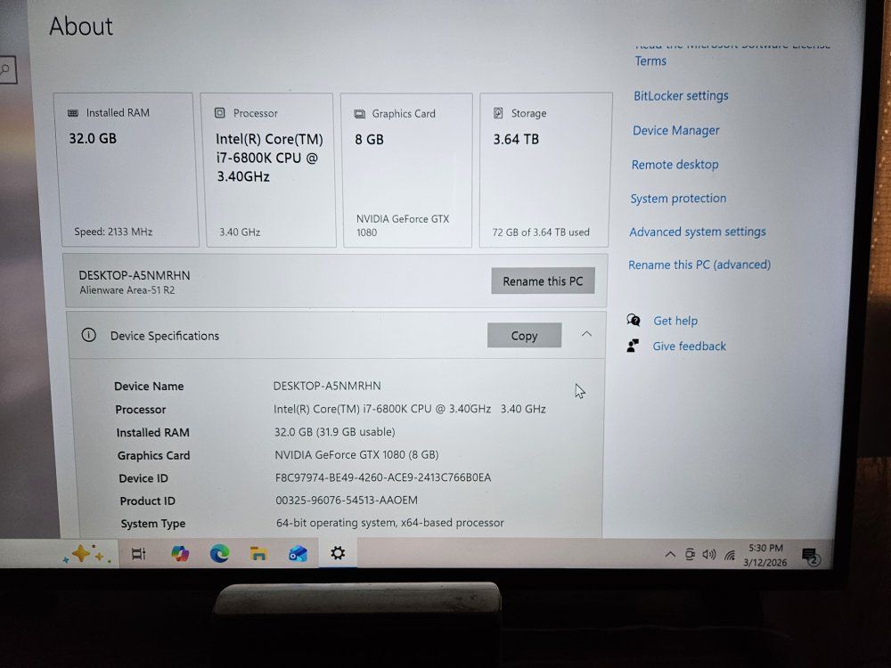 32Gb Ram 2TB SSD 2TB HDD i7 12 core cpu GTX 1080 GPU