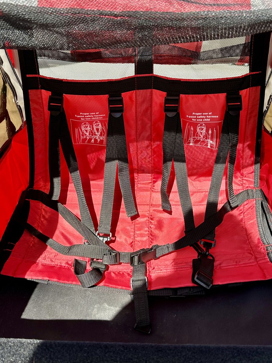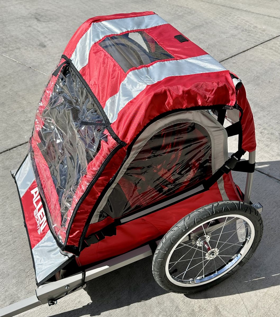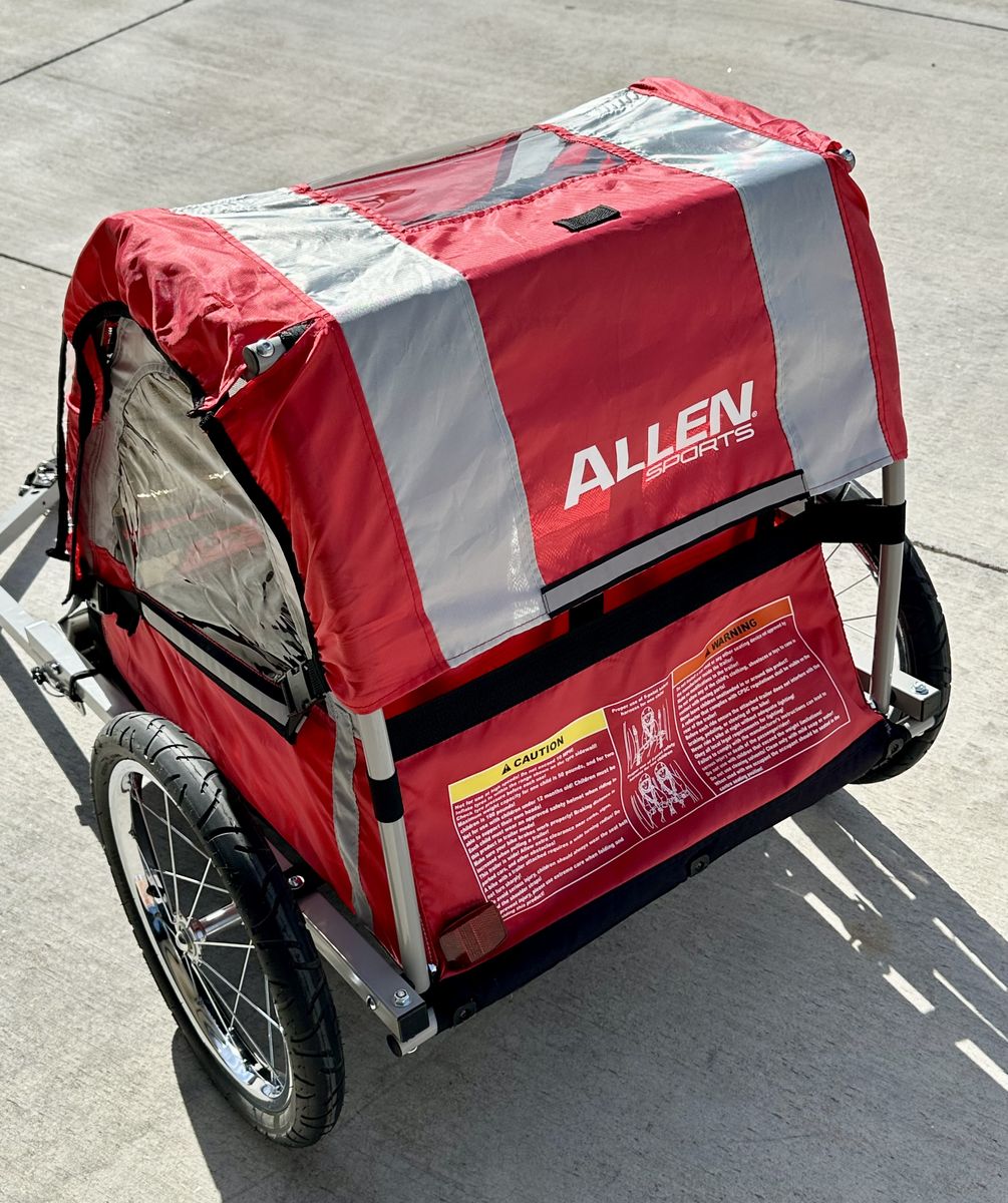 Venmo• Allen Sports Deluxe 2-children bicycle trailer • 2 kids sit side-by-side or 1 child in the middle • Adjustable 5-pt safety harnesses • Foot guard in front to protect small feet • 2 interior side pockets for snacks, toys, etc. • Large side windows for viewing • Mesh panel protects from flying debris/insects • Mesh panel for ventilation in warm weather • Clear panel for cold or rainy weather • Clear panel rolls up out of the way when not in use • Cargo storage in back for diaper bag and gear • Reflectors & reflective strips for nighttime safety • Bicycle all-terrain style wheels for a smooth ride • Universal coupler connects trailer to parent’s bike • 100 pounds carrying capacity • Folds flat for easy travel or storage • Like new, barely used condition and has been garage stored from day one, so there’s no sun fade. There are also no rips or tears. Grandkids have outgrown and time for another family to enjoy. Message if interested.