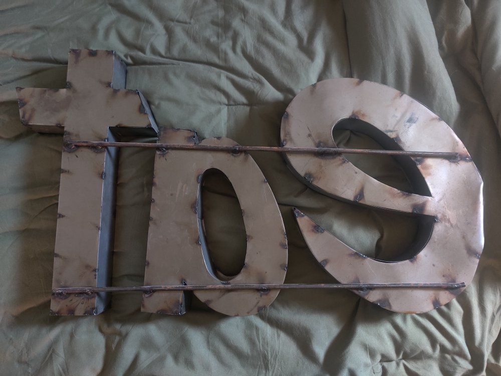 PayPalRustic metal sign decor purchased from Wayfair. Has a few minor scratches but doesn't affect the look. Approximately 27" wide and 15" tall. Let me know if you have any questions, thanks for looking!