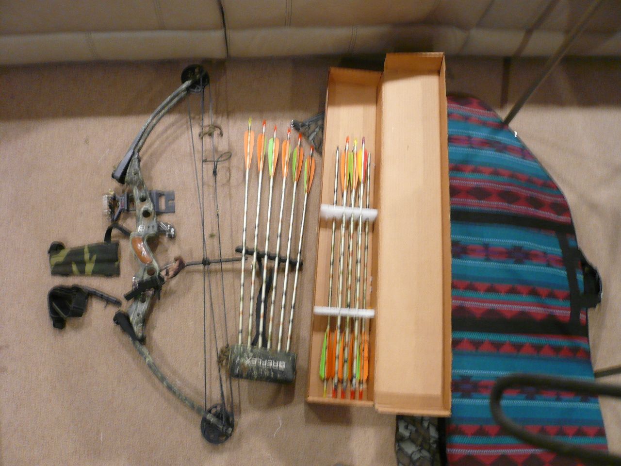 Easton reflex bow with sights, and about a dozen arrows.