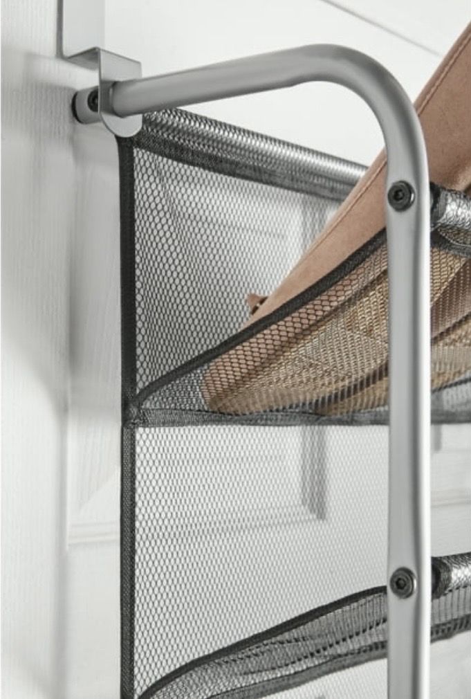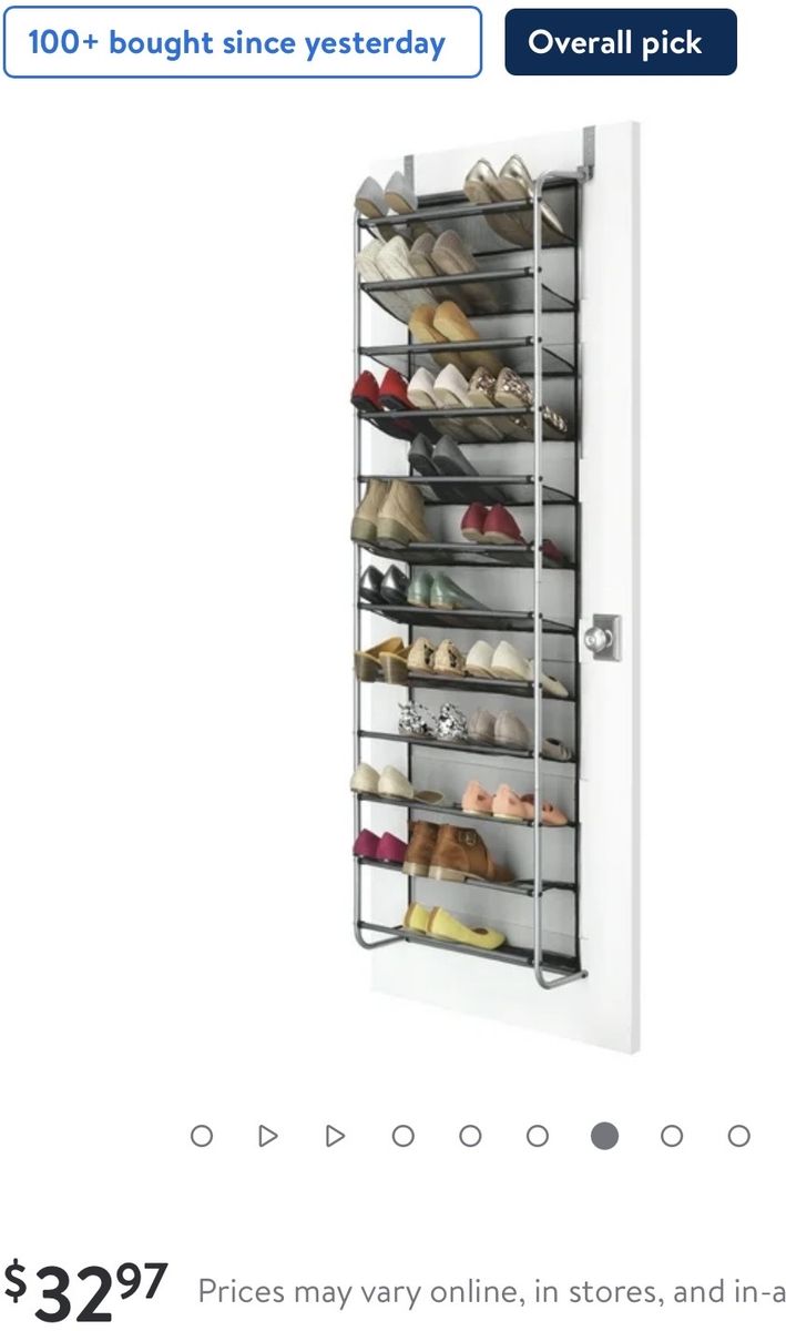Venmo12-Tier over the Door Shoe Rack is a metal and mesh organizer designed to hold up to 36 pairs of shoes. Capacity: Holds up to 36 pairs of shoes. Dimensions: Approximately 69 H x 21.63 W x 7.5 D. Features: Features tear-resistant mesh shelves and a metal frame. Installation: Designed to hang over standard door thicknesses without additional tools required for assembly. I have 2 of these, both new in box.
