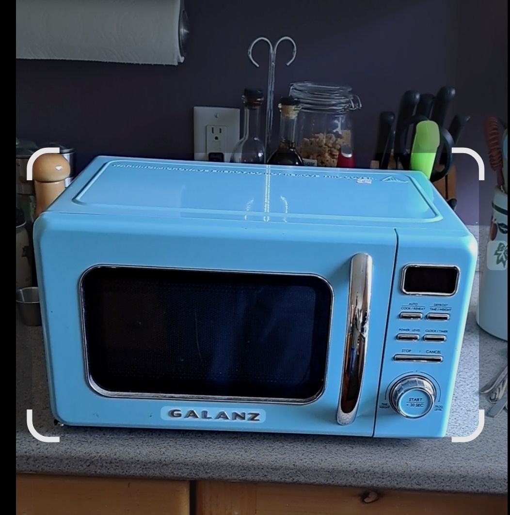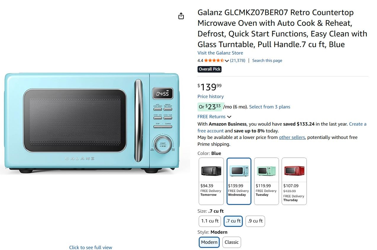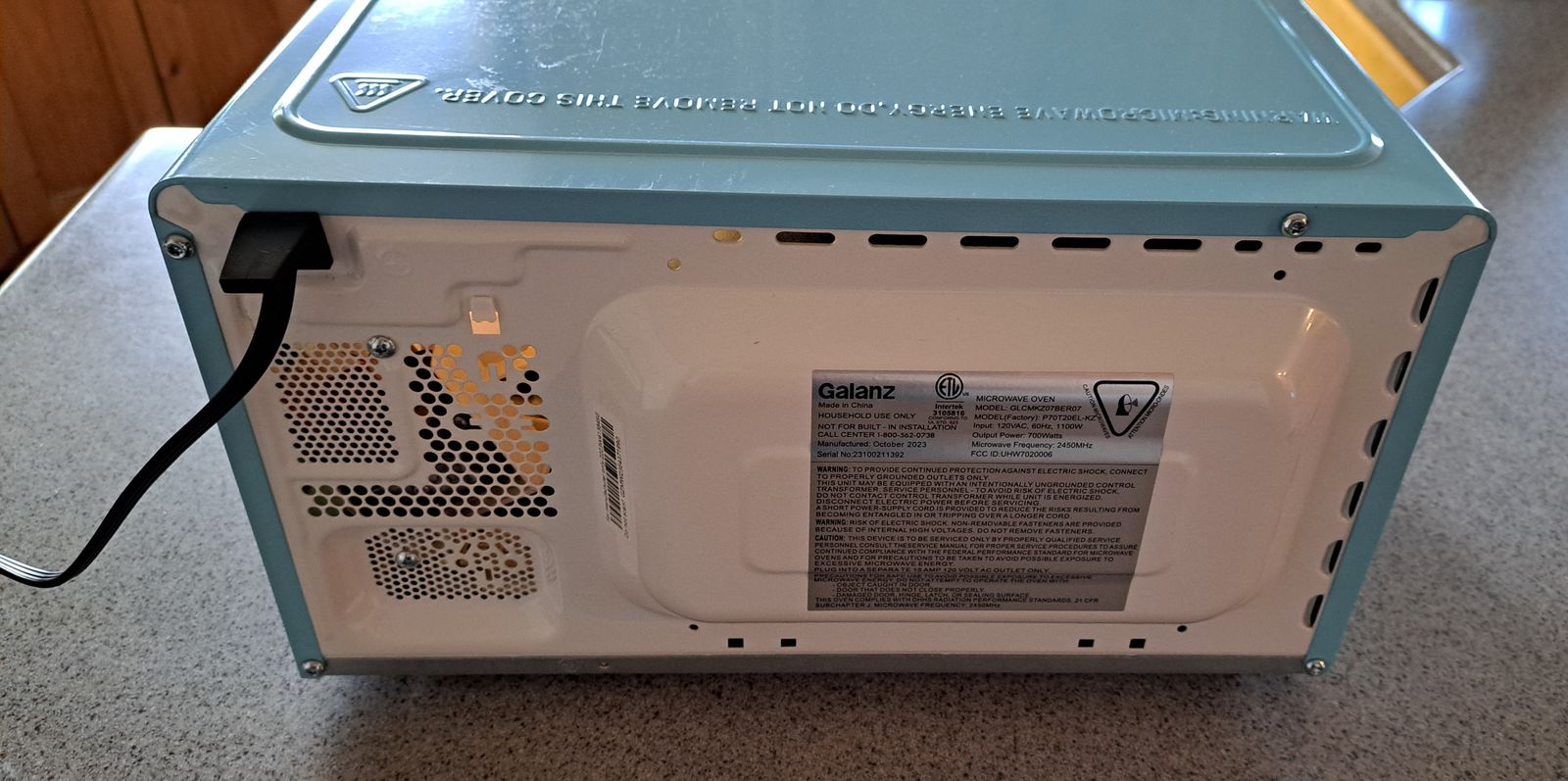 In perfect condition. This color/model is sold out at a lot of places, I've noticed. Currently on Amazon for $139.99 ($150 w/ tax). Dimensions: 14"D x 17.5"W x 9.5"H; Color: Blue; Capacity: 0.7 Cubic Feet; Special Feature: Auto Cook, Defrost, Turntable; Wattage: 700 watts; Material: Glass, Stainless Steel
