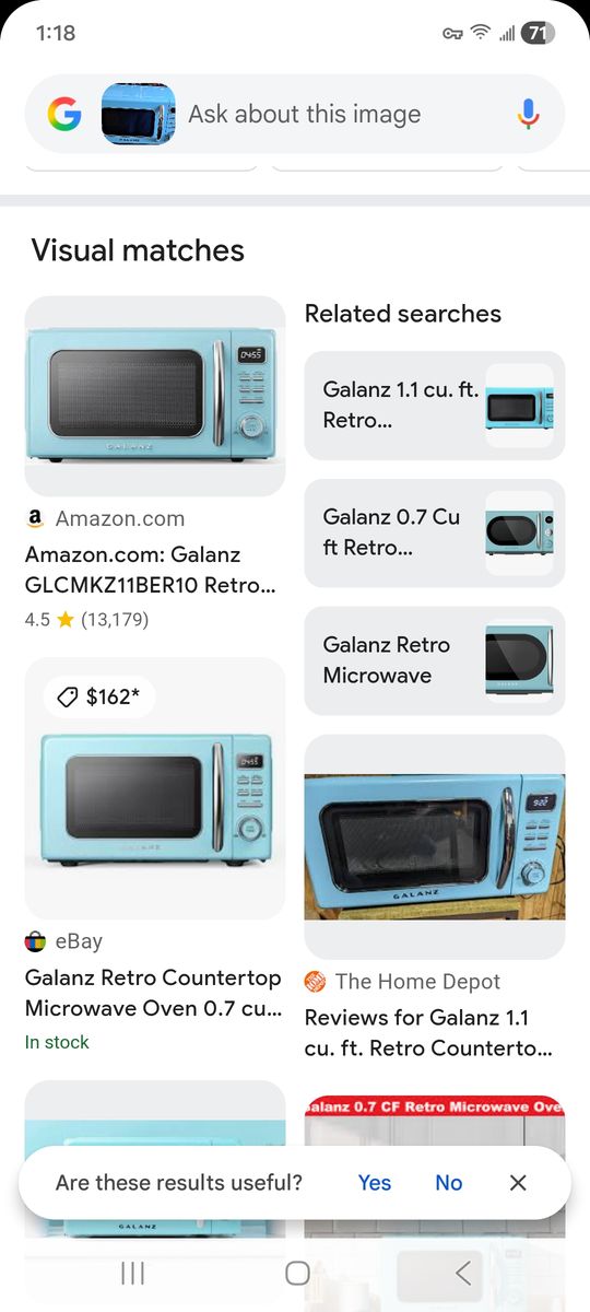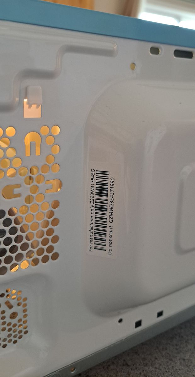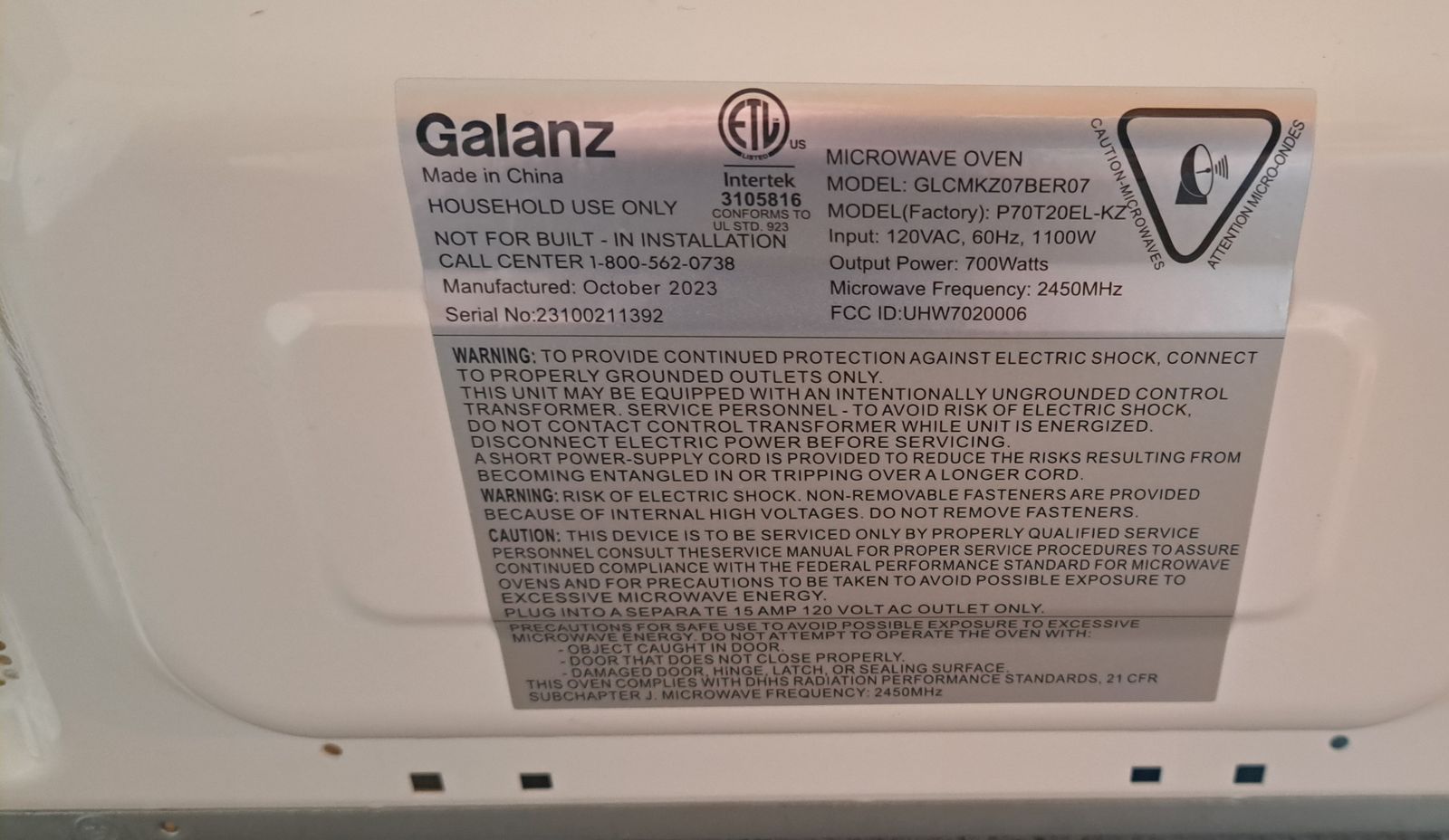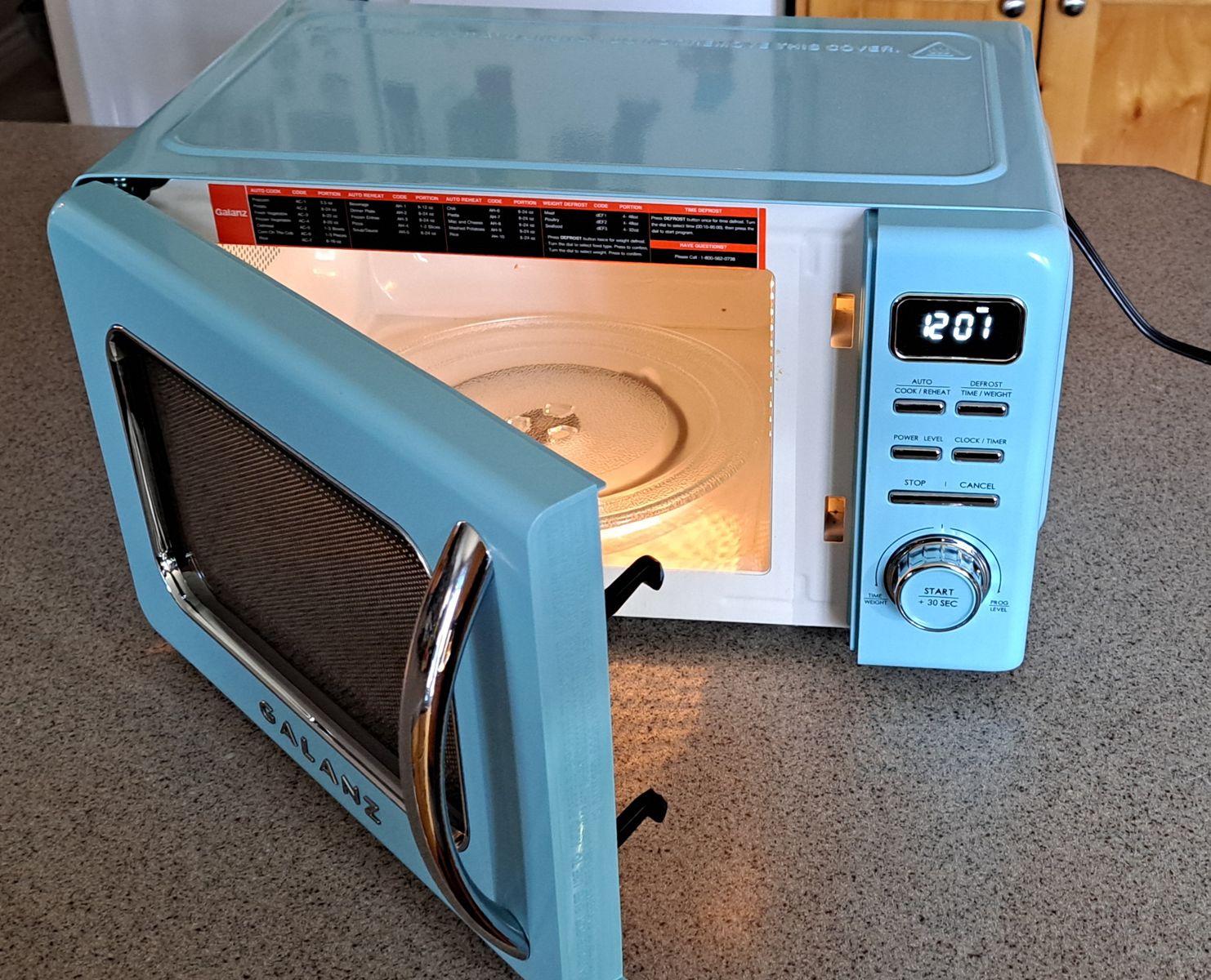 In perfect condition. This color/model is sold out at a lot of places, I've noticed. Currently on Amazon for $139.99 ($150 w/ tax). Dimensions: 14"D x 17.5"W x 9.5"H; Color: Blue; Capacity: 0.7 Cubic Feet; Special Feature: Auto Cook, Defrost, Turntable; Wattage: 700 watts; Material: Glass, Stainless Steel