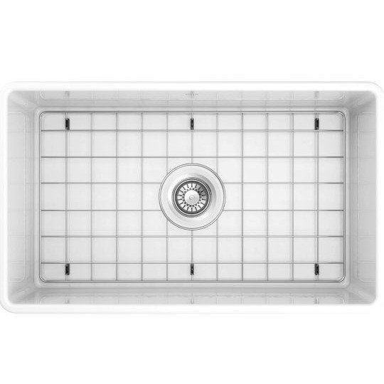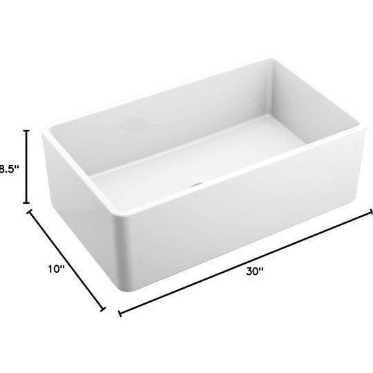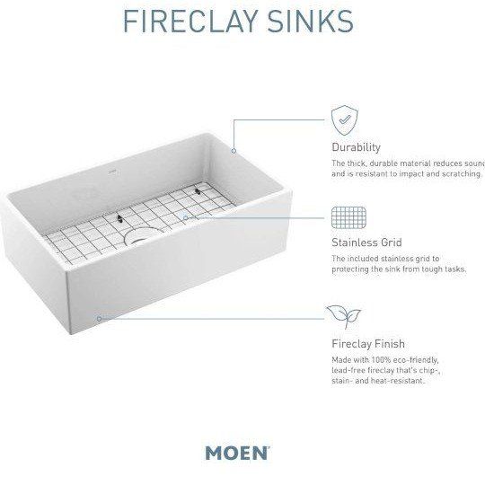 Moen FC301810 Apron-Front Fireclay Single Bowl Undermount Kitchen Sink, 30", White BrandMoen ColorWhite MaterialFireclay Size30 x 10 x 8.5 Product Dimensions10"D x 30"W x 8.5"H StyleFarmhouse Highly scratch and stain resistant Stainless steel bottom sink rack and chrome strainer included Thick and durable material aids in minmizing sound during use White glazed finish is easy to clean with long lasting smooth shining surface Natural materials are eco-friendly and made with no lead Desired aesthetic fits farmhouse to midcentury modern style Requires an additional flange if using a garbage disposal (sold separately) Requires support frame in cabinetry