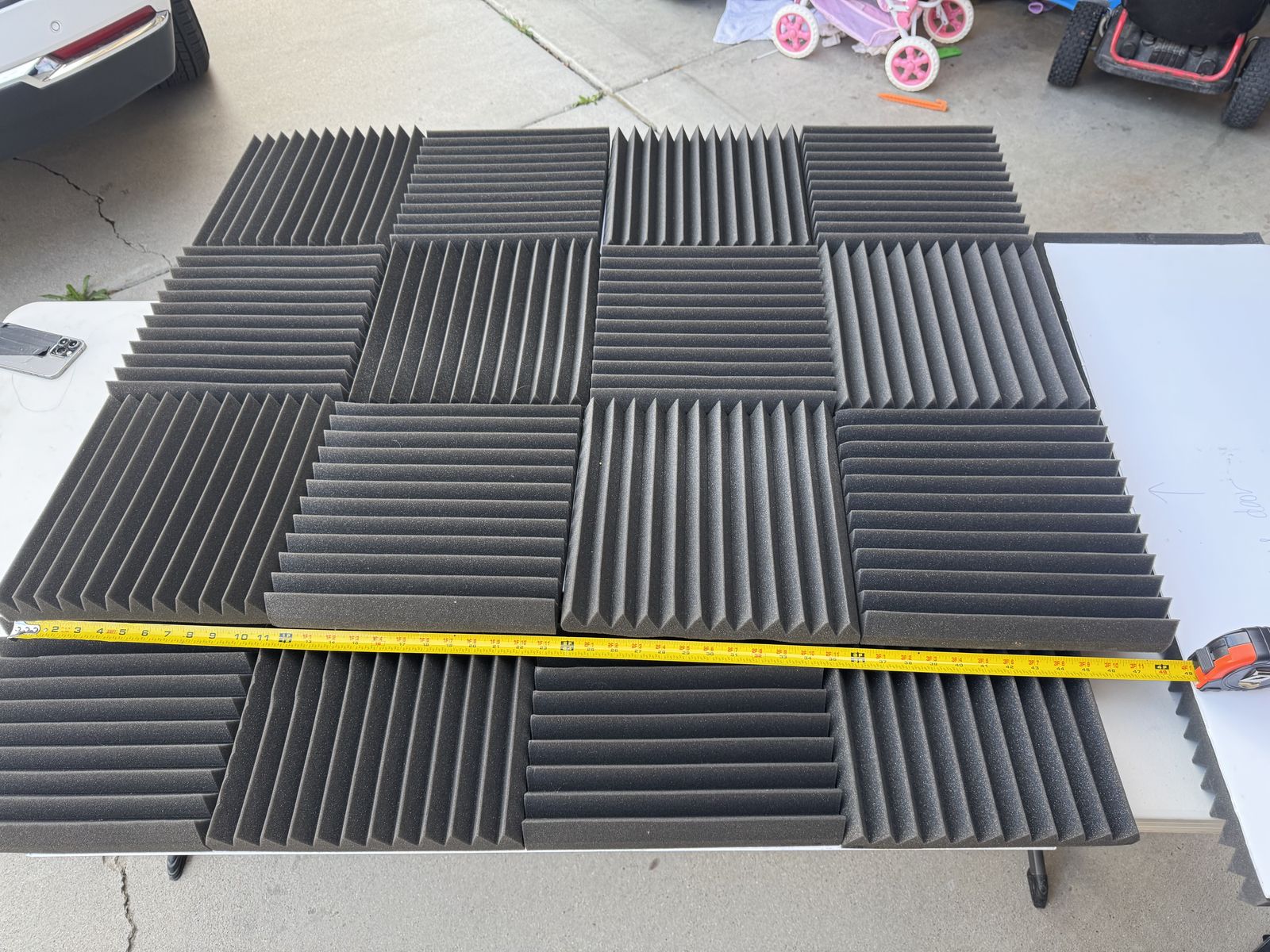 Each panel is on foam backer board and contains 12 squares (12x12x2”).