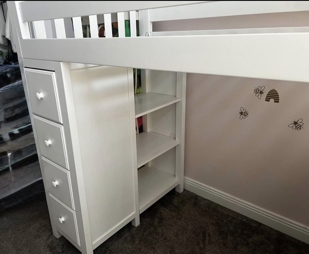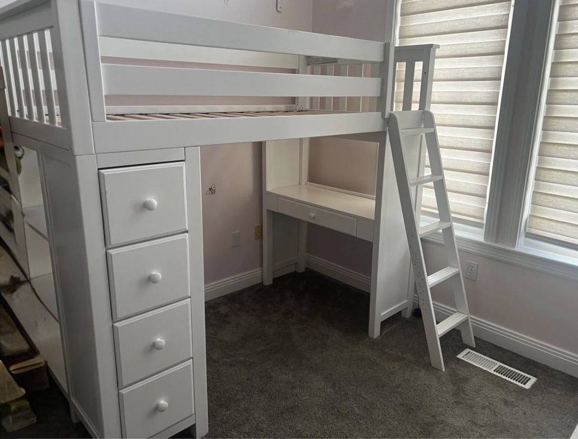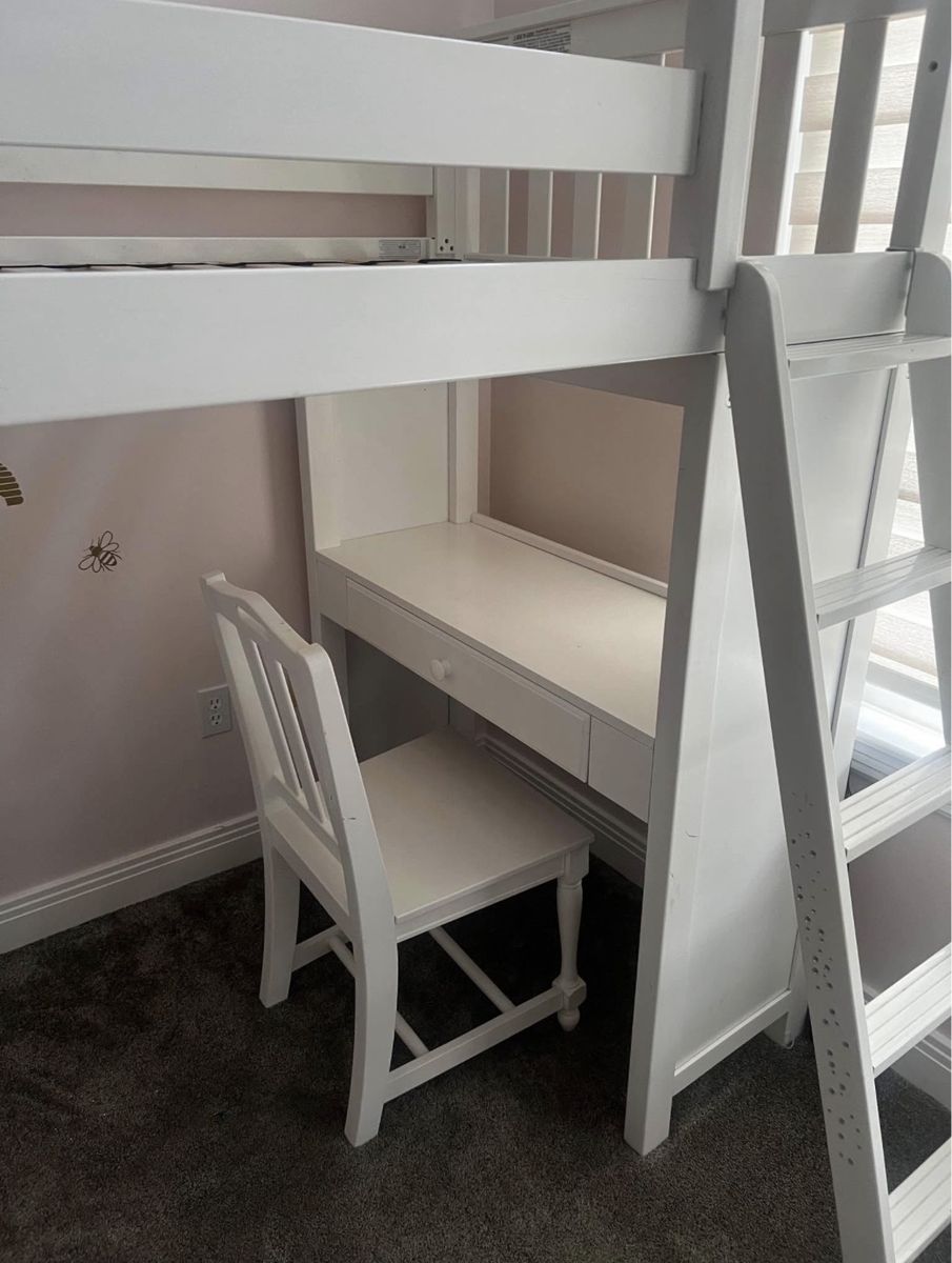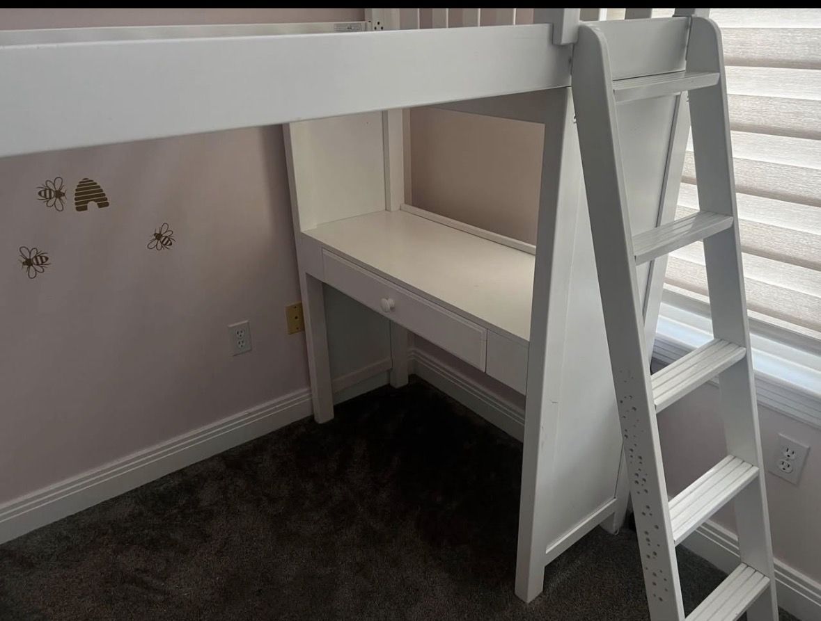 Nice, cute, and sturdy loft bed with ladder, desk, chair, storage shelves and 3 beep drawers. We just got in July and my daughter barely used it and slept in another room. She wanted a bed on the floor. Your gain! Comes with mattress. Paint scratched off above ladder.