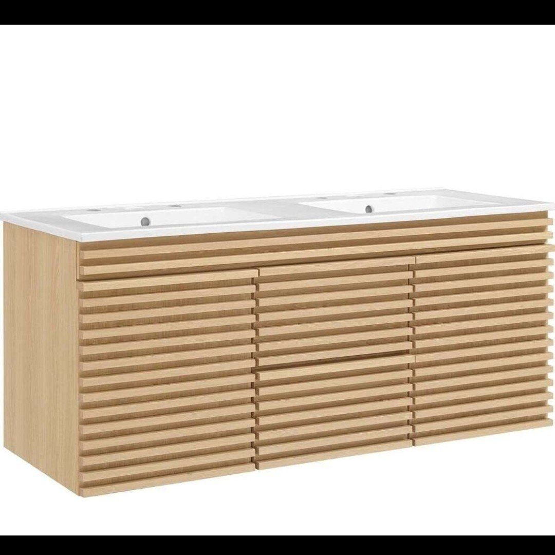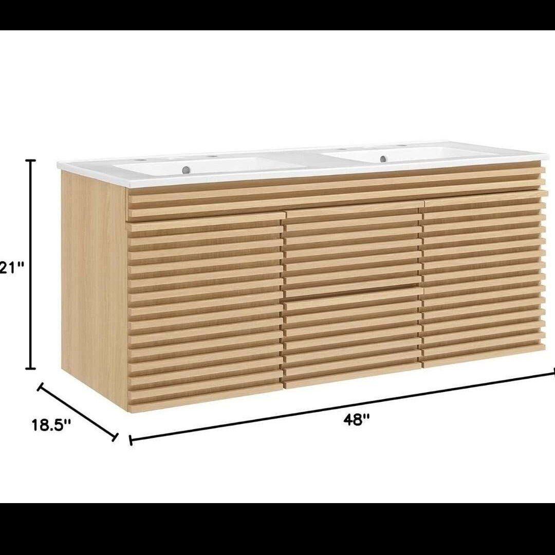 Modway Render 48" Wall-Mount Bathroom Vanity Cabinet with Double Ceramic Sink Basin in Oak White