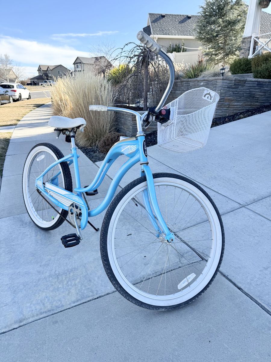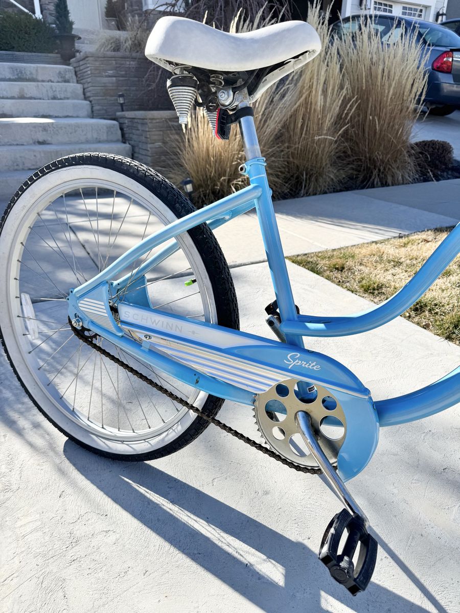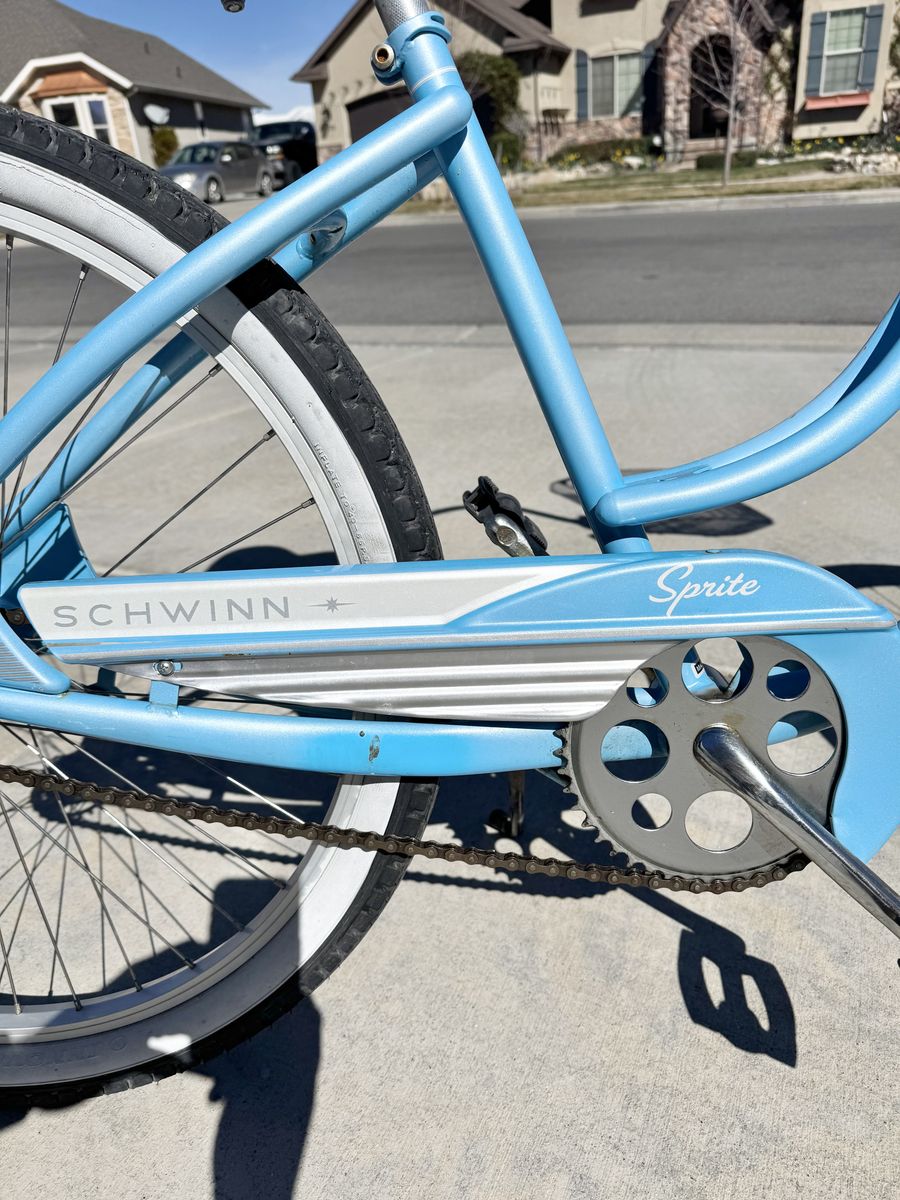 This bike is in great shape and super fun to ride — perfect for cruising the neighborhood, a trail path, or a boardwalk. Details: ∙ Brand: Schwinn Sprite ∙ Color: Baby blue with white/silver accents ∙ Wheels: 26” with white-wall tires ∙ Includes front wire basket ∙ White padded seat ∙ Single speed with coaster brake ∙ Chrome swept-back handlebars Tires are in good shape, chain looks solid, and the frame has that classic retro cruiser look. A great ride for anyone wanting a casual, comfortable bike.
