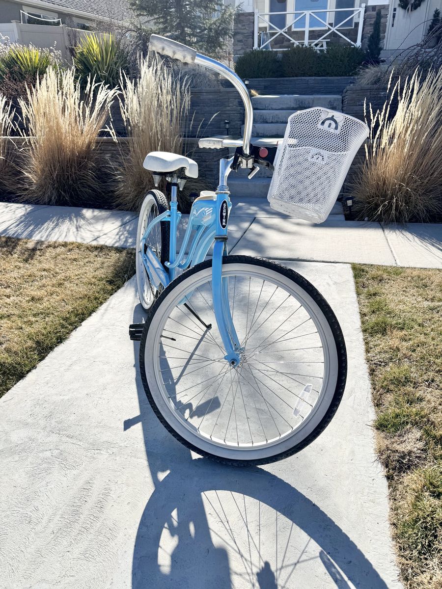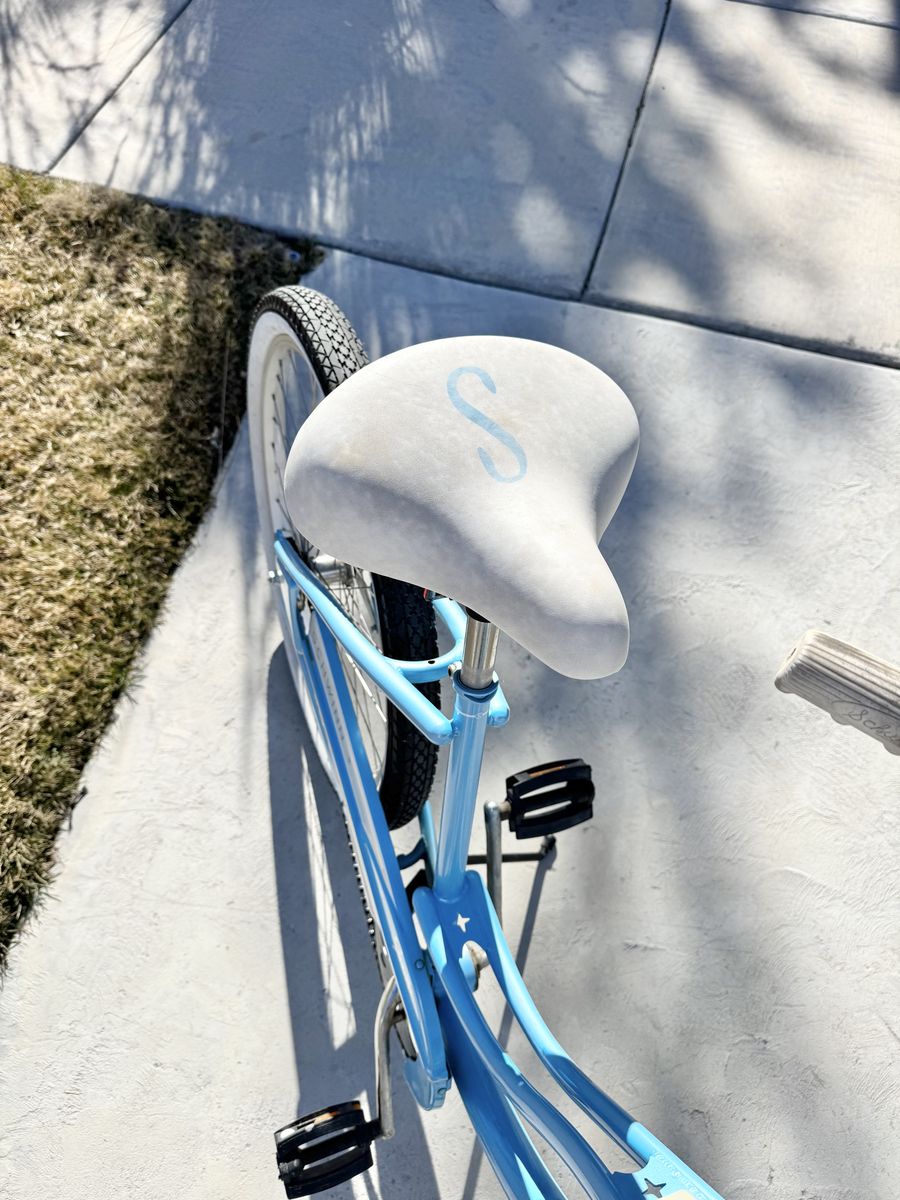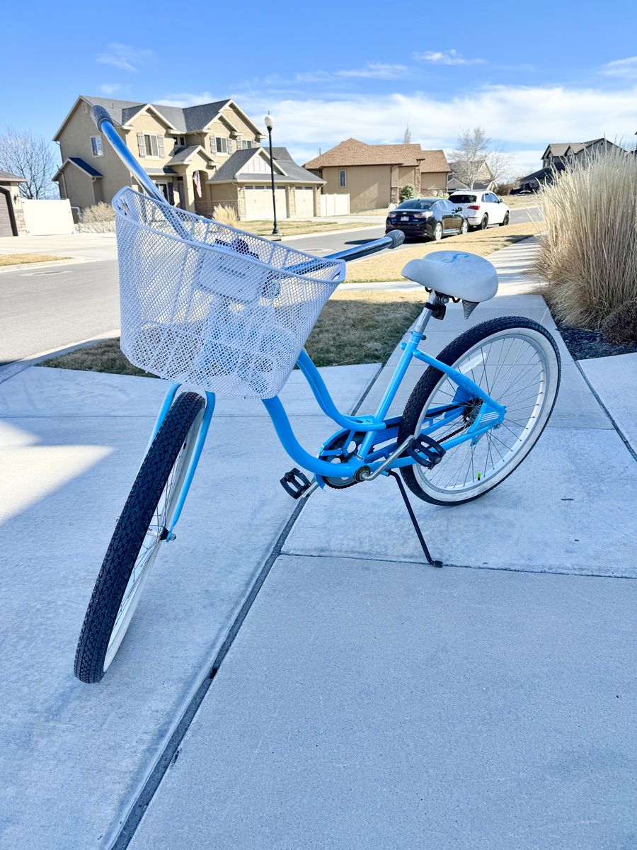 This bike is in great shape and super fun to ride — perfect for cruising the neighborhood, a trail path, or a boardwalk. Details: ∙ Brand: Schwinn Sprite ∙ Color: Baby blue with white/silver accents ∙ Wheels: 26” with white-wall tires ∙ Includes front wire basket ∙ White padded seat ∙ Single speed with coaster brake ∙ Chrome swept-back handlebars Tires are in good shape, chain looks solid, and the frame has that classic retro cruiser look. A great ride for anyone wanting a casual, comfortable bike.