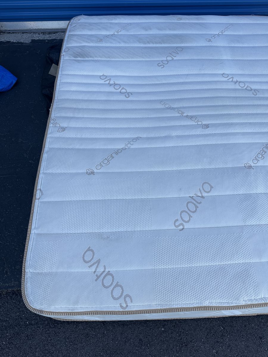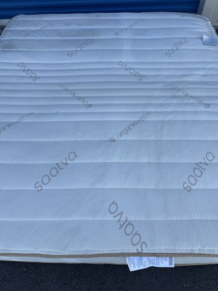 Check out this Saatva Zenhaven king mattress. Overall, it is in good condition. There are some signs of imperfections, some marks from moving, some noticeable beverage stains on the front, there is a tear on one of the sides from a moving mishap, some signs of use, etc.