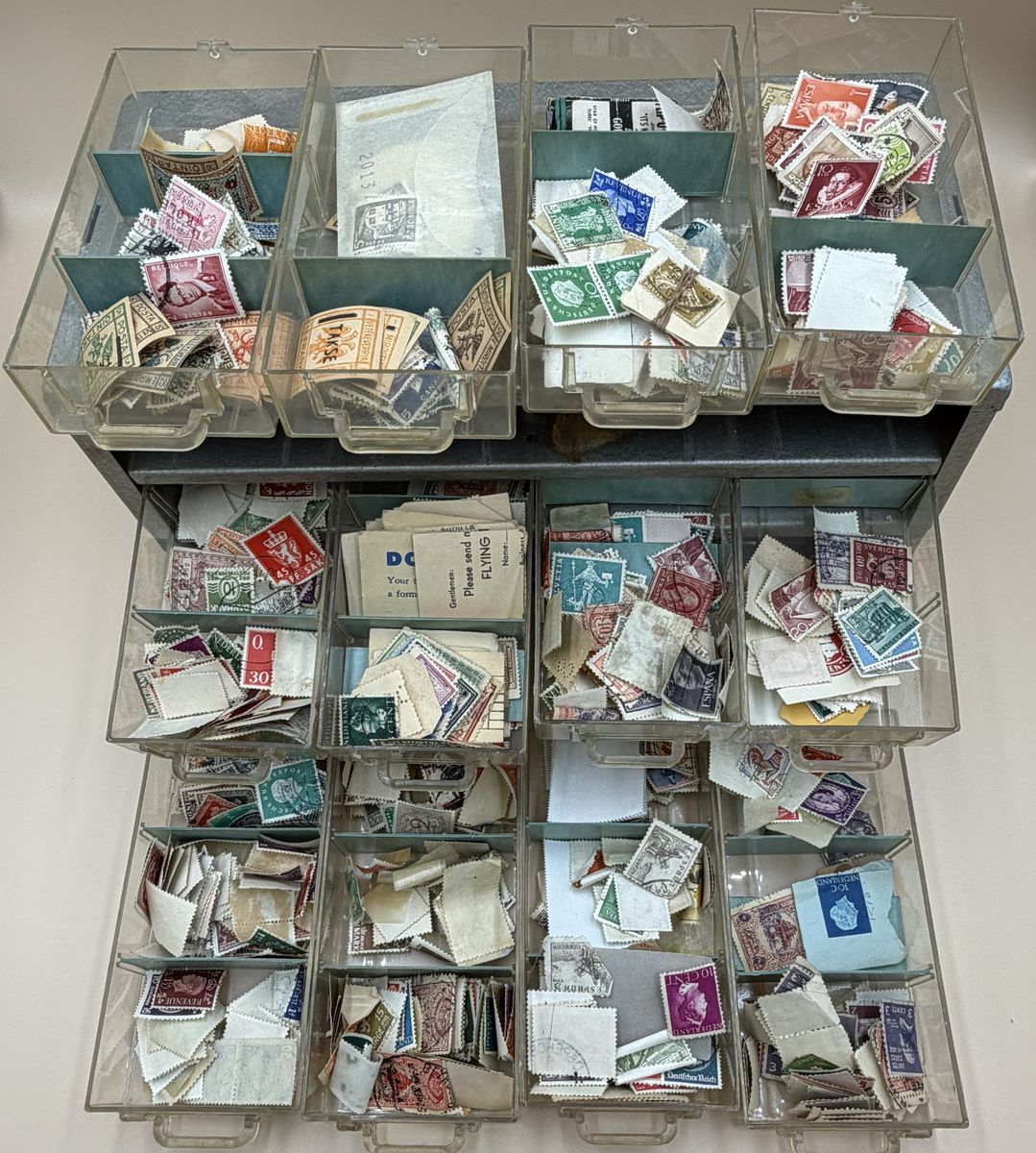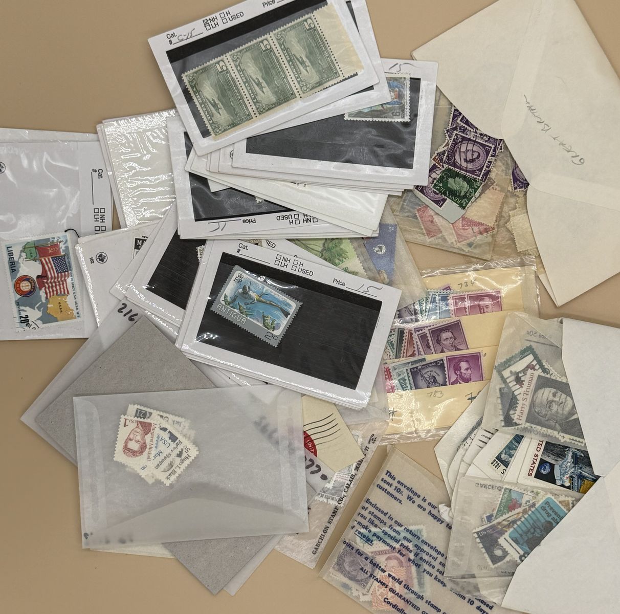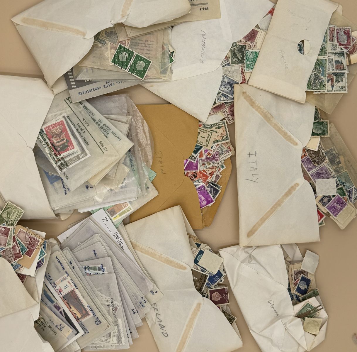 ZelleA HUGE set of worlwide stamps separated into sets and collections in envelopes. Stamps from all over the world!! There are MANY loose stamps to sort through as well.