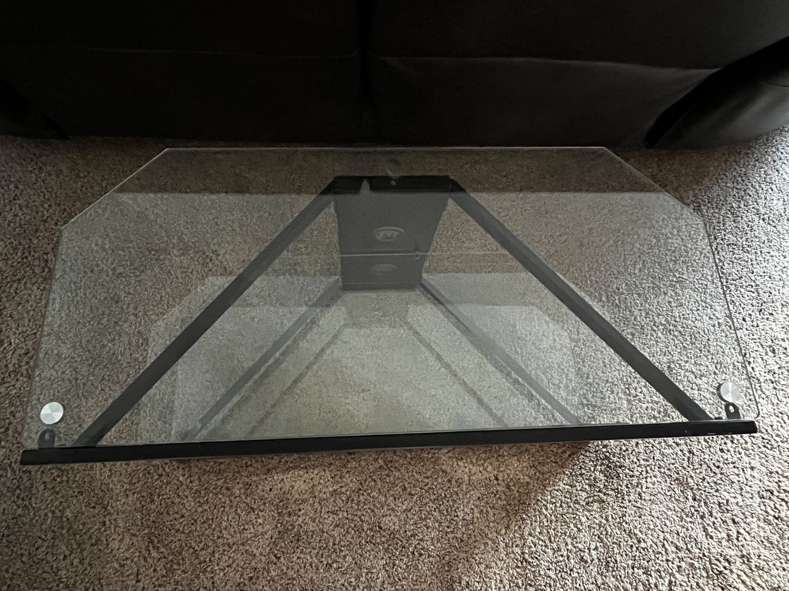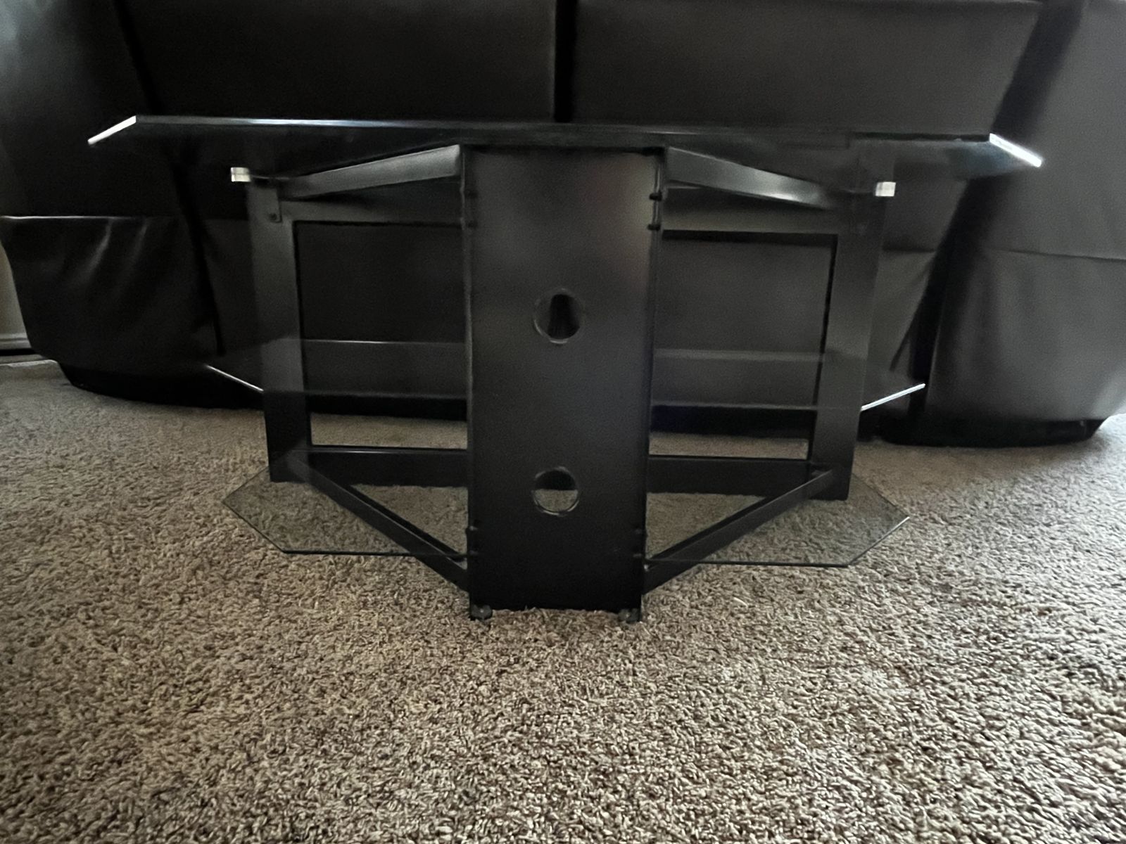 VenmoSimple, modern TV stand with a black metal frame and curved glass shelf. It’s sturdy and works great for a TV, gaming system, or media equipment. Clean look that fits well in most living rooms or bedrooms.