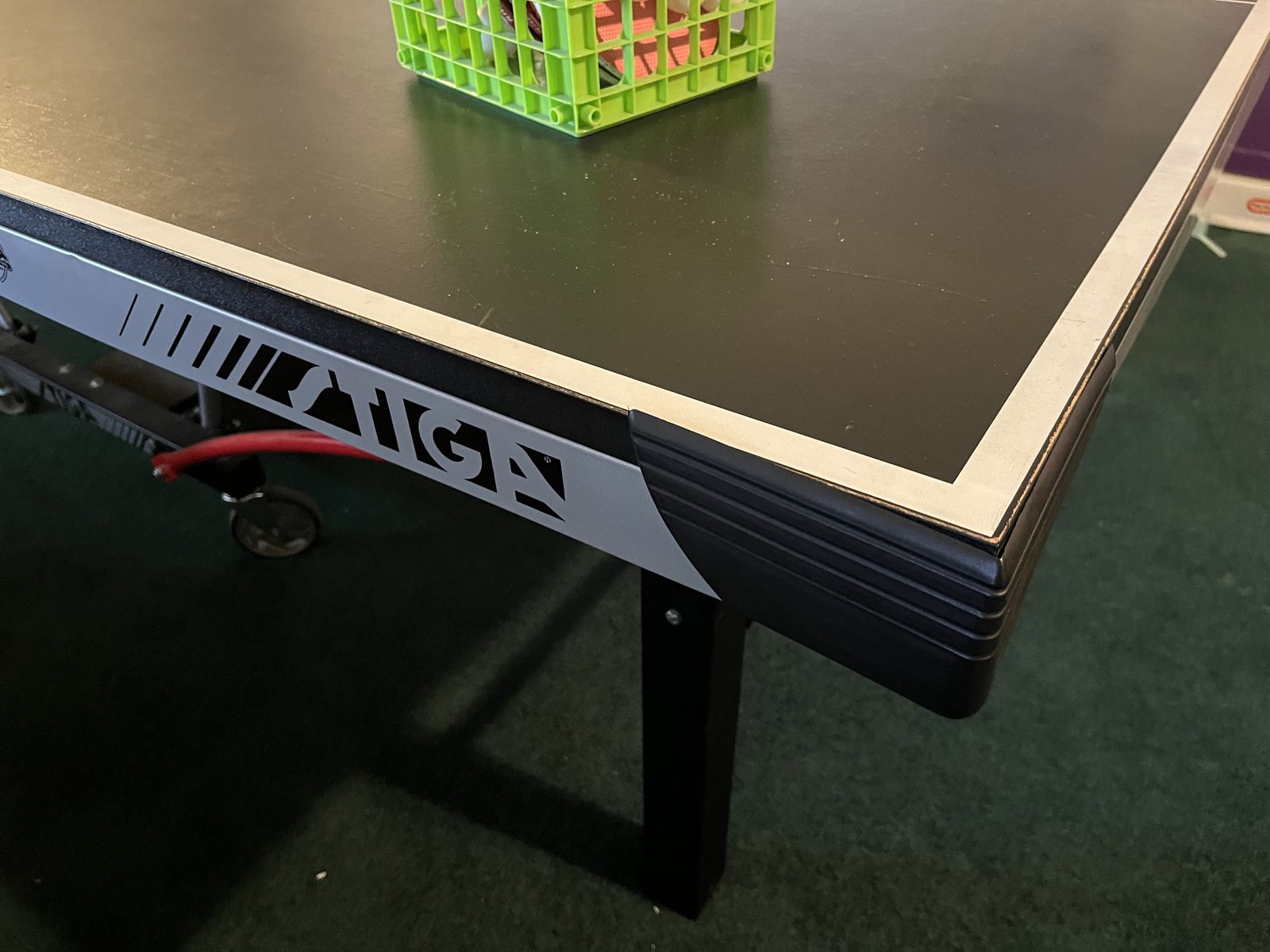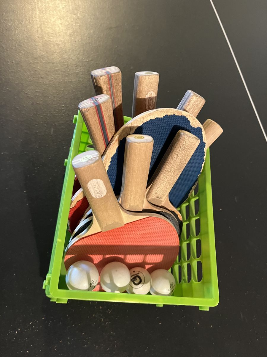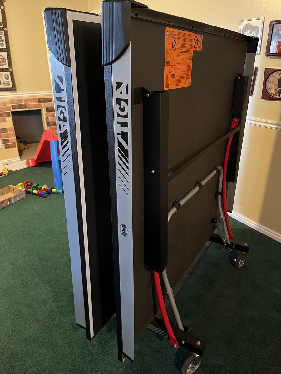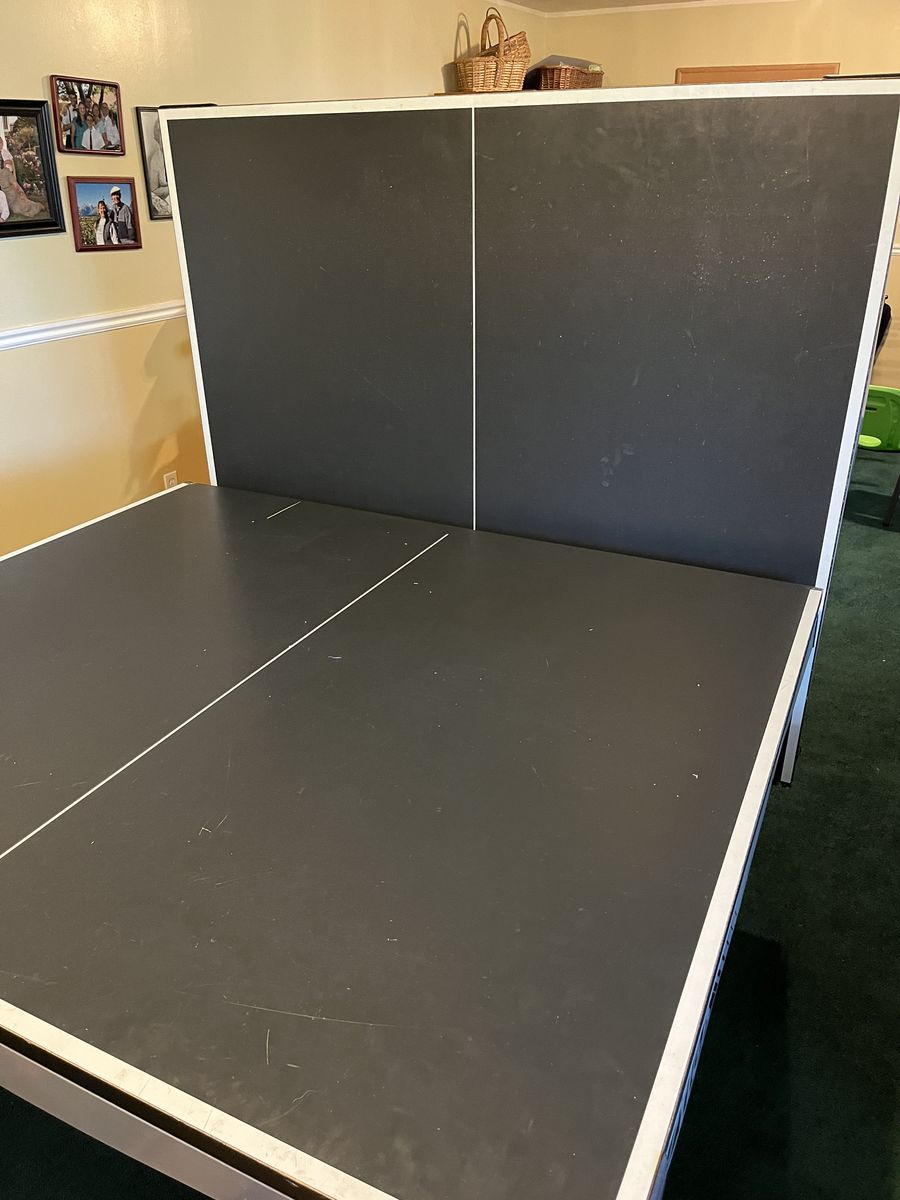 Includes net, paddles, and balls, so it is ready to play. Folds for storage and playback position. Surface has normal cosmetic wear from use, including scratches/scuffs and one more noticeable scratch near the net area, but table is solid and fully usable. Great for a basement or game room.