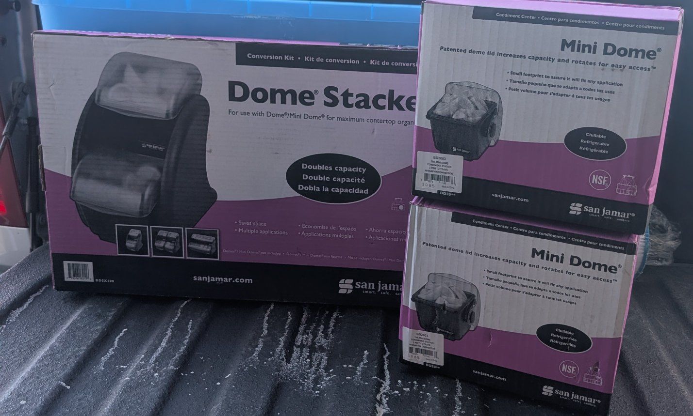 VenmoTwo Brand new San Jamar Mini Dome 2 Pint 2 Tray Condiment stations with lids and the conversion condiment station stacker so you can put one on top of the other making it the perfect 4 tray counter top condiment station. All brand new in the box. Retails for over $150. Asking $95. Text if interested 801-903-8337