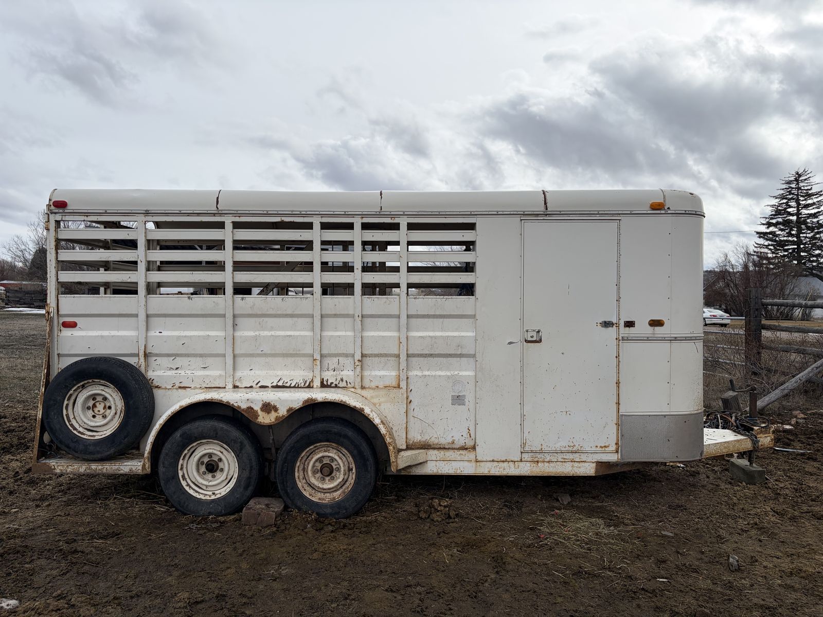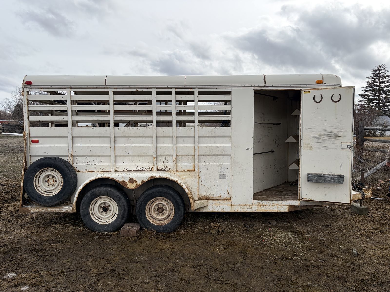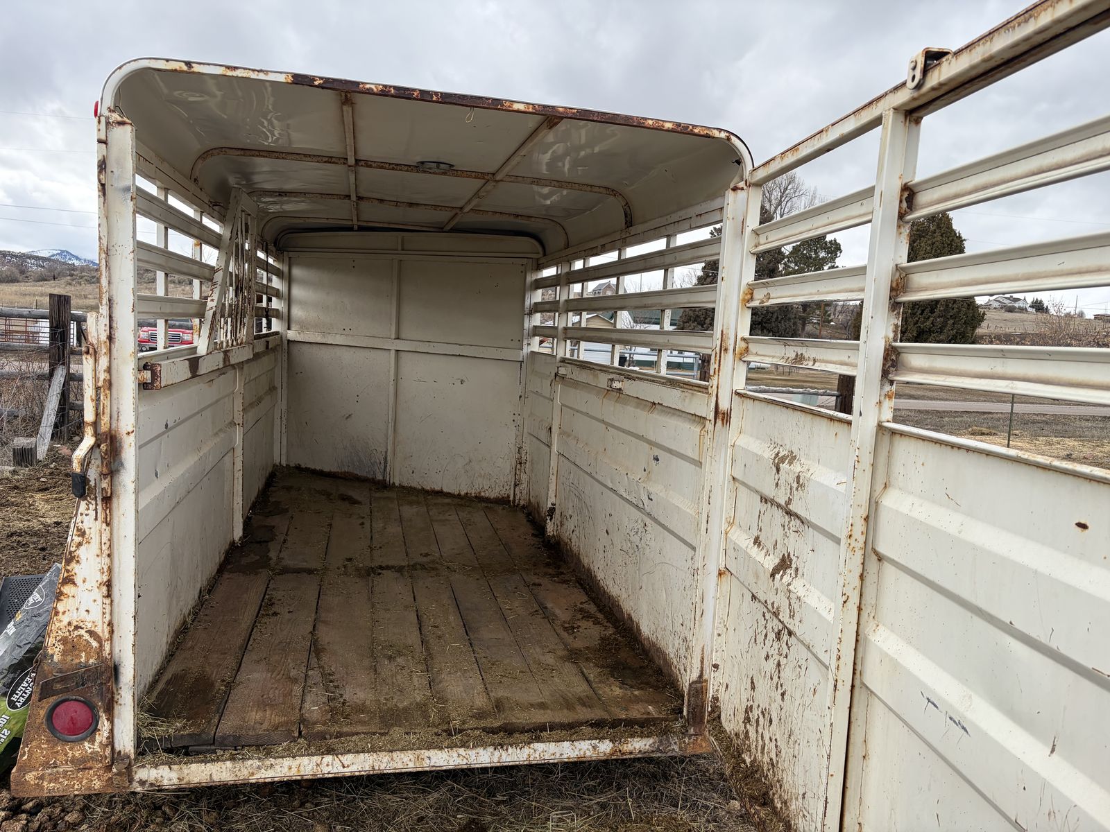 She’s got some rusted through spots, I have the second slant that goes in the front it’s just not pictured the horses we hauled were too big for both slants to be in there. It does have 1 cracked floor board that needs replaced and the holder for the tack room to be held open needs replaced. Lights work for it on our vehicles, we did have to rewire it after we got it so it may need redone to your vehicle but as it stands it works, it does have floor mats that come with it i pulled them out to clean it and get pictures. I have fit 16/17 hand horses in this trailer with two smaller end horses in it and never had an issue with it pulling.