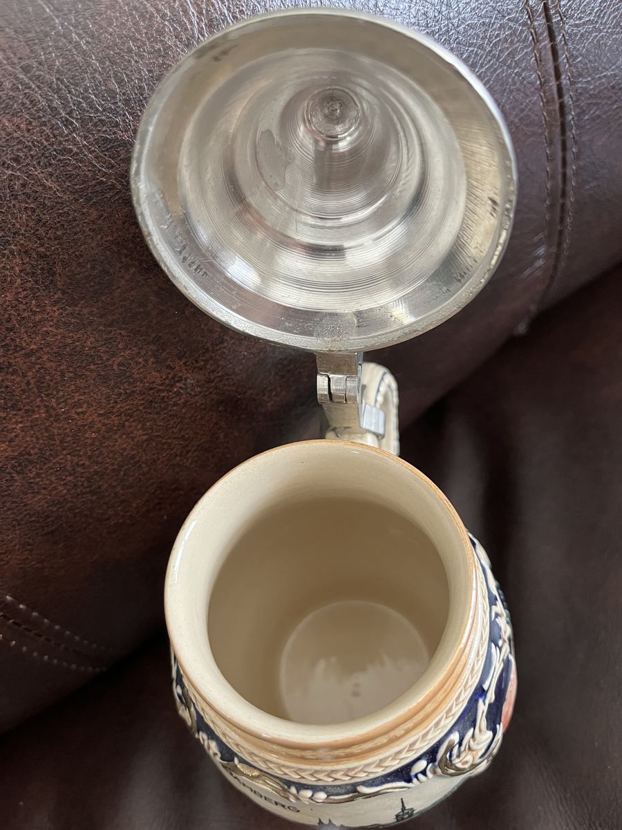 VenmoThis is in excellent condition. It appears to be hand painted. There are three village scenes on it. The large scene is marked 'Bamberg.' The colors are vibrant. It has an ornate pewter top. This was bought in the 1950's to 1960's. There are only numbers on the bottom and a potters mark. It is 6 1/2 inches tall x 4 1/2 inches. Must see.