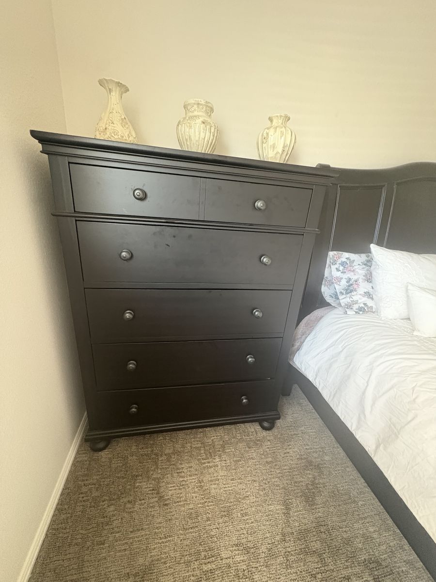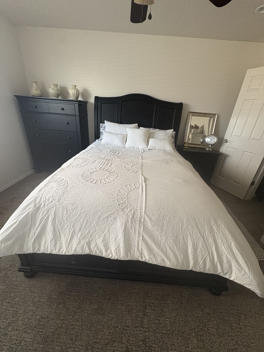 3-piece solid wood black bedroom set. It has a Queen size, bed frame with two built-in drawers. Semi new and classic style with a lot of storage space.