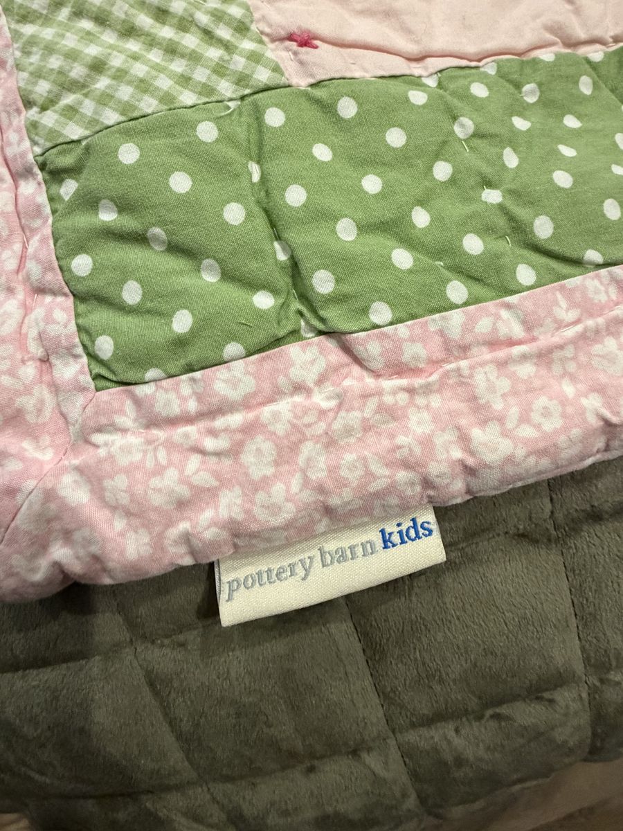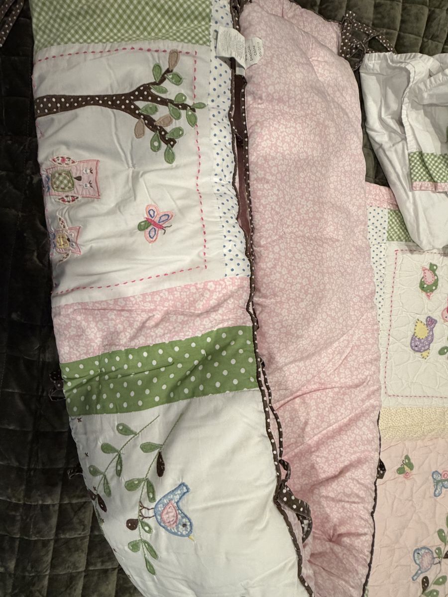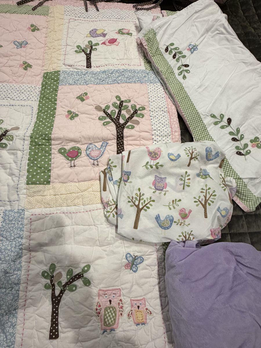 ApplePayAdorable lavender and green with pink accents! Includes quilt, 2 sheets (one with pattern and other purple minky like), and bumper.