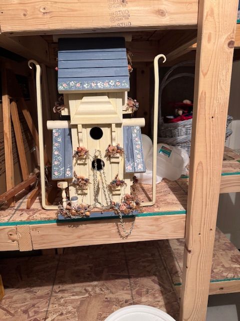 A handmade decorative birdhouse sculpture (painted wood, artificial flowers, chains, folk-art style). Carolee Seward Floral Sanctuary – Large Decorative Garden House.”
