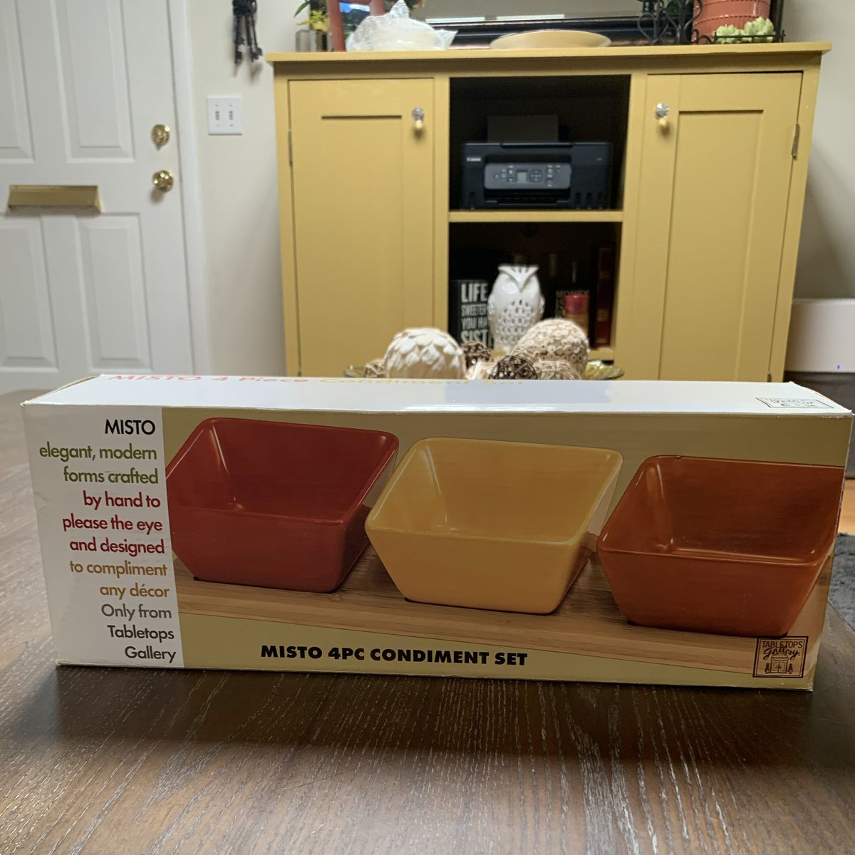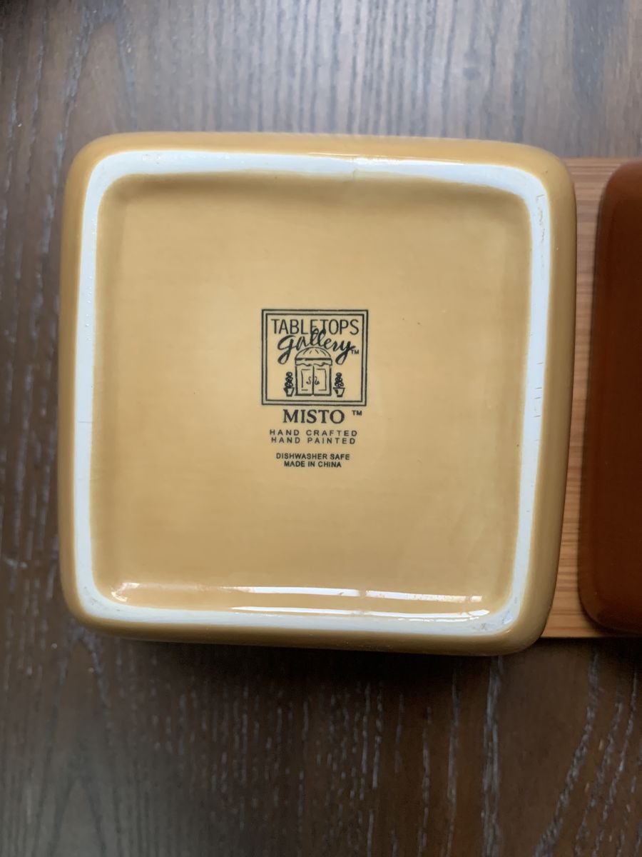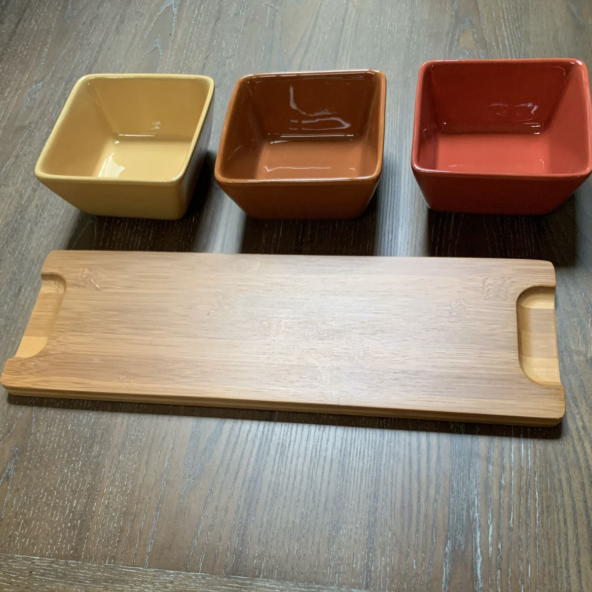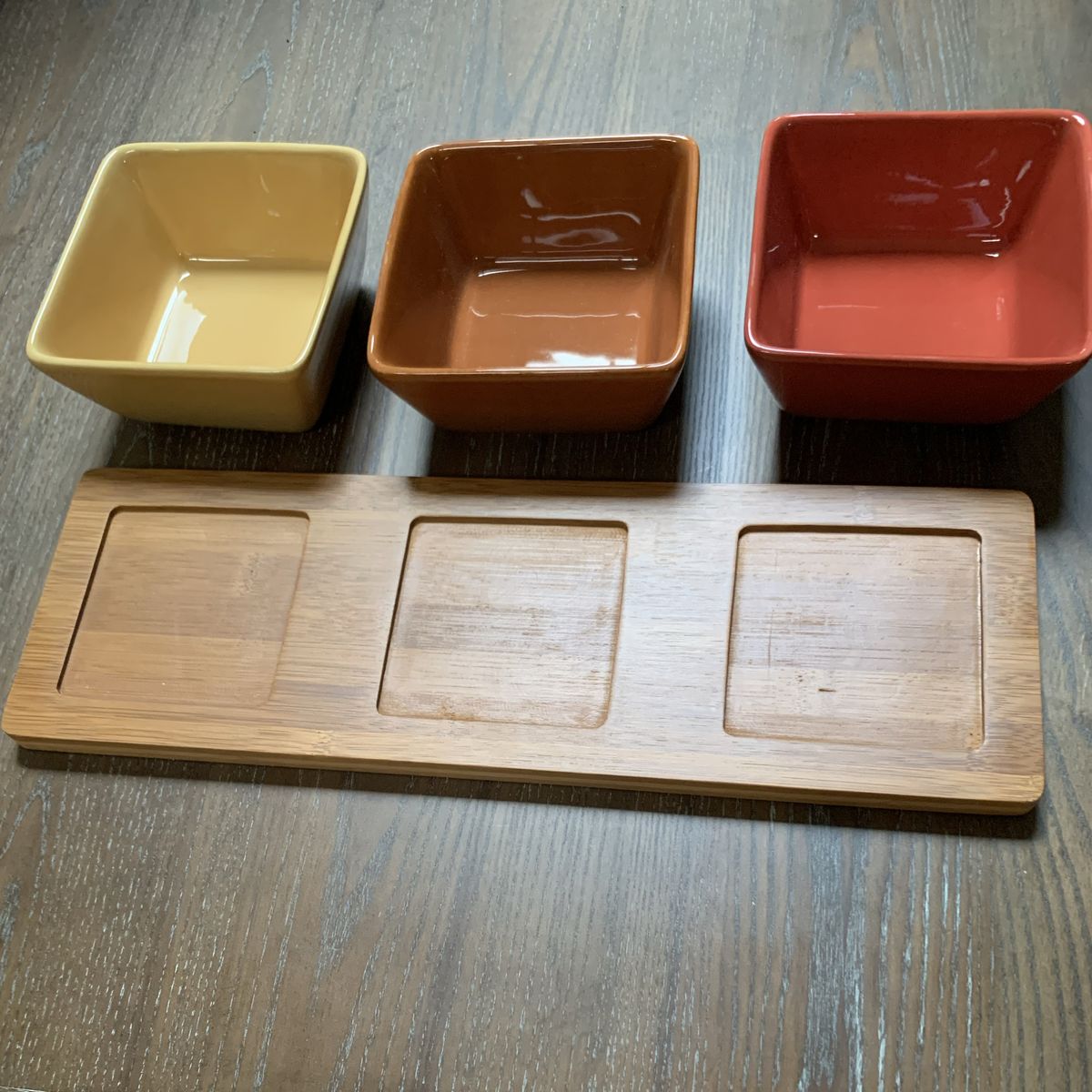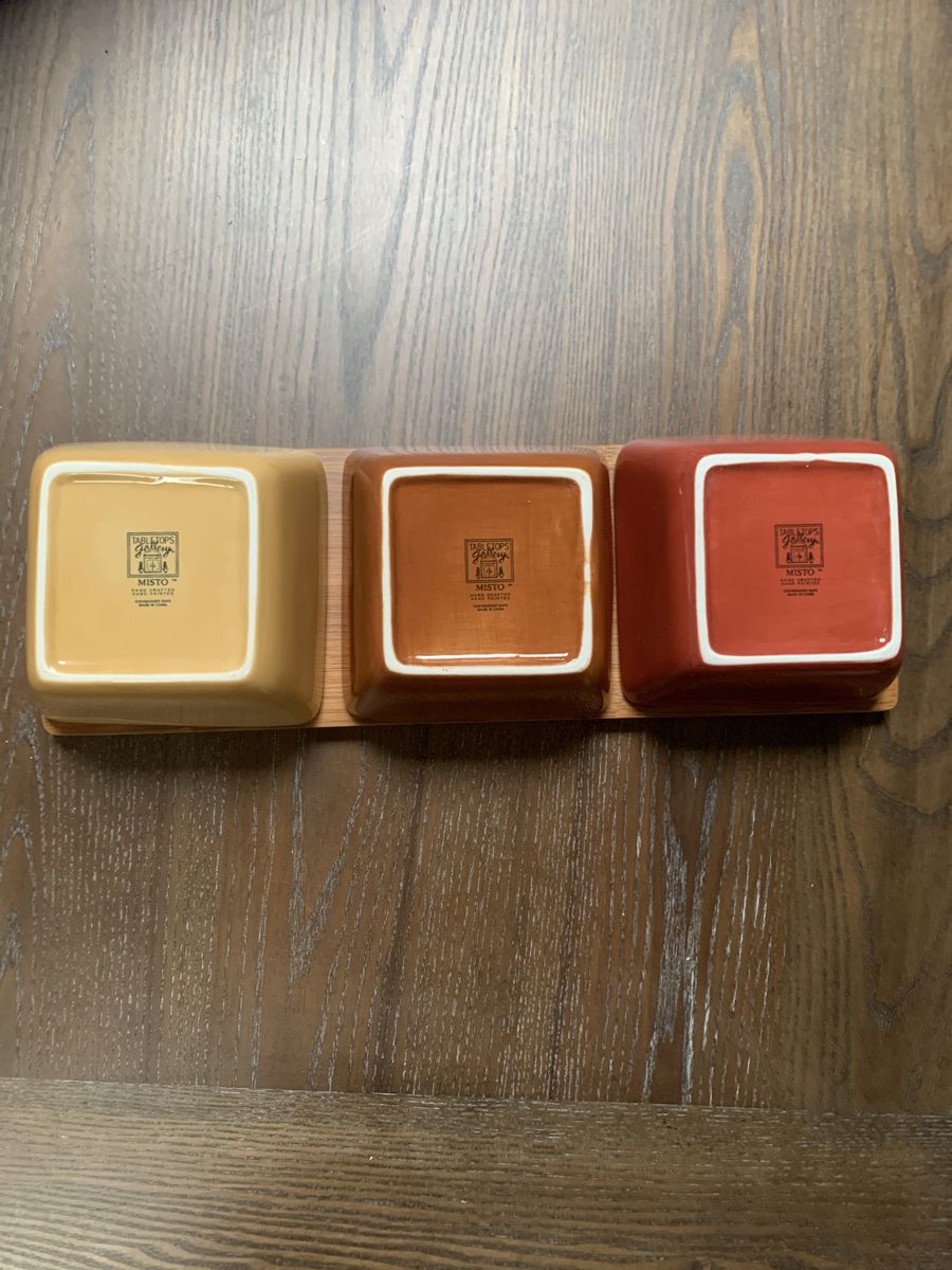 VenmoBeautiful ceramic squared bowls start wide and taper in. Also a bamboo tray with hand holds on each end. And the best thing is, it spins! Bowls 5”W x 2 1/2”H. Tray is 16”L x 5”W. Venmo or Cash. Hold with Venmo. Non-smoking/No pet home