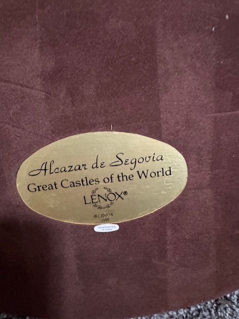 This collectible model features finely sculpted architectural details of the famous fortress complex including defensive walls, towers, and the central keep. The piece sits on a polished wood display base with the original Lenox identification plaque on the underside.