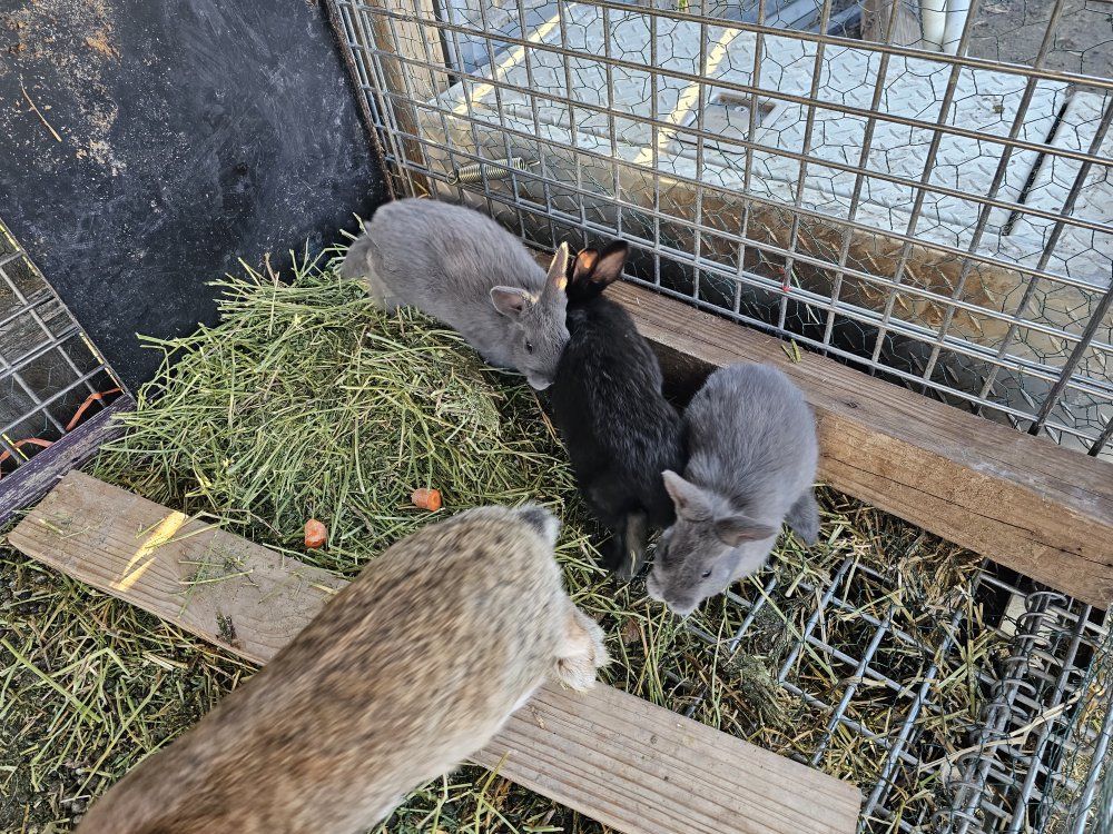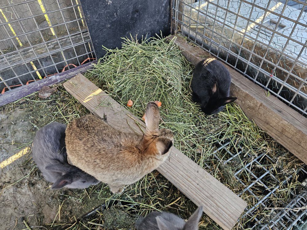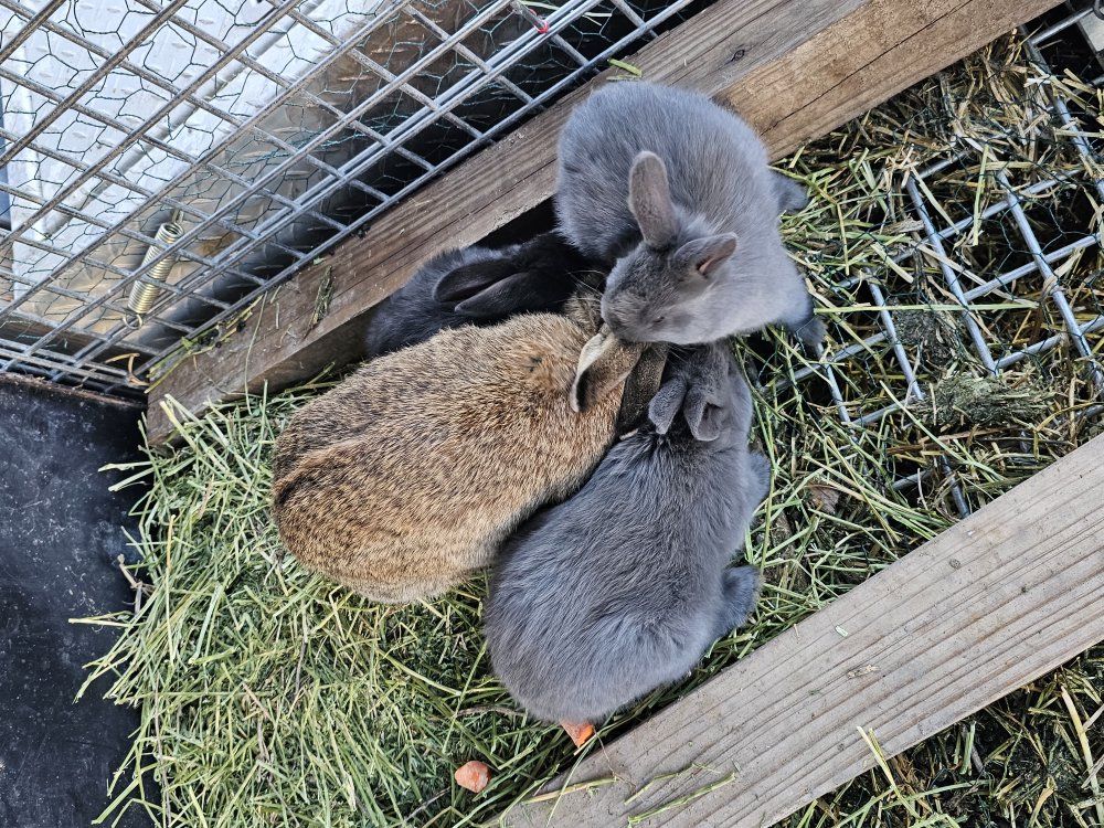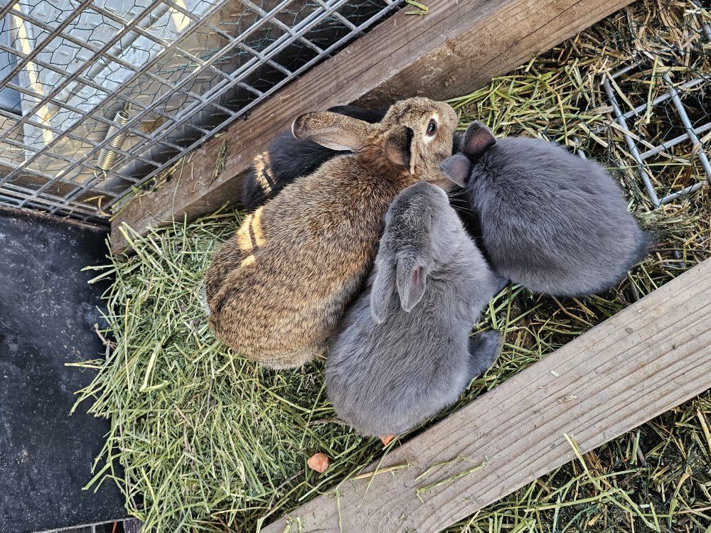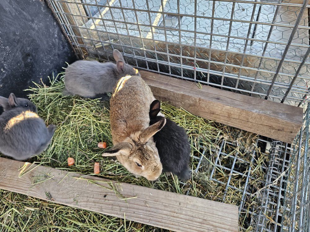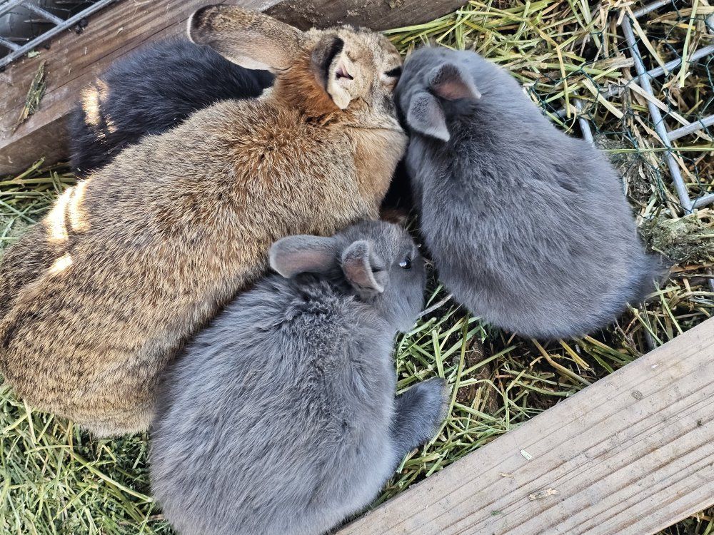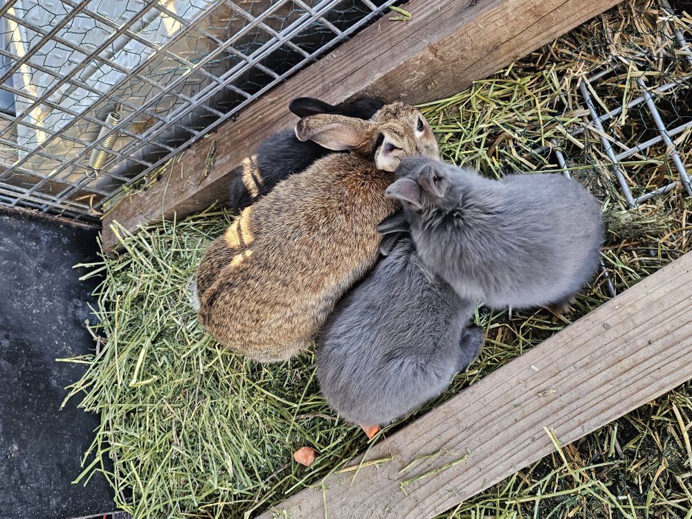 Female rabbit with three babies—they are a mix of New Zealand and Silver Fox.